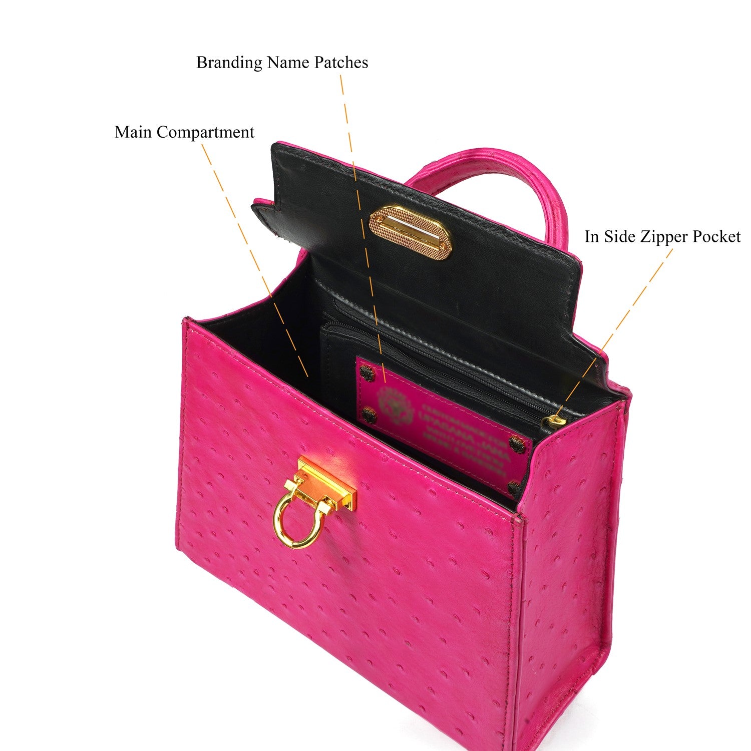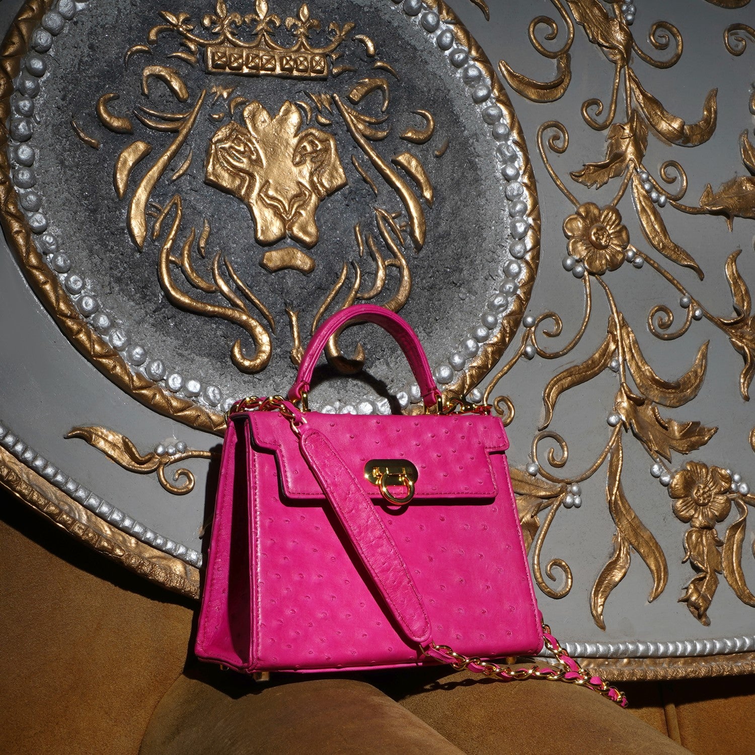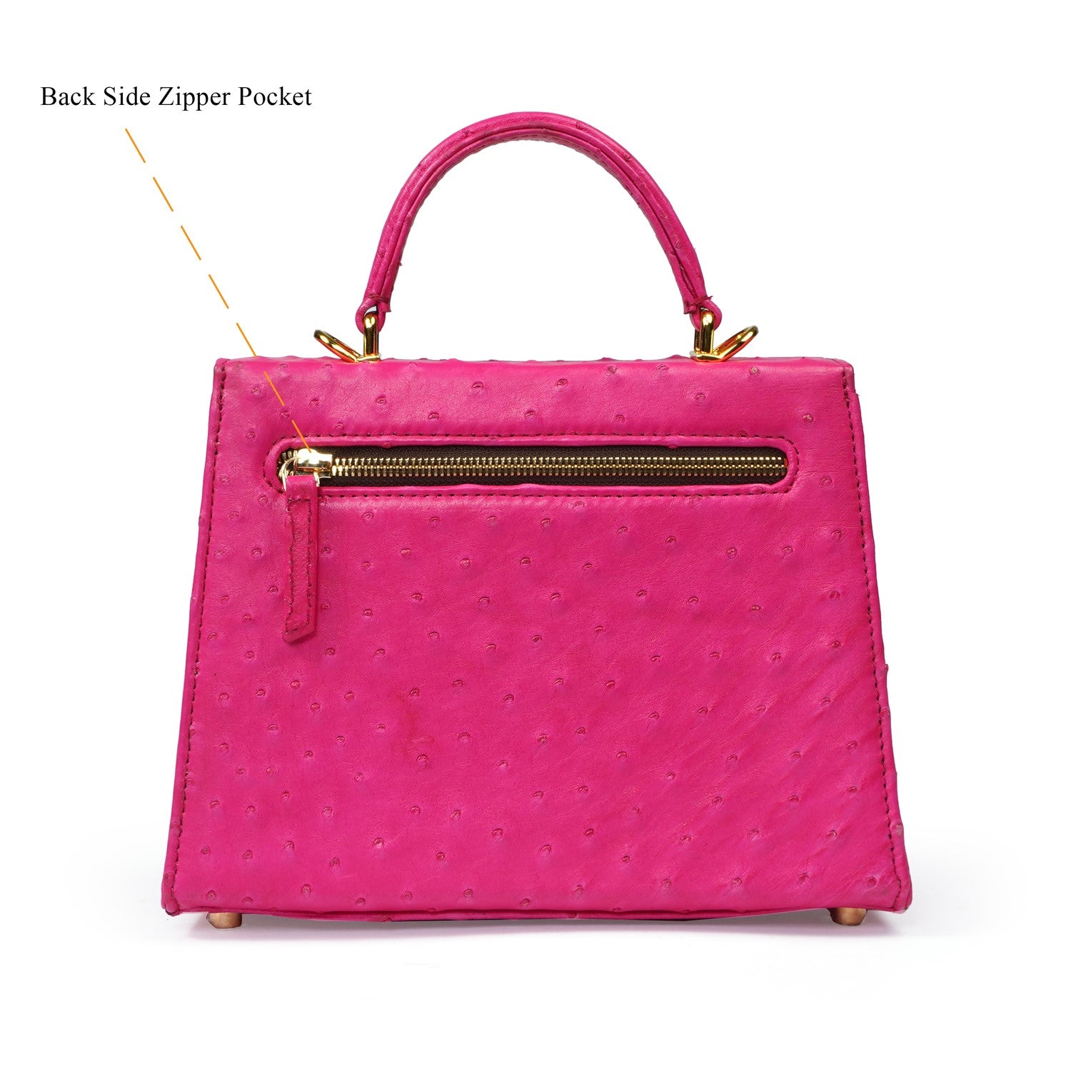 Crafted in genuine ostrich leather, this handbag features a curved leather handle for a comfortable hold and comes with a detachable leather-interwoven shoulder chain, allowing it to be carried as a handbag or crossbody with ease.
