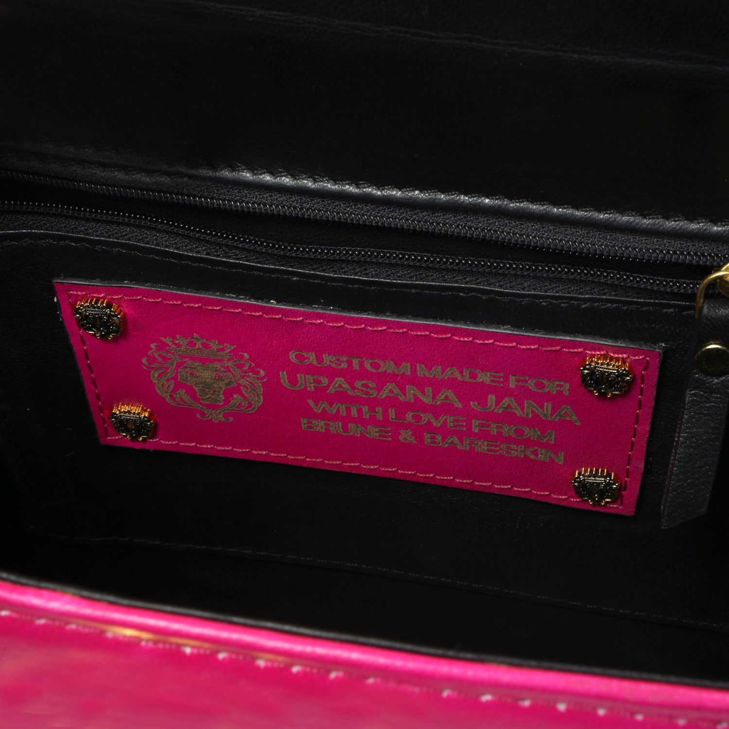 The design includes a secure metal clasp turn-lock on the front and a back side zipper pocket for quick-access essentials. Inside, the bag offers a spacious main compartment with an inside zipper pocket and branding name patches, keeping your belongings organized in style. The gold D-ring buckle and dog hook hardware add a refined luxury finish, while the rivet studs at the base help protect the leather and maintain the bag’s shape. A perfect blend of elegance, craftsmanship, and everyday practicality.