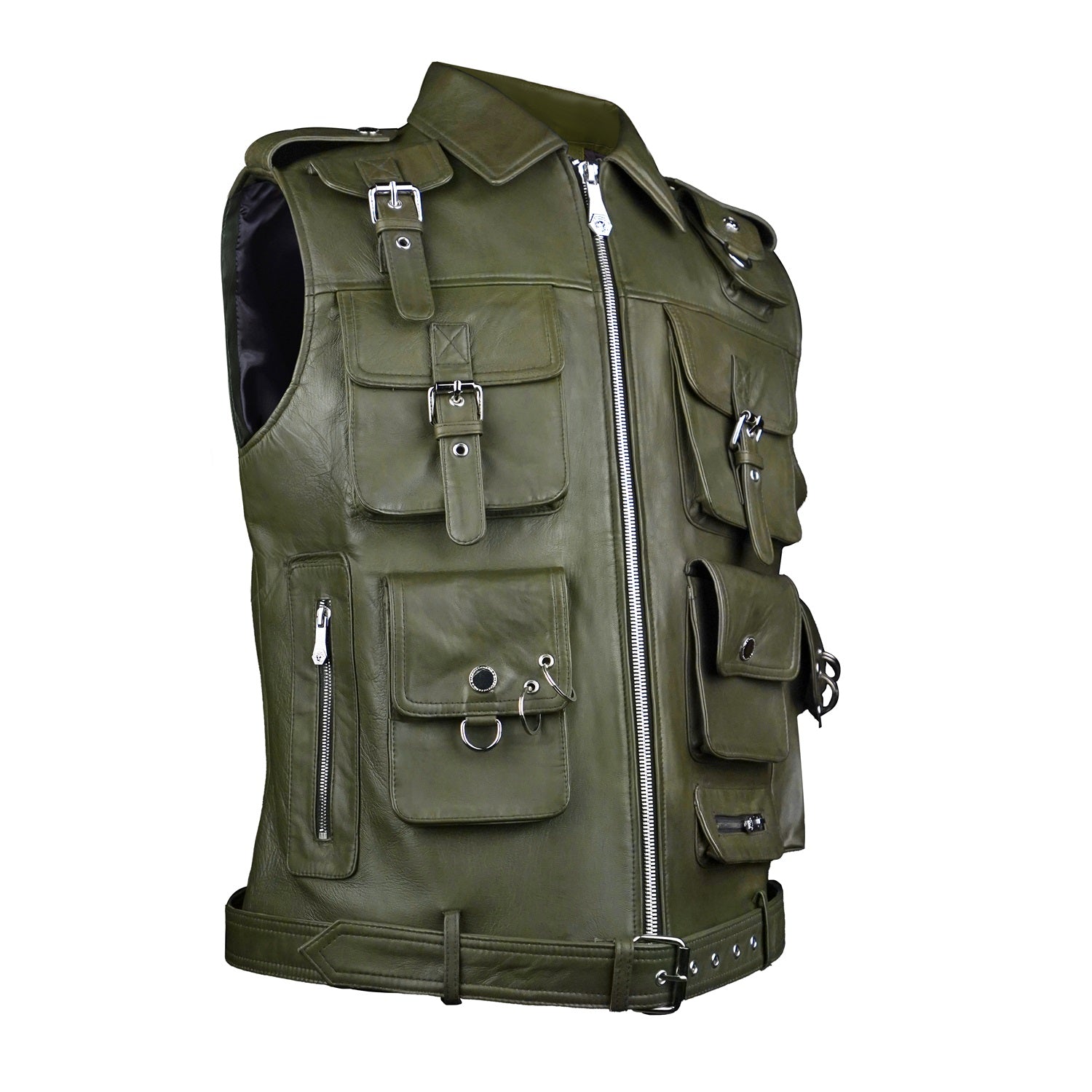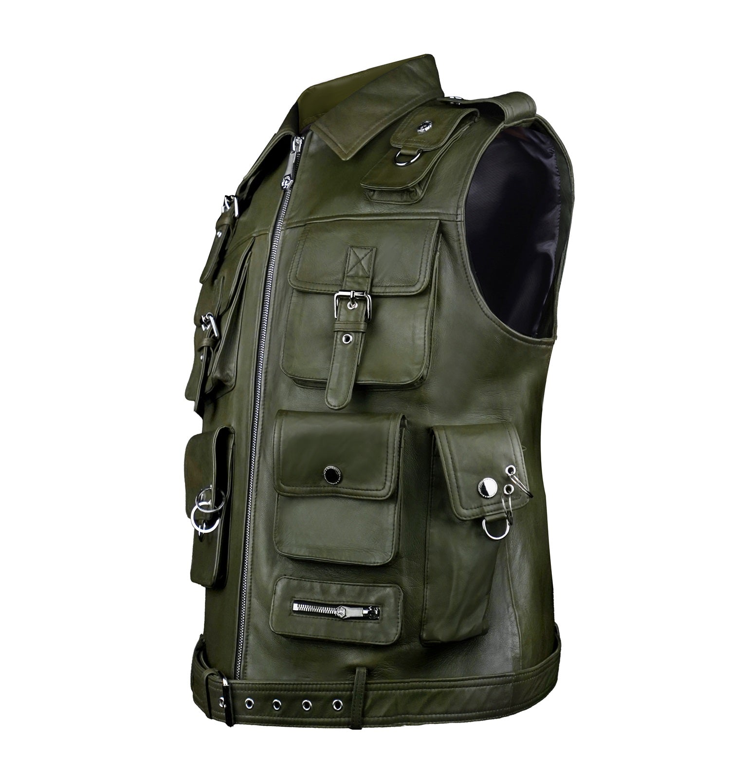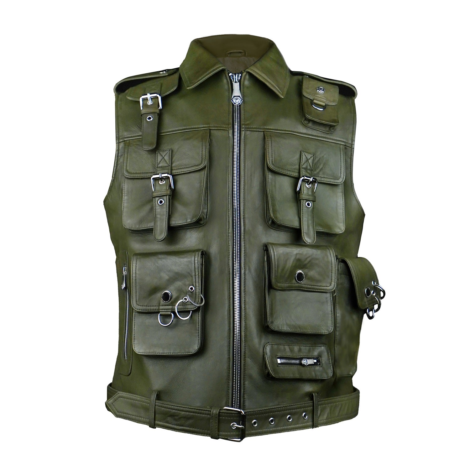 Crafted from premium olive green leather, this utility vest combines bold design with everyday functionality. Featuring multiple flap and zip pockets, it offers ample storage while adding a rugged, tactical edge. The front zip closure ensures ease of wear, while the adjustable belted hem provides a customized fit.