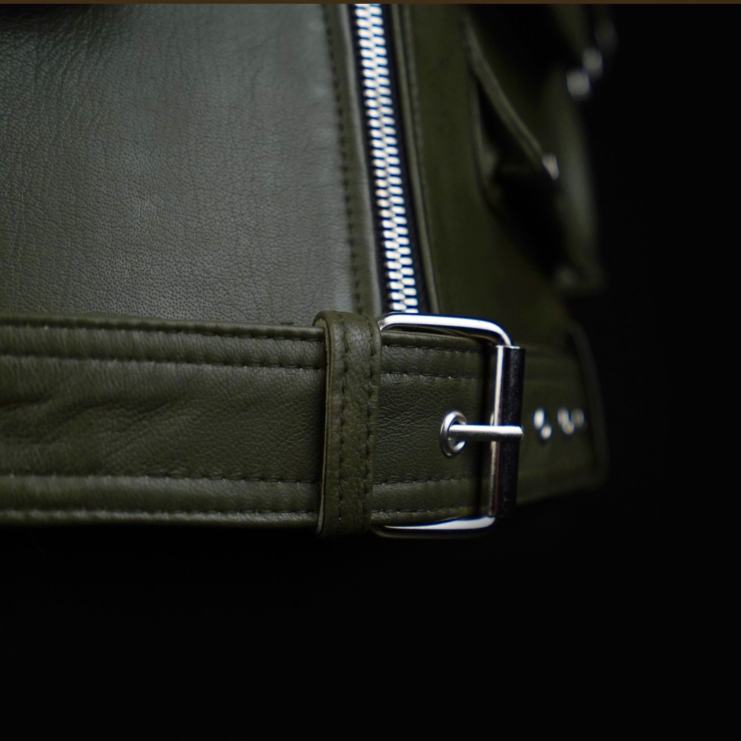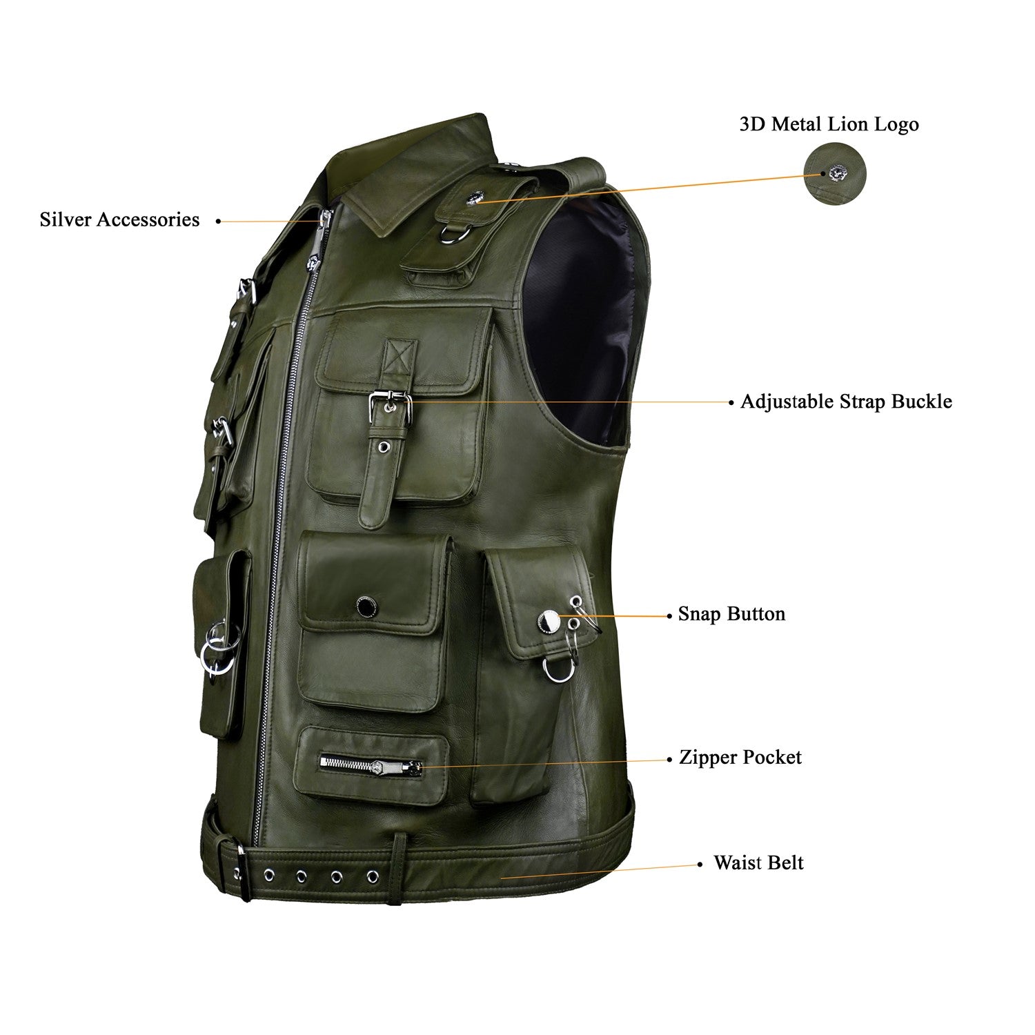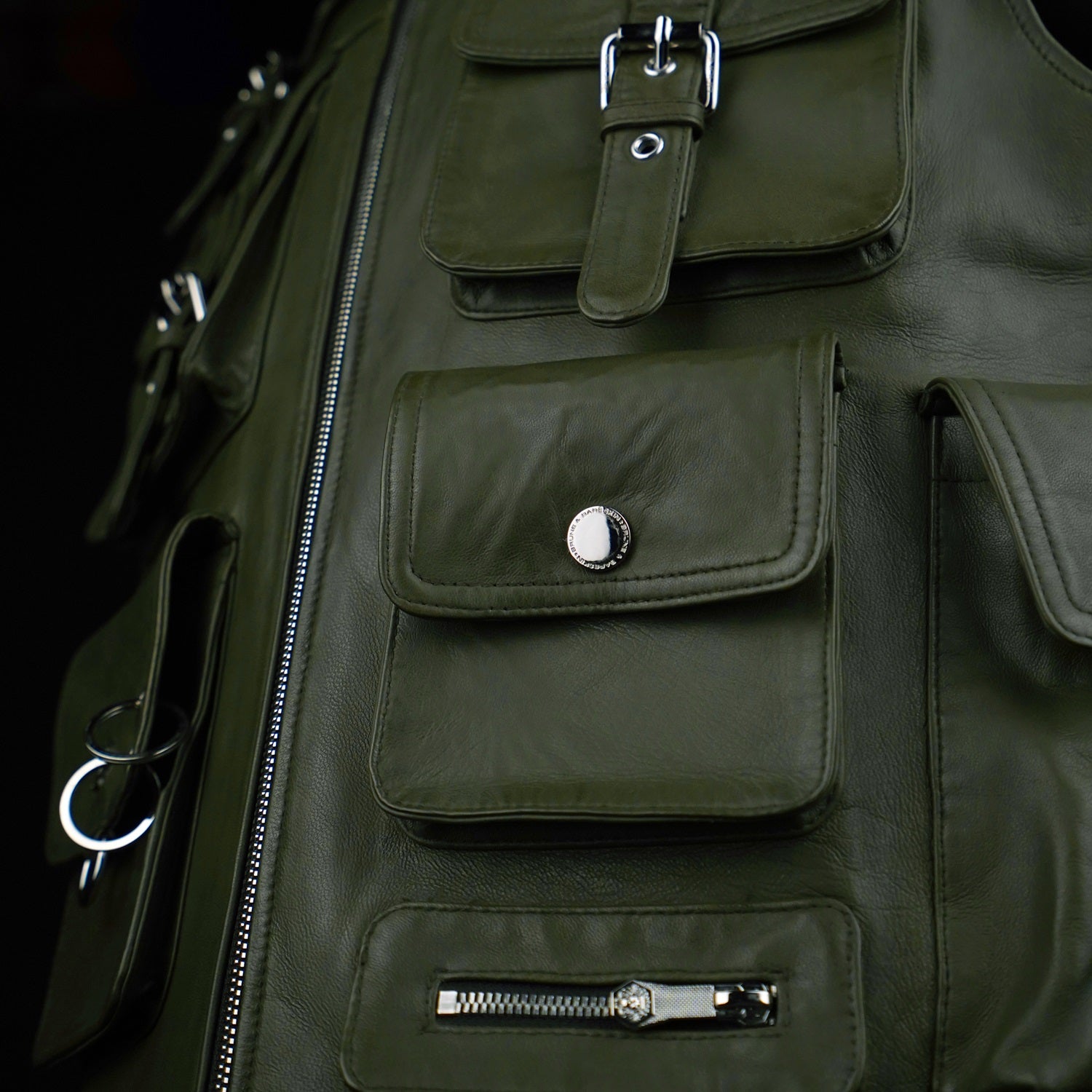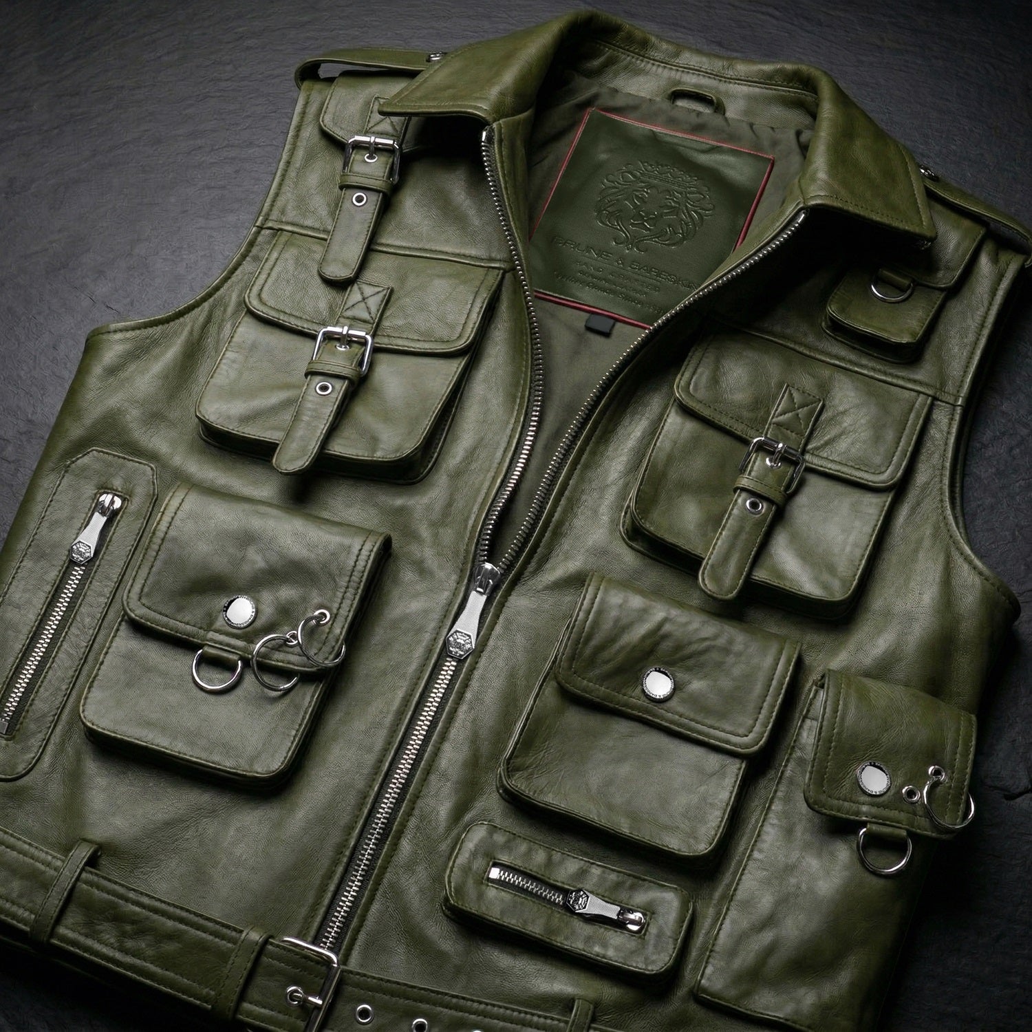 Crafted from premium olive green leather, this utility vest combines bold design with everyday functionality. Featuring multiple flap and zip pockets, it offers ample storage while adding a rugged, tactical edge. The front zip closure ensures ease of wear, while the adjustable belted hem provides a customized fit.