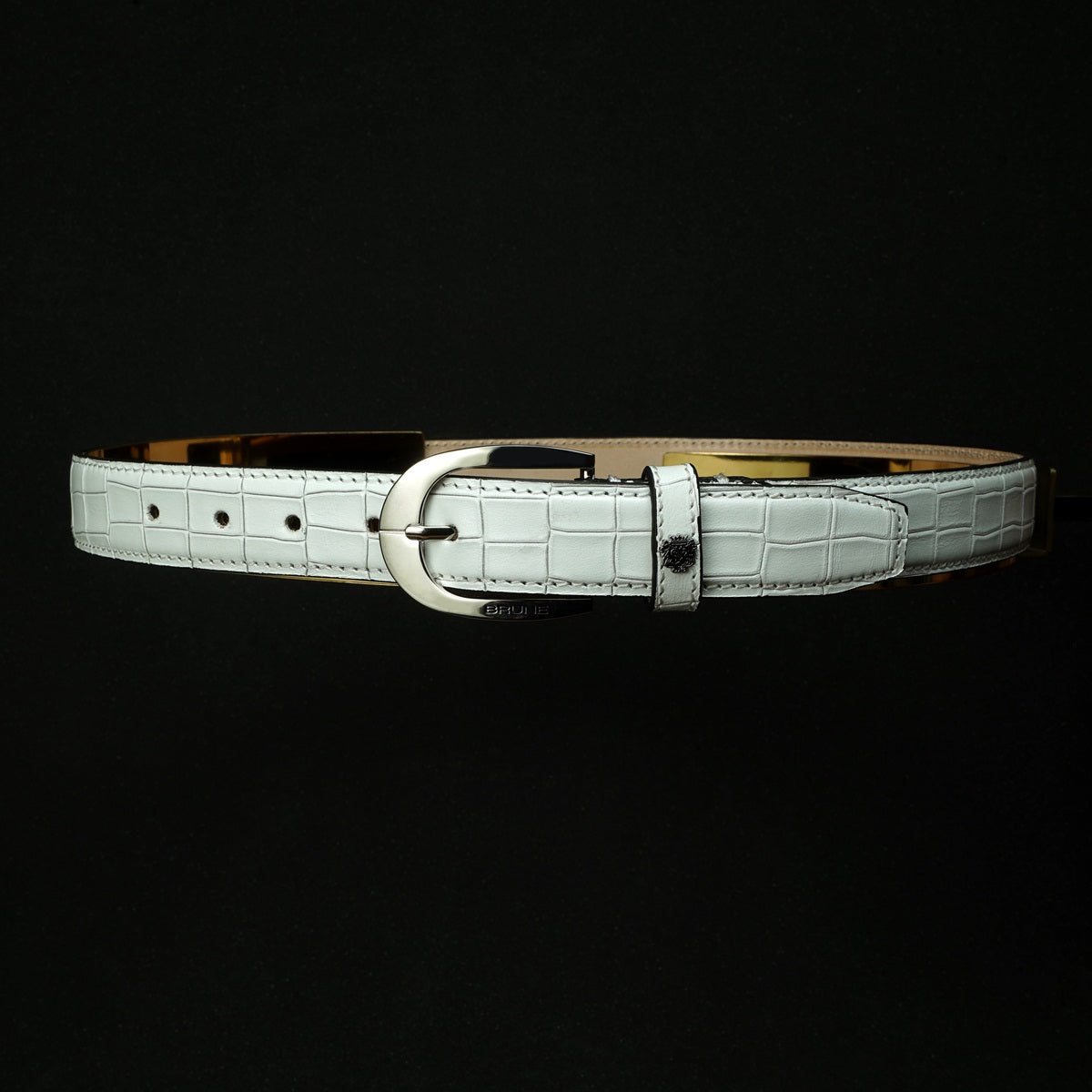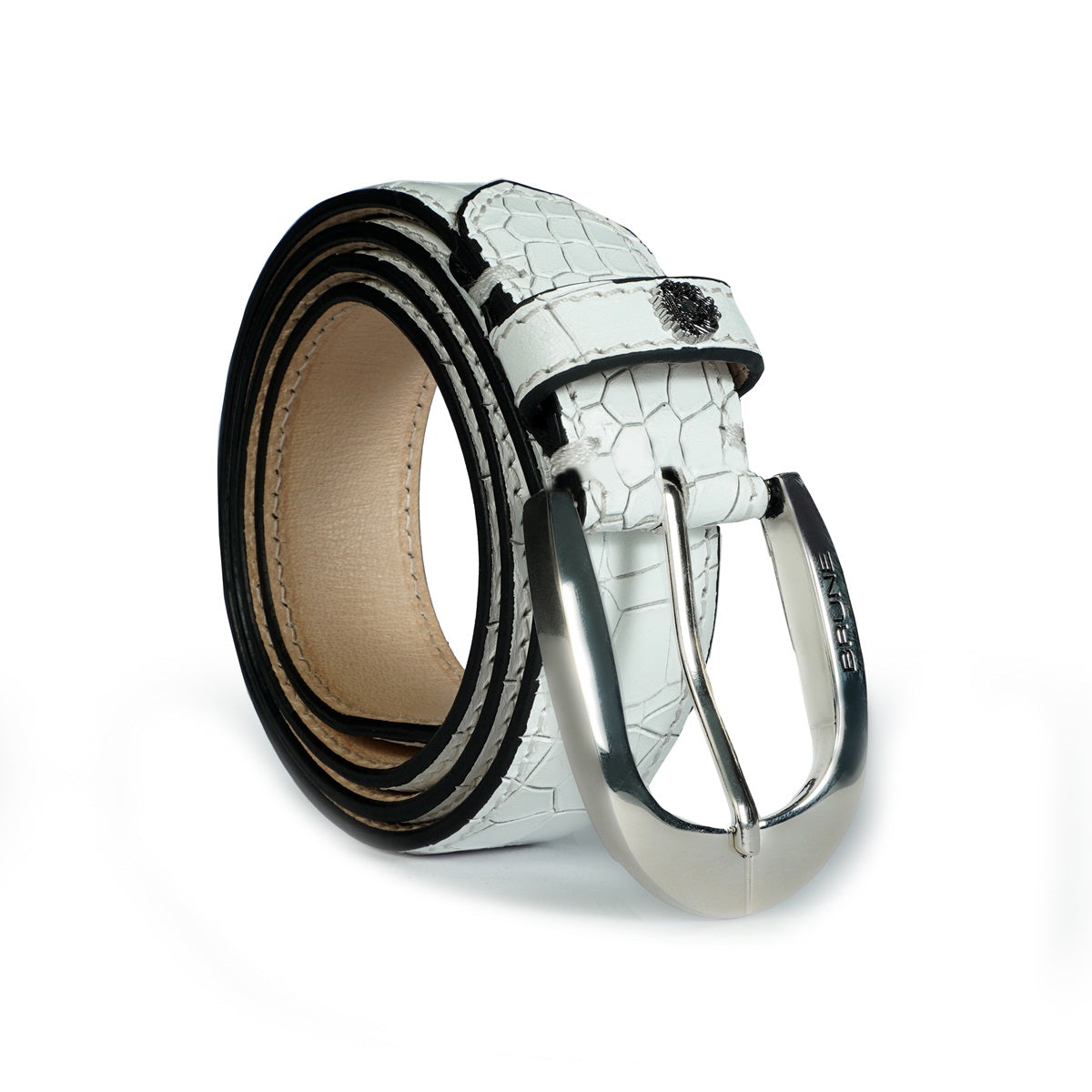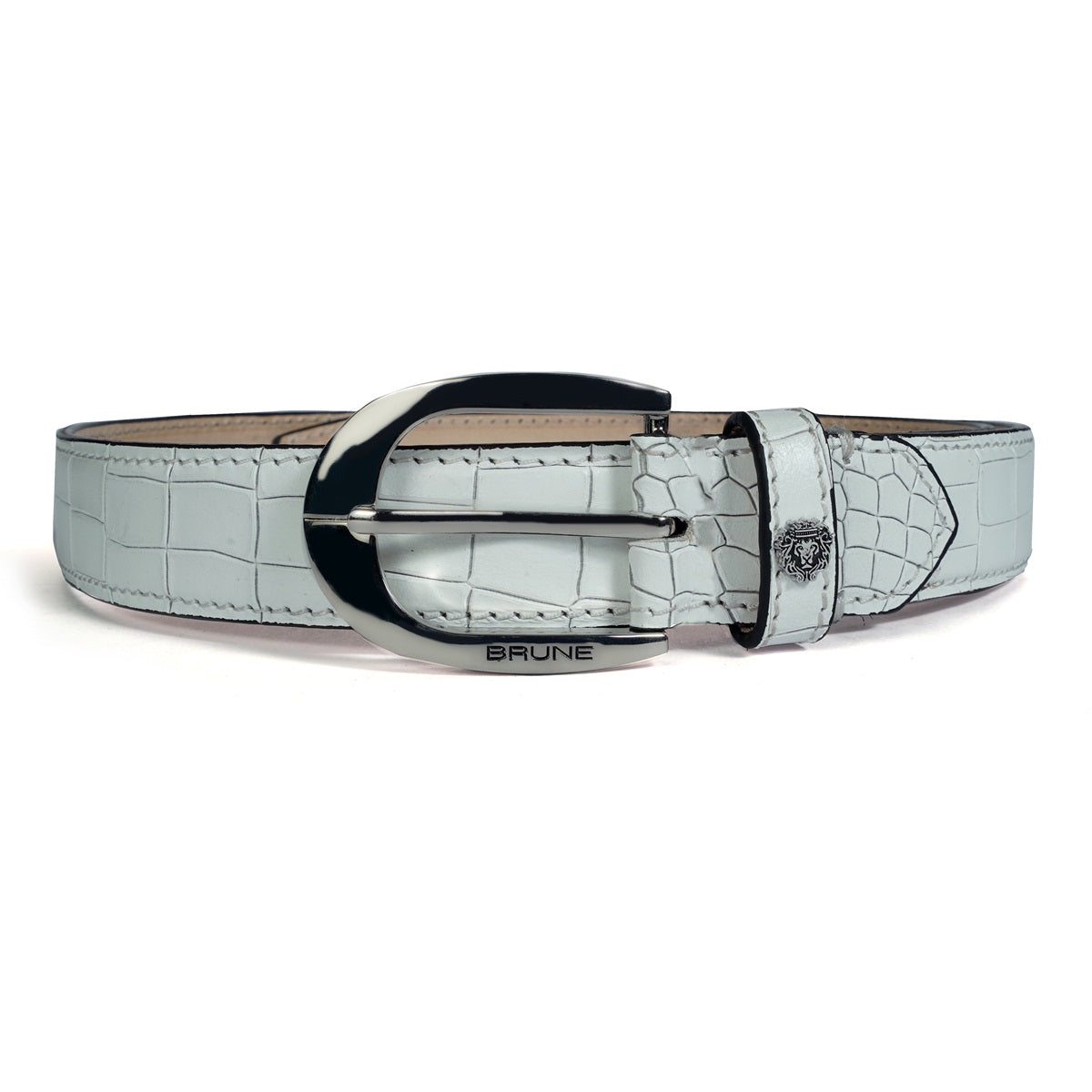 Introducing the embodiment of refined masculinity – the men's belt in white deep-cut croco textured leather, a masterful creation by the renowned artisans at Brune & Bareskin. This belt is a harmonious fusion of contemporary design and timeless craftsmanship, exuding an aura of sophistication that complements the discerning modern gentleman. The silver oval-shaped buckle, the focal point of this masterpiece, is a testament to Brune & Bareskin dedication to elegance. the stylish silver mini lion logo delicately placed on the loop captures attention without overpowering the belt's overall aesthetic. Every step in securing this belt around your waist is a reminder of its unparalleled craftsmanship. Handcrafted with precision, it epitomizes the marriage of traditional artistry and contemporary design sensibilities. This belt isn't just an accessory; it's an extension of your personality, a subtle declaration of your taste for the extraordinary.