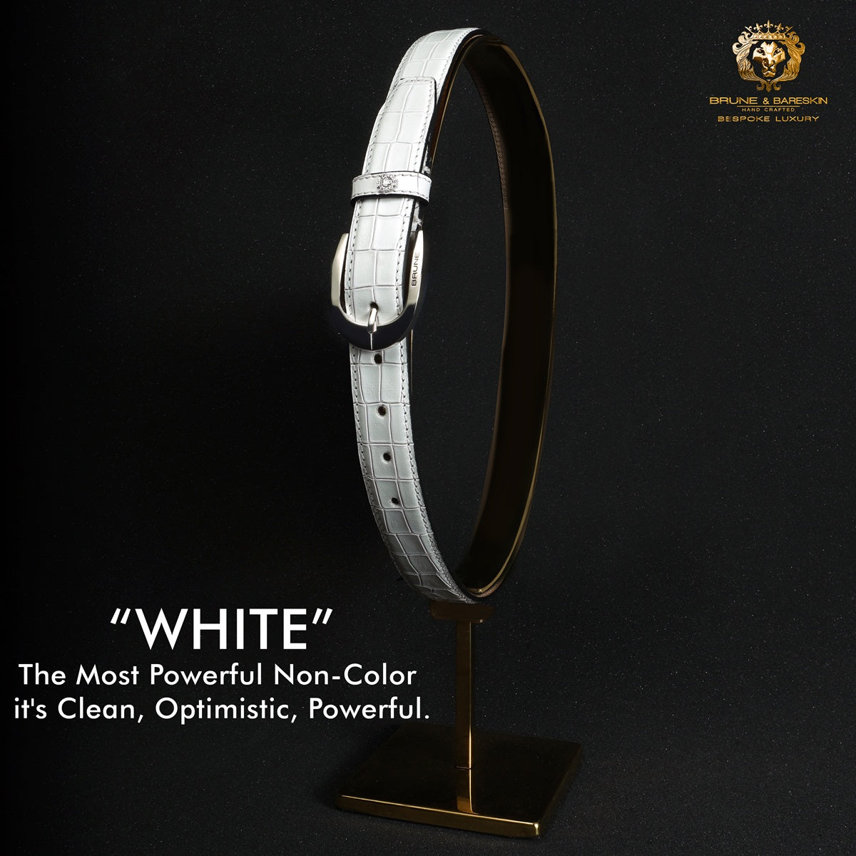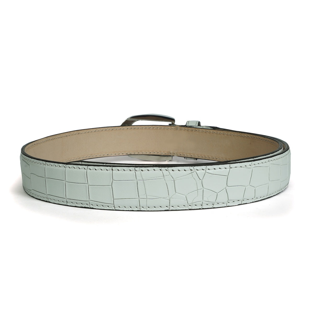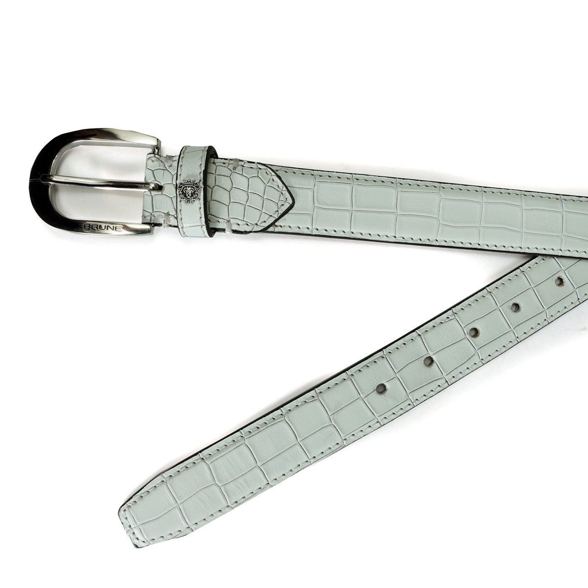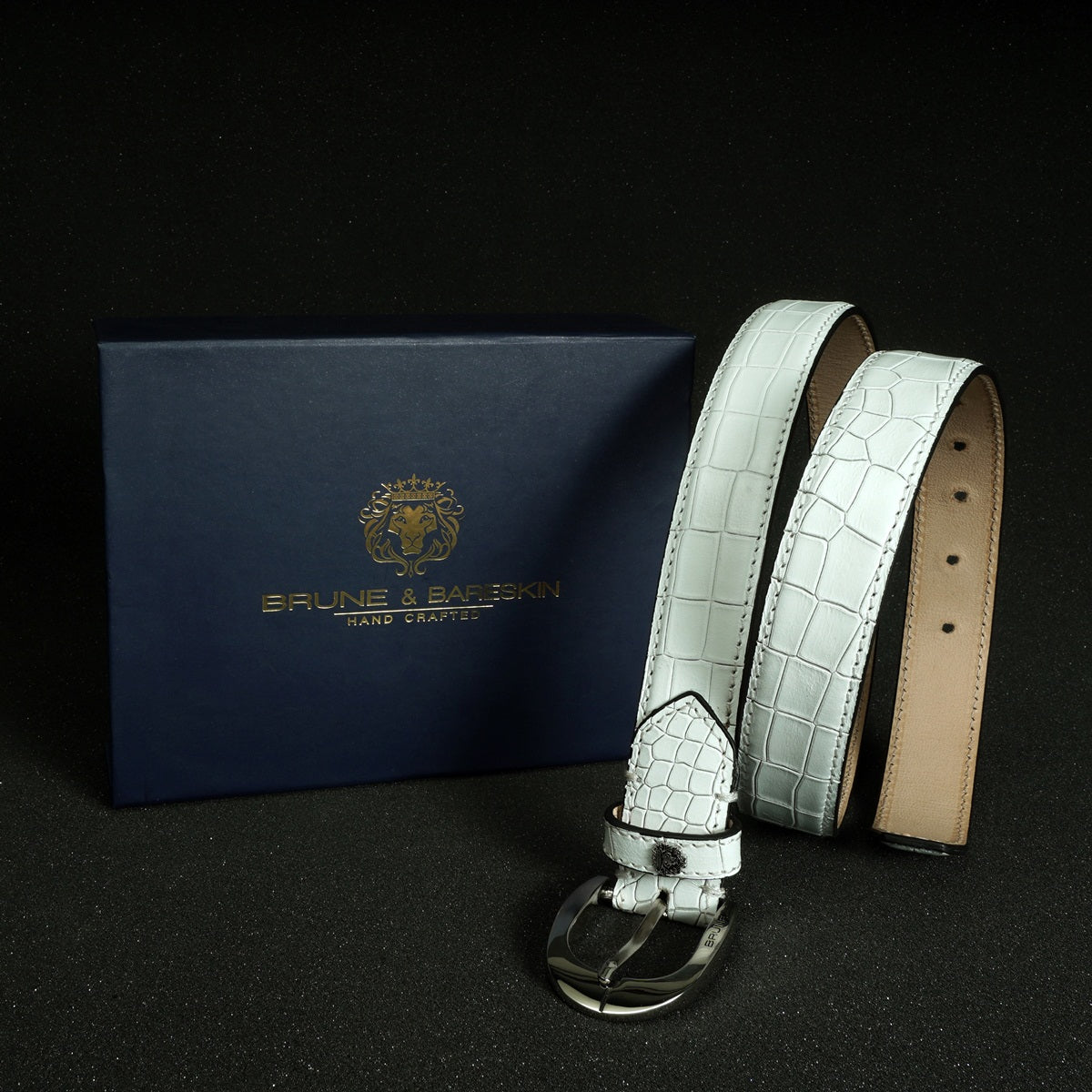 Introducing the embodiment of refined masculinity – the men's belt in white deep-cut croco textured leather, a masterful creation by the renowned artisans at Brune & Bareskin. This belt is a harmonious fusion of contemporary design and timeless craftsmanship, exuding an aura of sophistication that complements the discerning modern gentleman. The silver oval-shaped buckle, the focal point of this masterpiece, is a testament to Brune & Bareskin dedication to elegance. the stylish silver mini lion logo delicately placed on the loop captures attention without overpowering the belt's overall aesthetic. Every step in securing this belt around your waist is a reminder of its unparalleled craftsmanship. Handcrafted with precision, it epitomizes the marriage of traditional artistry and contemporary design sensibilities. This belt isn't just an accessory; it's an extension of your personality, a subtle declaration of your taste for the extraordinary.