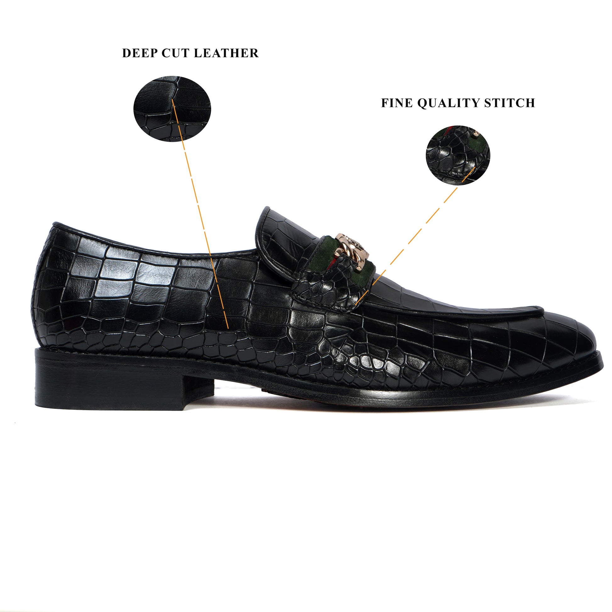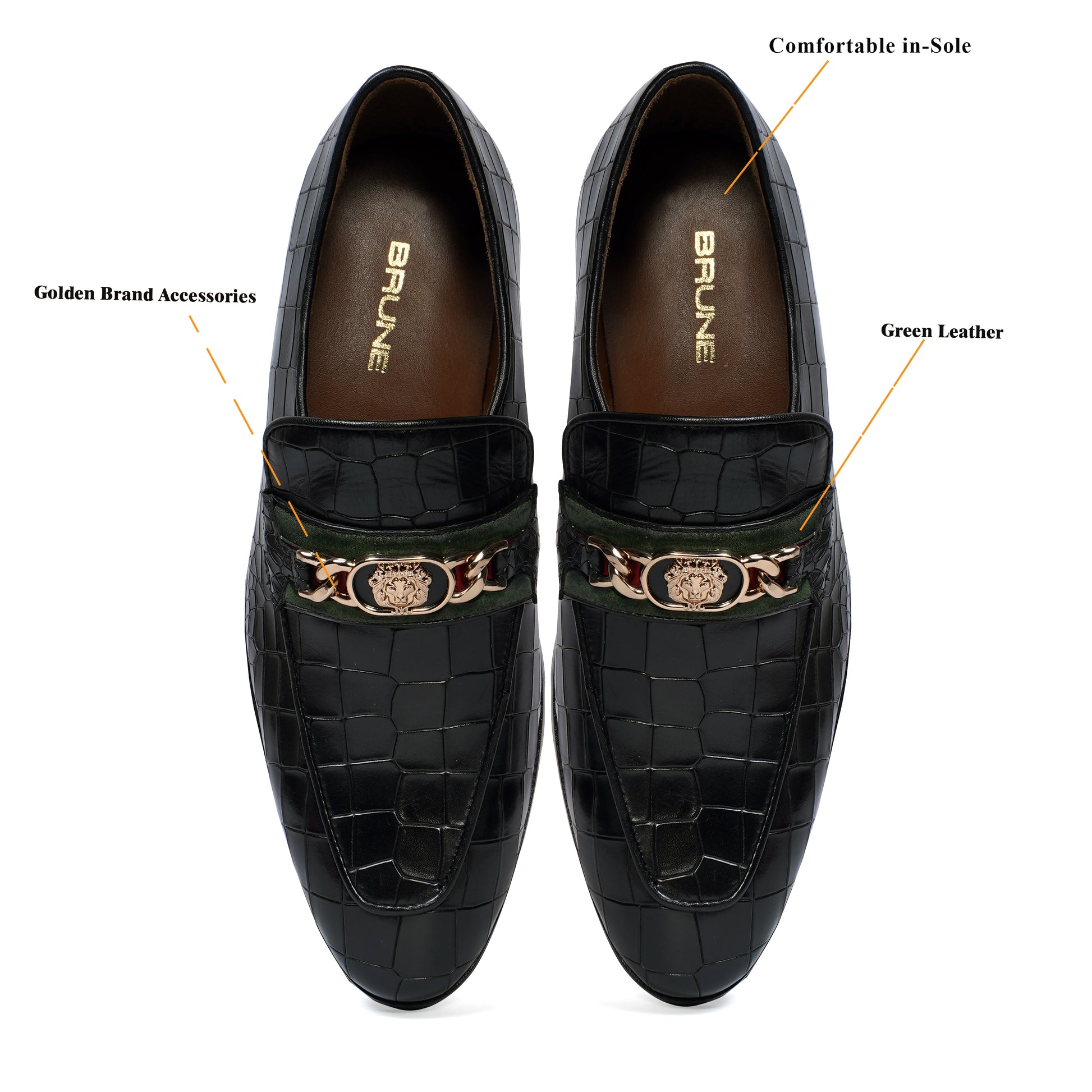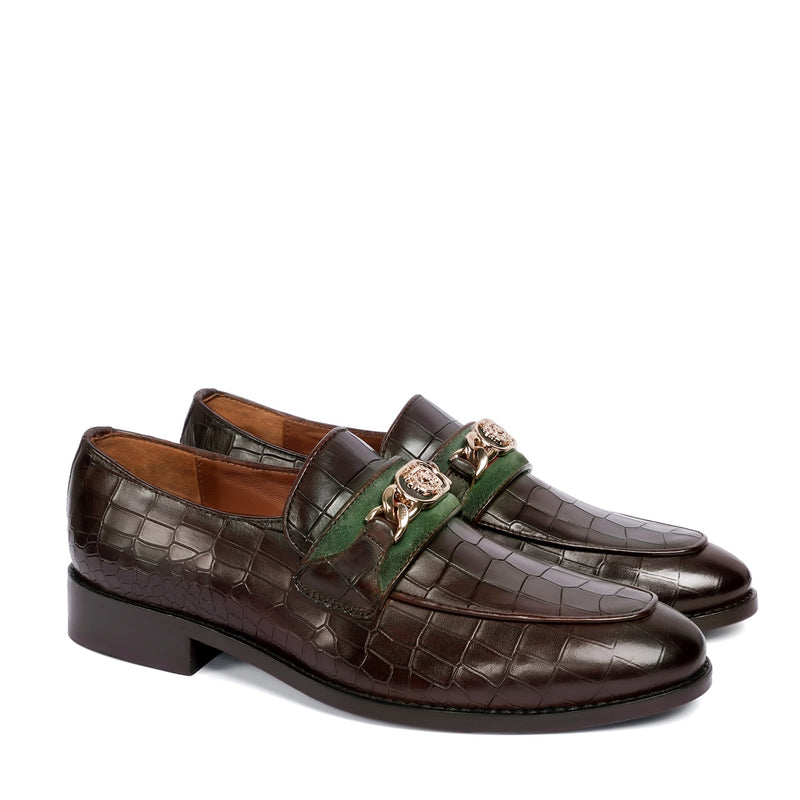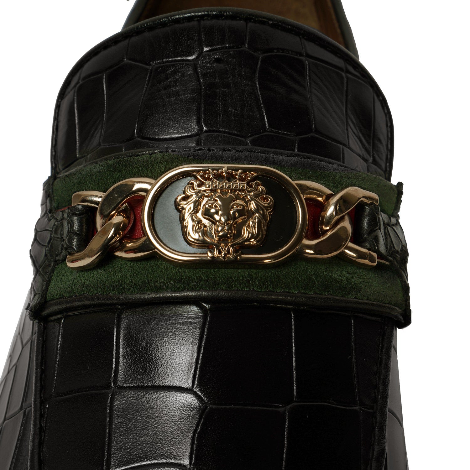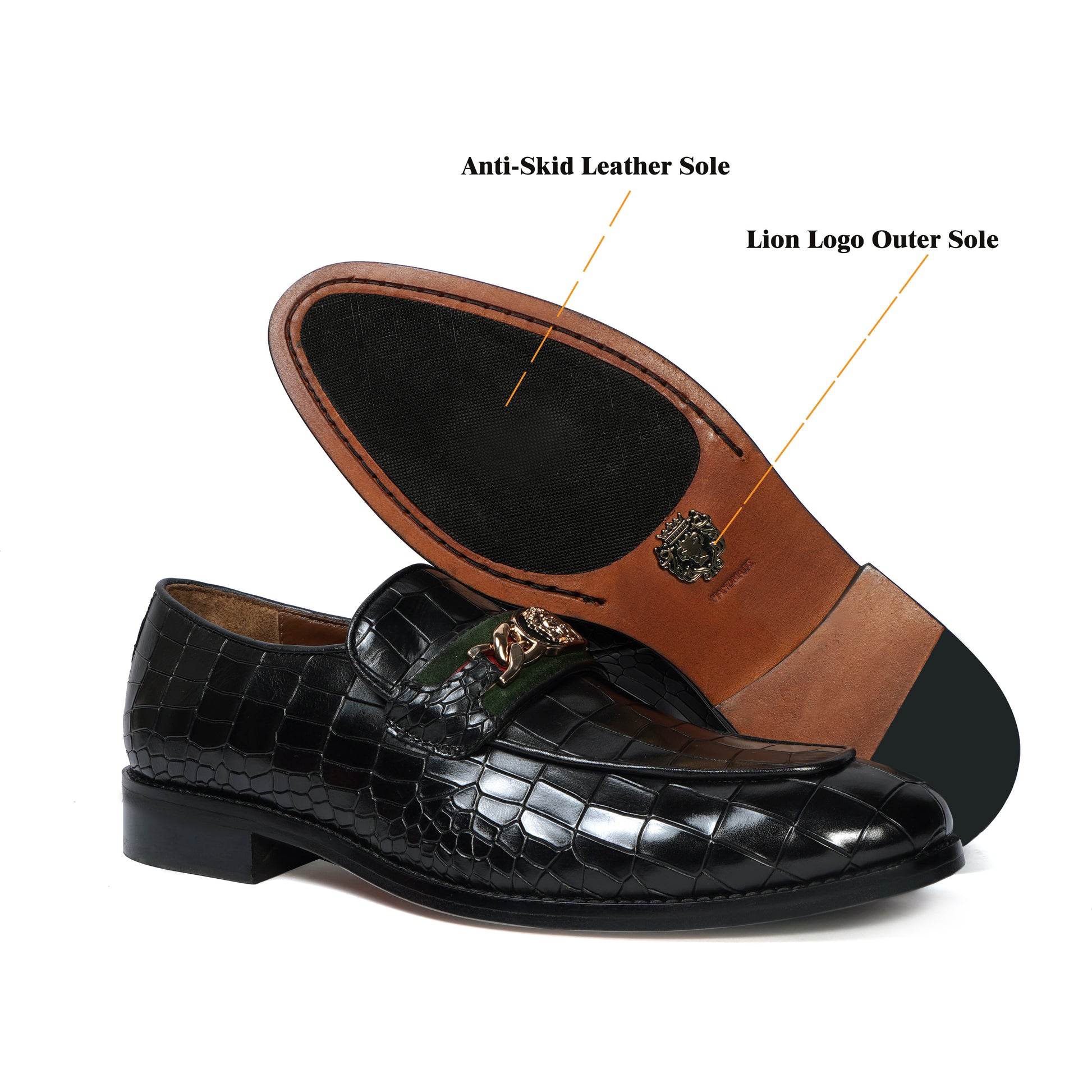Croco Textured Black Loafer with Raised Metal Lion Chain Embellishment