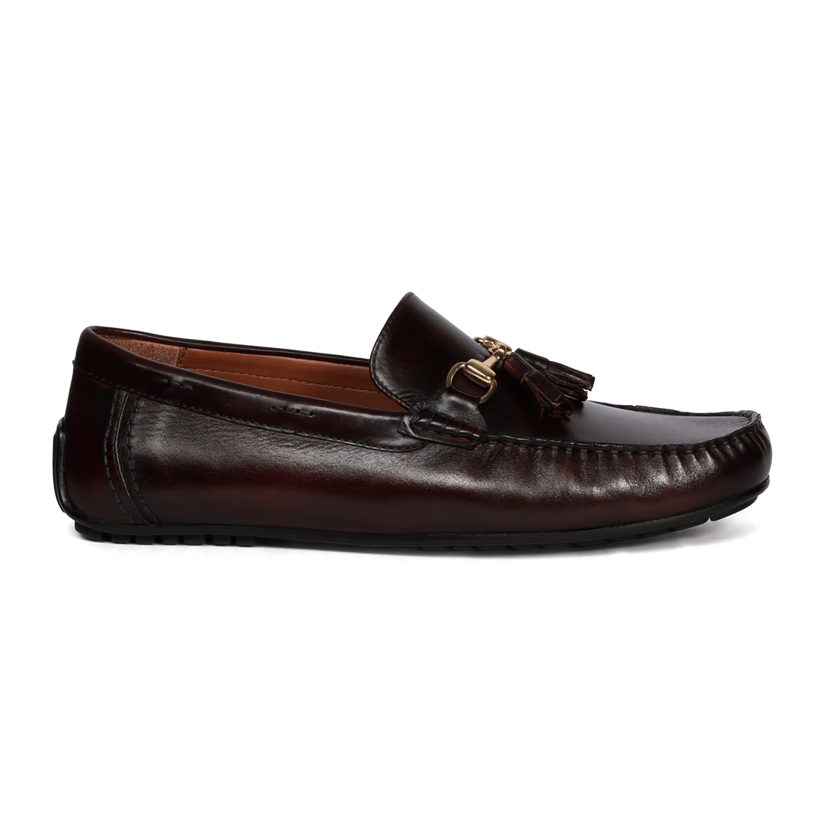Browns are never old or outdated to wear. Dark Brown Genuine leather products look very classy when matched with a dark to light color accent. This chic look dark brown leather horse-bit buckle and tassel is a must have for fashion forward folks. The 100% Genuine Leather made ensures the top notch style and quality. Dark Brown shade gives you endless options to match with different attire. Tassels on genuine leather Shoes look very elegant. The dark brown genuine Leather shoe looks lavishing with golden metal horse-bit buckle on it. And when they are made of exemplary fitting and finish as that of the brand Brune & Bareskin, you can be sure that the shoes are nothing short of excellence. This is a must-have pair in your footwear collection. It has memory foam insole which remembers and molds according to the foot shape. The Rubberized outer sole provides better grip in different conditions. It is a perfect accessory to wear with formal-to-casual attires at any party or office. This is the shoe you would love to wear again and again.