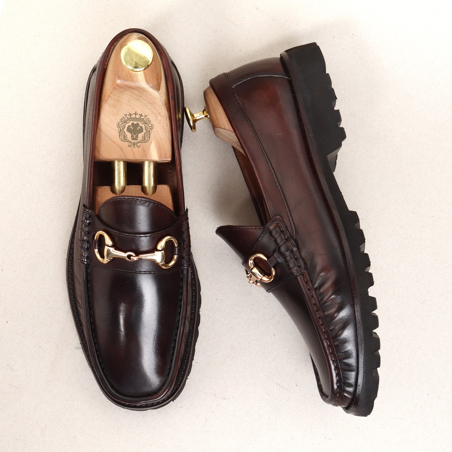 Make your everyday special with these classy men's loafers. It is the best shoe category for any men's closet. Loafers remain the favorite style of shoes, as they are convenient to use and spell minimum fuss. Dark brown Leather enhances its look with golden metal horse-bit on it. And when they are made of exemplary fitting and finish as that of the brand Brune & Bareskin, you can be sure that the shoes are nothing short of excellence. This is a very light in weight shoes and feels soft while walking. The extra cushioned in-sole provides the utmost comfort. This is a must-have pair in your footwear collection. The company " Brune & Bareskin" complements the fashion statement in a unique way to help customers cherry-pick from the collection & feel better & look better. You can get it made in your favorite color with our bespoke services.