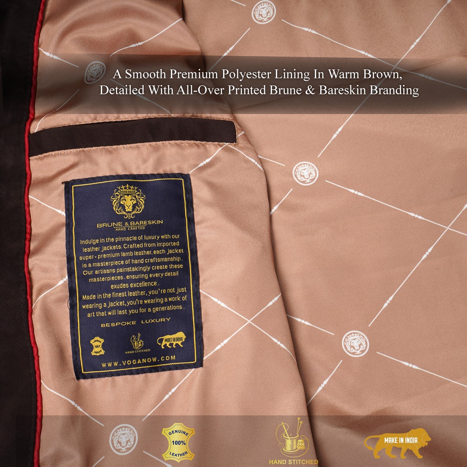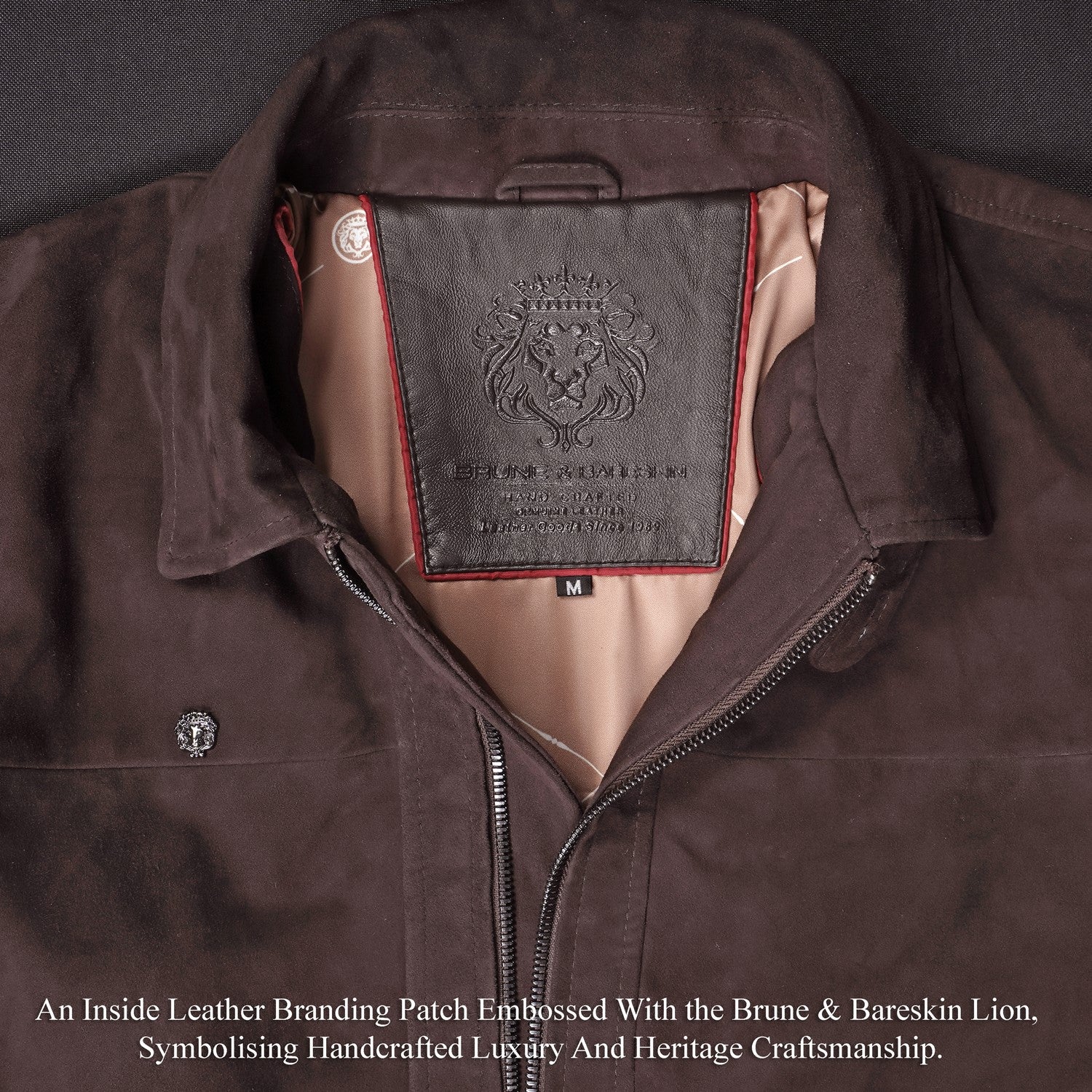 The jacket comes with two side pockets, offering ample space to carry your essentials. Signature Brune & Bareskin metal lion logo and branded buttons enhance its luxurious appeal. With our bespoke services, you can have this jacket tailored precisely to your fit. Pair it with a T-shirt, washed jeans or chino trousers, and boots for a smart, confident look.