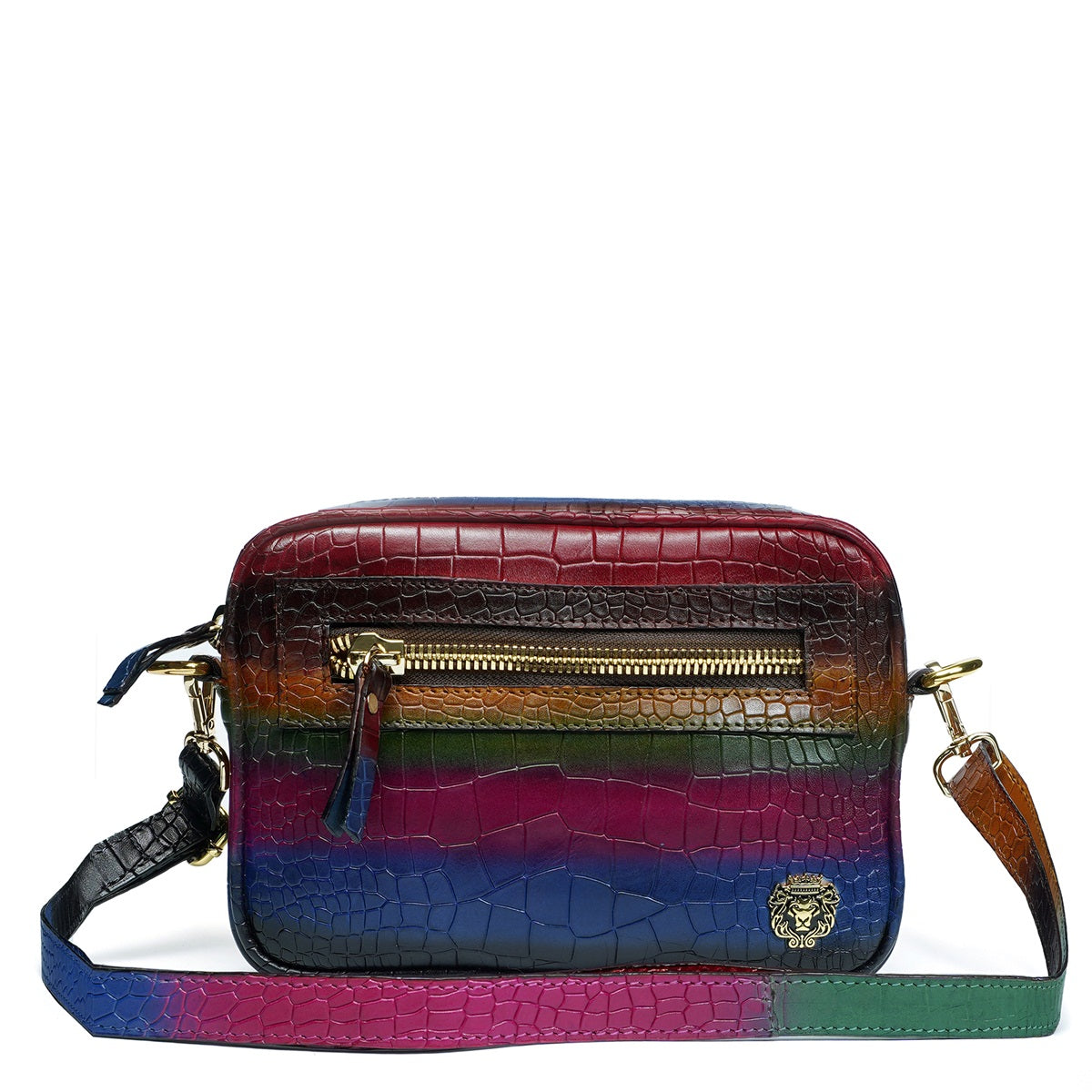 Introducing the iconic multi-colored Croco Textured Leather Cross-body bag from Brune & Bareskin. Expertly crafted in multi-colored croco textured leather, this Men's Mini Handbag from Brune & Bareskin is the perfect accessory to add a luxurious touch to any outfit. With its adjustable buckle strap, zipper closure, and metal lion logo, this stylish crossbody bag offers both elegant simplicity and secure storage for your wallet, mobile phone, cash, ID cards, and wallet etc. Perfect for both business and leisure outings, this handcrafted bag is the epitome of modern sophistication and luxury.