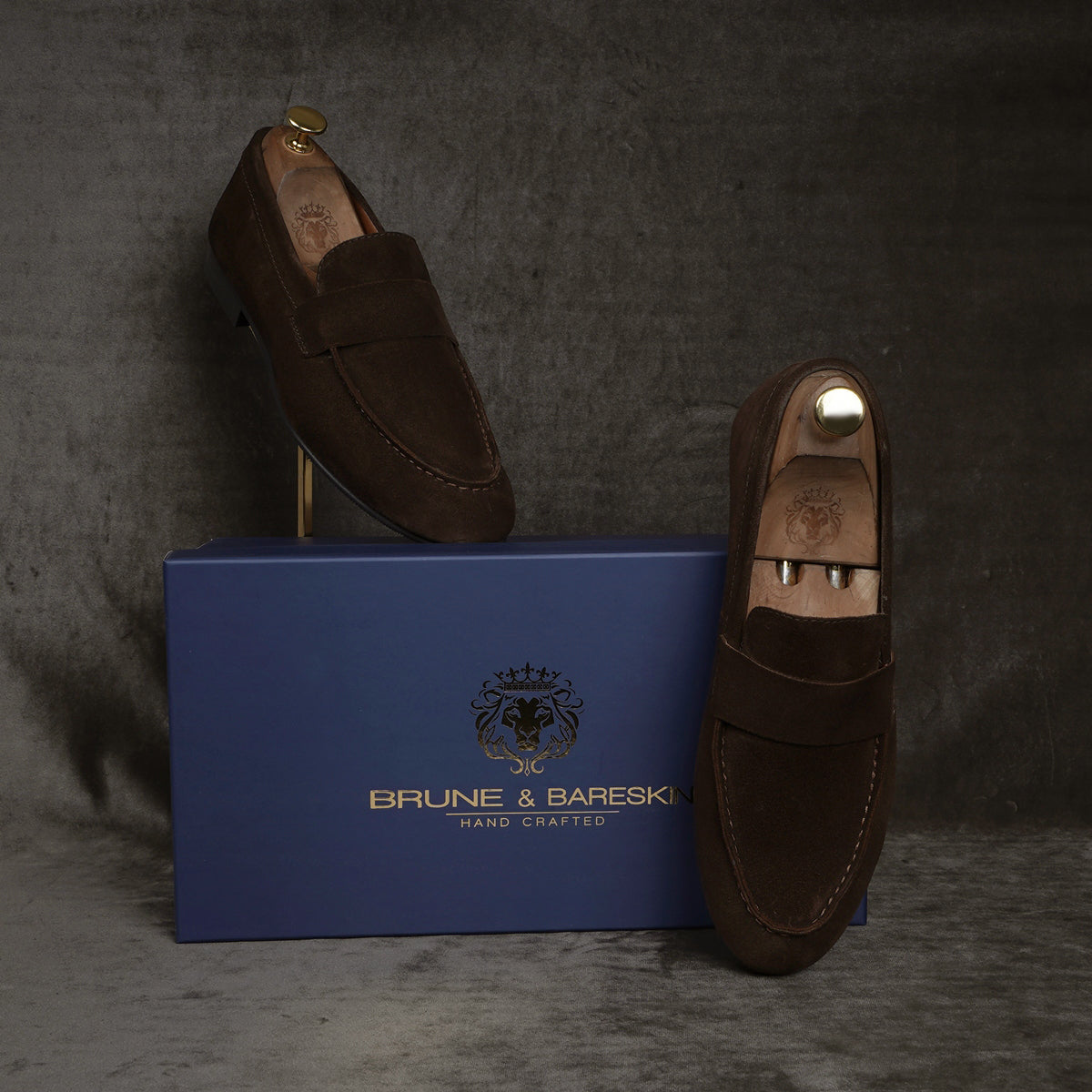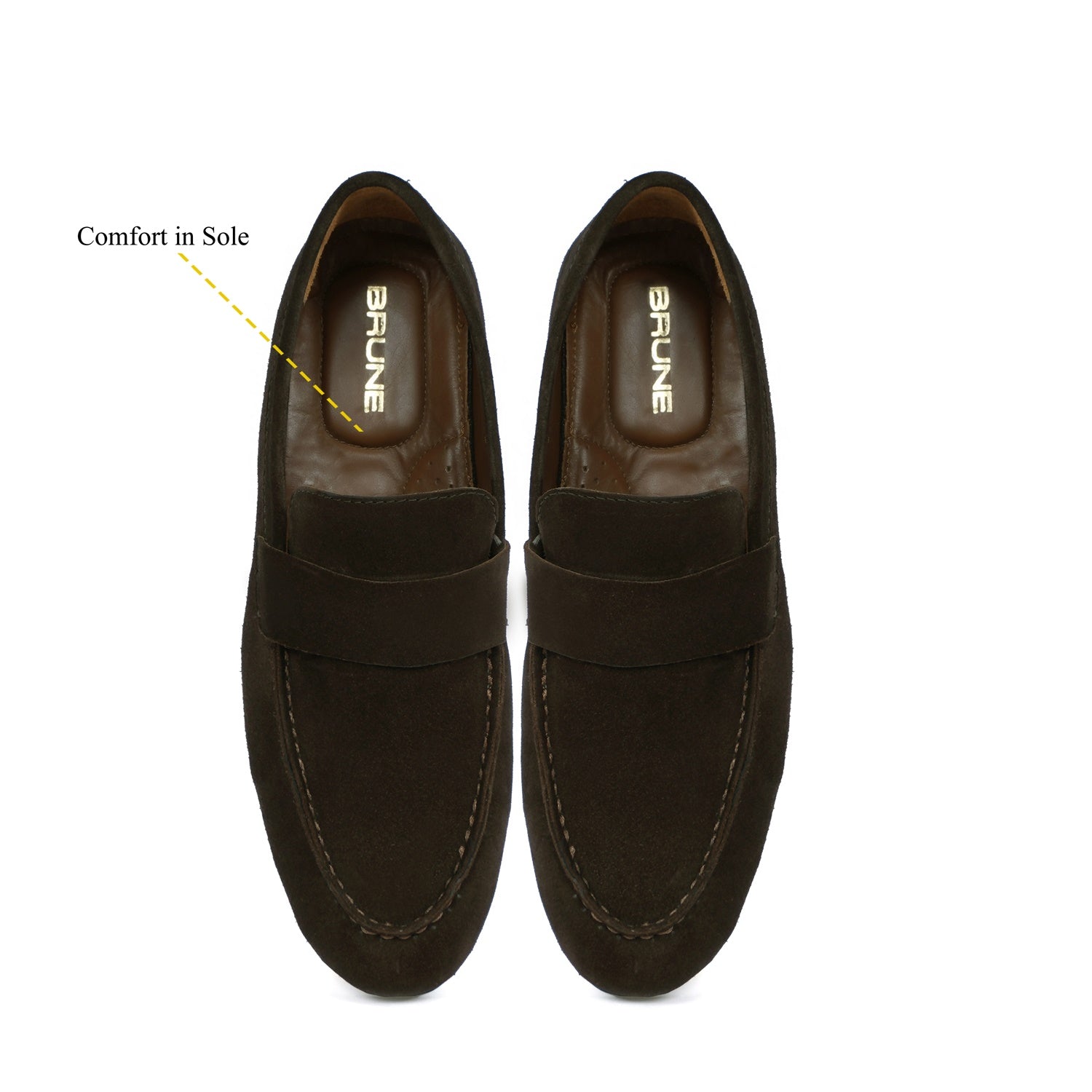 This high-quality dark brown suede leather loafer model combines classiness and durability. Choose to wear this pair of suede dark brown leather shoes by Brune & Bareskin. These slip on shoes are built to last and pair it well with your business attire as well as your classy weekend look. It has a memory leather insole that remembers and molds according to the foot shape. This is a very light in weight shoes and feels soft while walking. Anti-Skid Rubber outer sole ensures the perfect walking grip. It would be perfect to match up with formals & casual as well. The extra cushioned in-sole provides the utmost comfort. We can customize these well-fitting shoes further to your specifications. These are very attractive footwear for any corporate event and get-together.