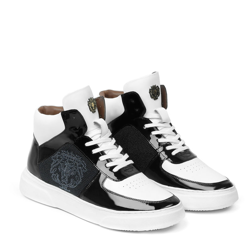 Men's Black Smokey Grey Beads Lion Zardosi Leather Sneakers with Patent Detailing by Brune & Bareskin
