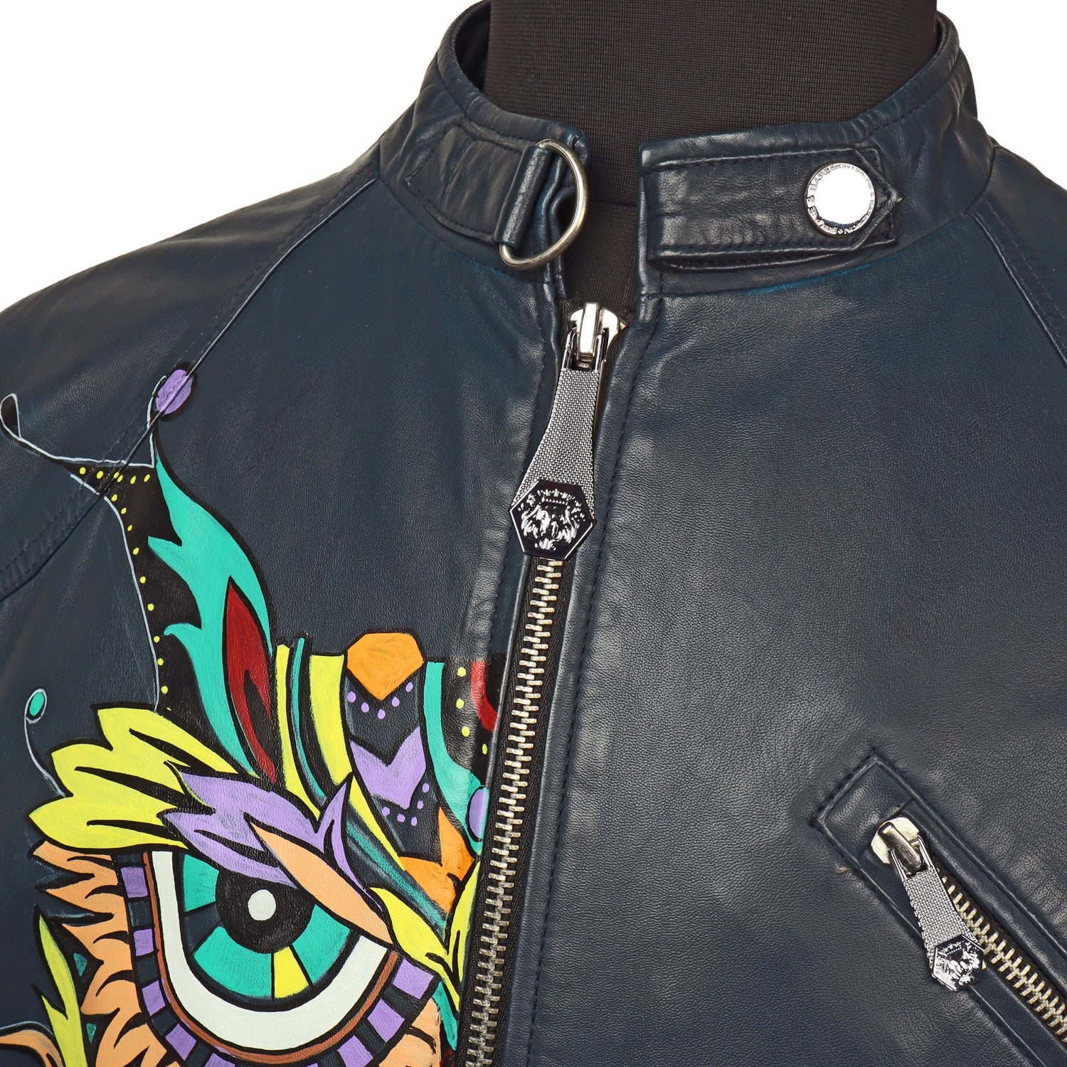 Hand-painted Suger-skull Owl Smokey Blue Leather Jacket By Brune & Bareskin