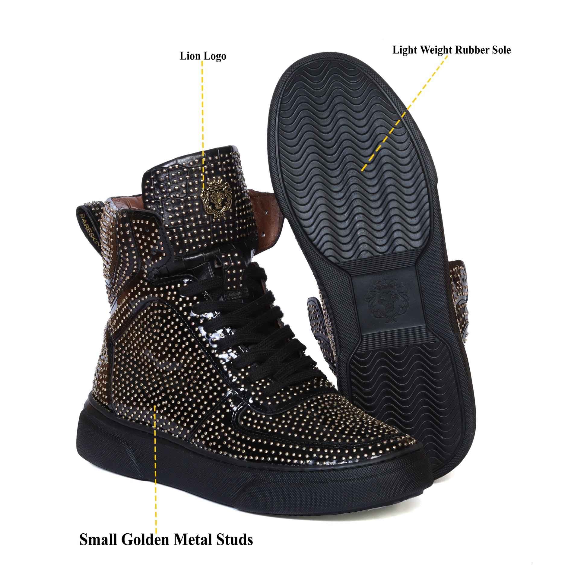These one-of-a-kind Men's Sneakers from Brune & Bareskin feature an intricately beaded golden rhinestone pattern, made from luxurious patent leather in a timeless black hue. Show off your style with the golden lion logo, and gain extra foot comfort with a padded foot-bed. Built with an anti-skid rubber sole, lace-up closure, and handmade high top, these shoes guarantee exclusive craftsmanship with every step.