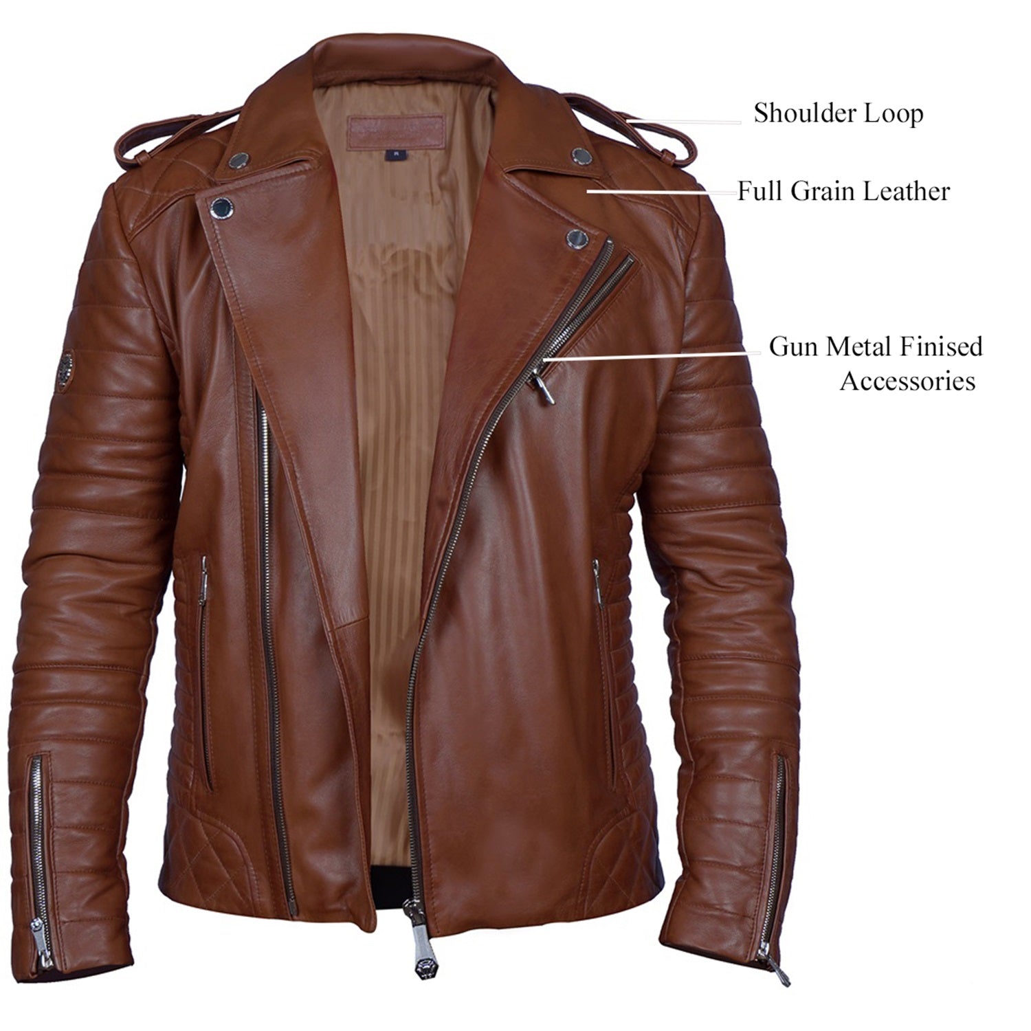This full sleeves tan Brune & Bareskin signature metal lion logo luxury original leathers giving it marvelous look slim fit, This tan Sheep leathers has padding all around to guard against cold classic created especially for young guns, The tailored fit of this quilted leather jacket displays the traditional British racing heritage while the zips gives this jacket a modern edge. Stylish zip closure with zipper pockets on the front makes it more dapper. Giving it the most masculine look a men in leather jacket can get. Brune & Bareskin's collection of easy-to-wear wardrobe staples that combine classic and contemporary styles.