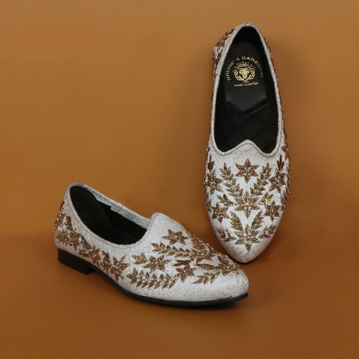 Take fashion to the next level, Capture timeless style with this pair of Men's White jalsa jutti with Golden Dapka Leaf Decorative Embroidery from Brune & Bareskin. Handcrafted with white fabric material and a golden zardosi embroidery, these jalsa juttie's are perfect for adding wedding-worthy flair to your look. An anti-skid rubber sole ensures comfort and stability. Where classic style meets modern convenience. You can match it up with any ethnic wear or into-western & get customized it with your choice of color & design.
