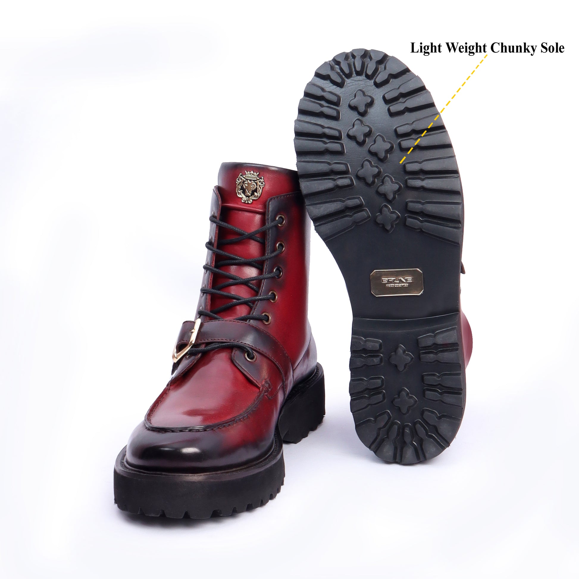 These boots are perfect companion for the fashion loving folks. Wine Burnished Leather Brune & Bareskin Boots are crafted to provide the utmost comfort and next-level style. It is a perfect pair to carry on long travels. These genuine wine leather boots are perfect to keep you stand out from the crowd. The adjustable strap helps to get the perfect fit. Wine Genuine Leather shoe looks lavishing with metal shoe eyelets and Brune & Bareskin's signature metal lion logo. The additional laces design makes it very easy to wear. These ankle-length shoes are fitted that emphasize the size and shape of your feet to perfection. The ultra-lightweight sole makes it ideal footwear for all-day-long wear-ability and the thick high lightweight sole complements the comprehensive look. They are easy to team with formal trousers as they blend well with the classic fabrics as well as the modern fabric pants, slacks, cargos, and trousers. You can get it customized in your favorite color shade with our bespoke services.