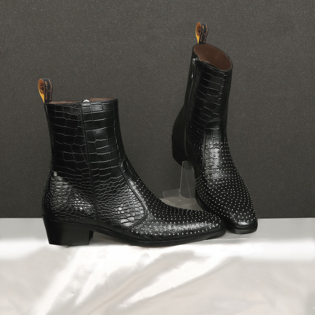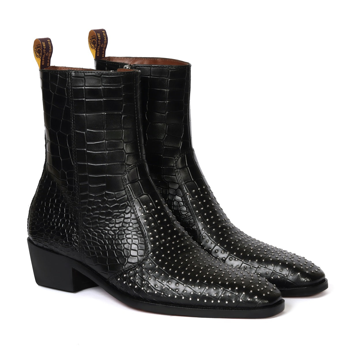 Metal Fleck High Ankle Stitched Black Boot in Deep Cut Leather with Cuban Heel Zip Closure By Brune & Bareskin