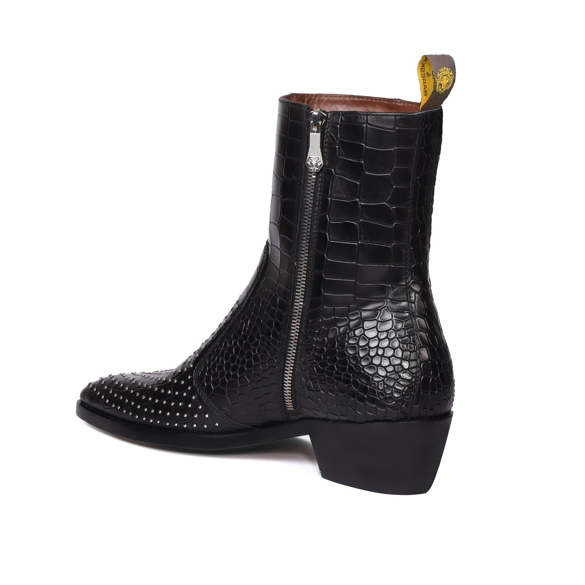 Black Deep Cut leather boot with Silver Metal Fleck detailing makes this boot the first choice of every Fashionista. Silver Metal Fleck on Cut Croco Textured leather upper provide a unique swanky look. This Shoe is entirely handcrafted by our expertise. The stitched detailing on the quarter looks classy. The greater detailing of Inner side zipper closure at the ankles lend a classy look to these deep cut leather formal shoes. These deep cut croco textured leather ankle-length shoes are fitted to emphasize the size and shape of your feet to perfection. These boots provide the distinct and sassy look.