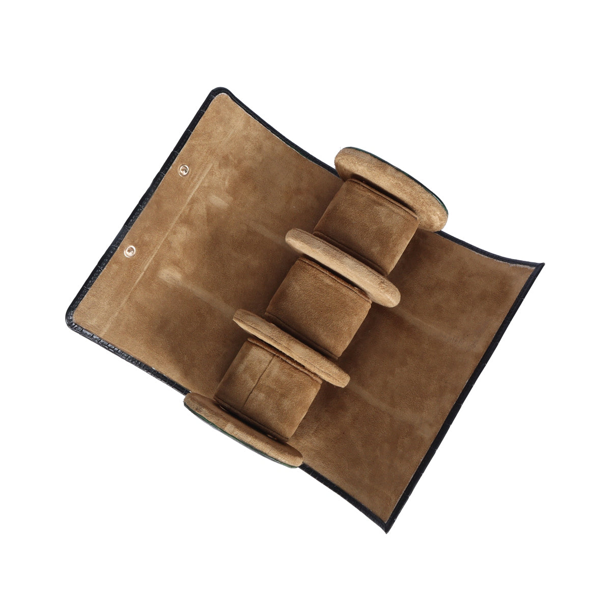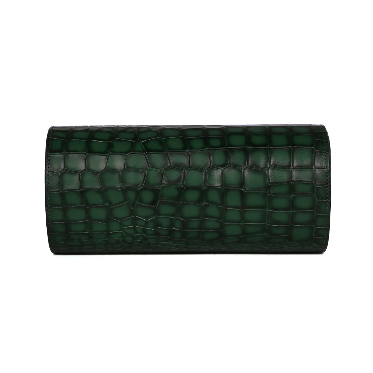 Smokey Finish deep cut croco print green leather wrist watch roll is a storage accessory designed for 3 watches. It is made of high-quality leather with a deep-cut pattern and a Smokey finish that gives it a unique and elegant look. The roll is designed to store multiple wrist watches securely and protect them from dust, scratches, and other forms of damage and designed with magnetic button closure. The interior of the roll is lined with soft material that provides extra cushioning to the watches. It is a luxurious and practical accessory for watch collectors and enthusiasts. You can also get it customized especially for you with your name initials and favorite color.