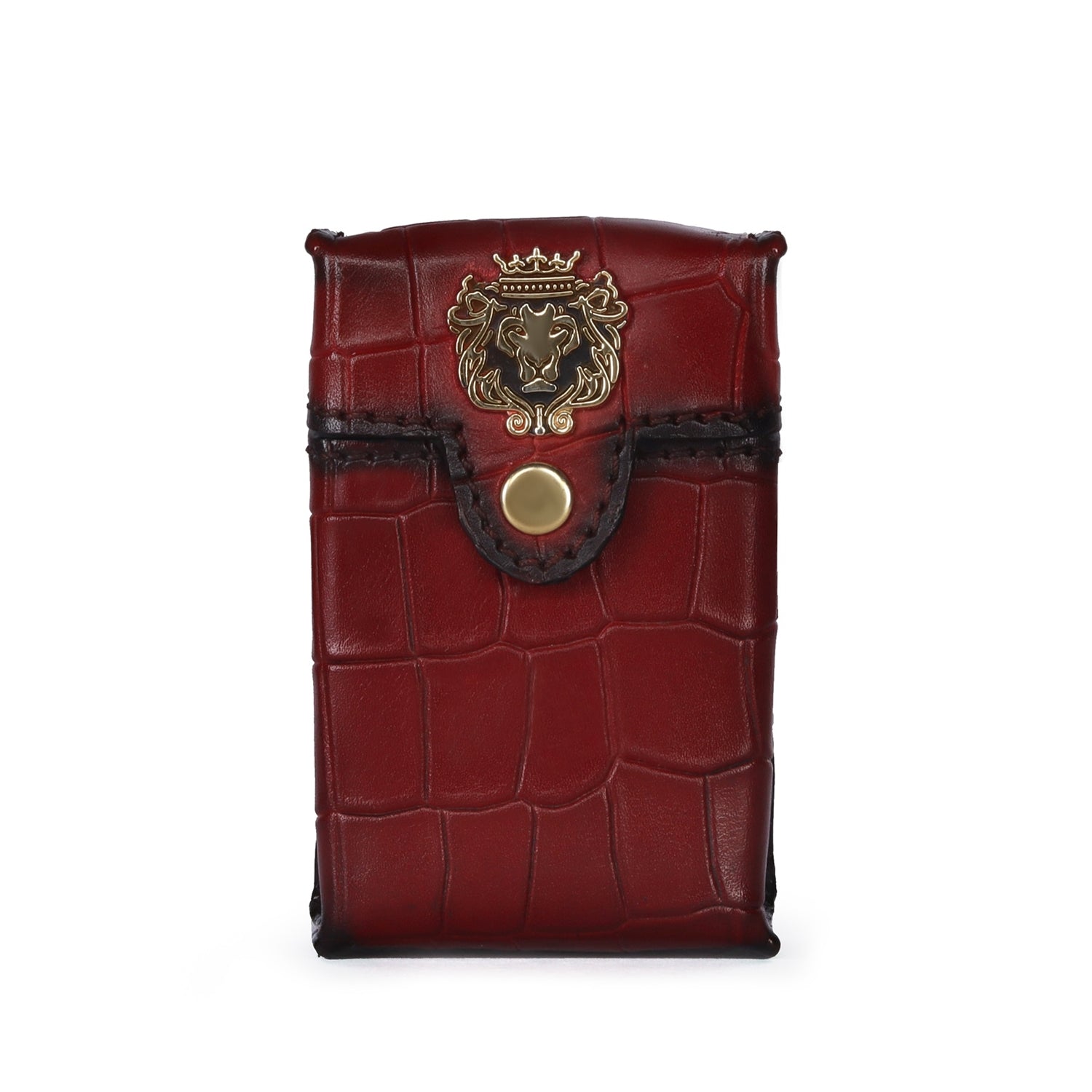 Metal Lion Vintage Patina Cigarette Carrying Case Wine Deep Cut Croco Print Leather By Brune & Bareskin