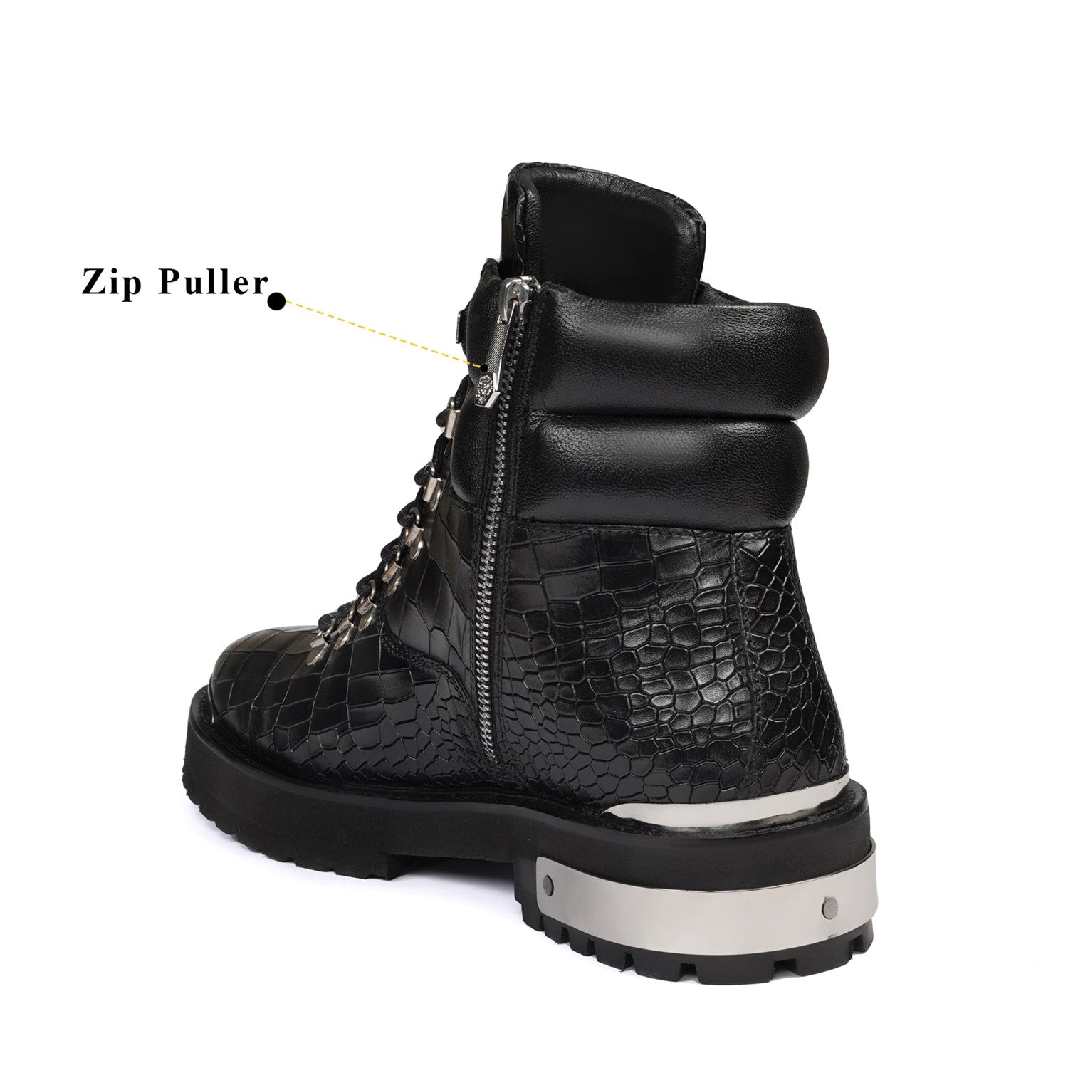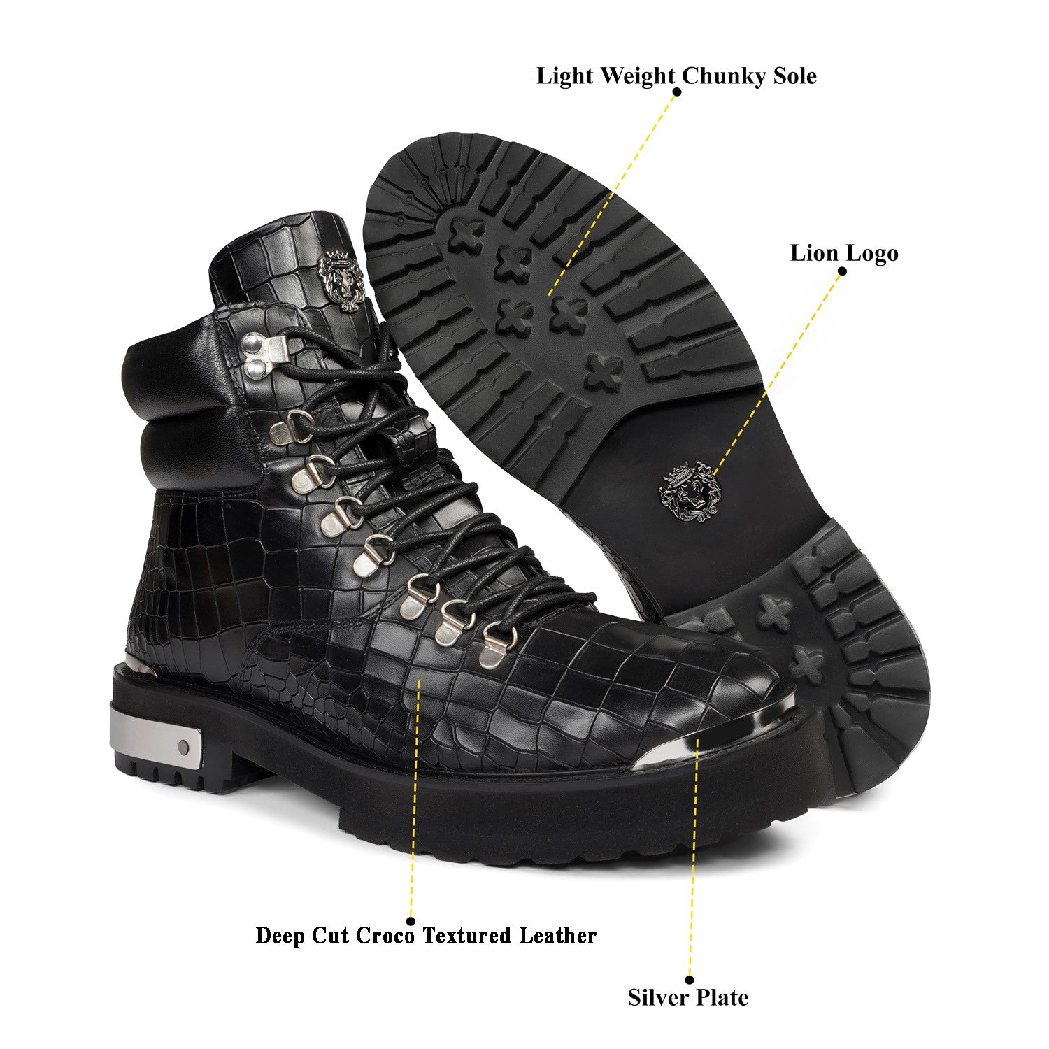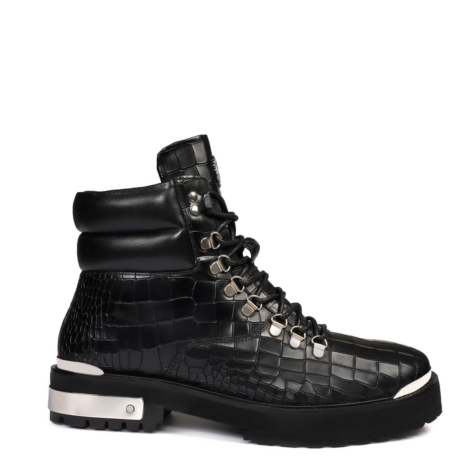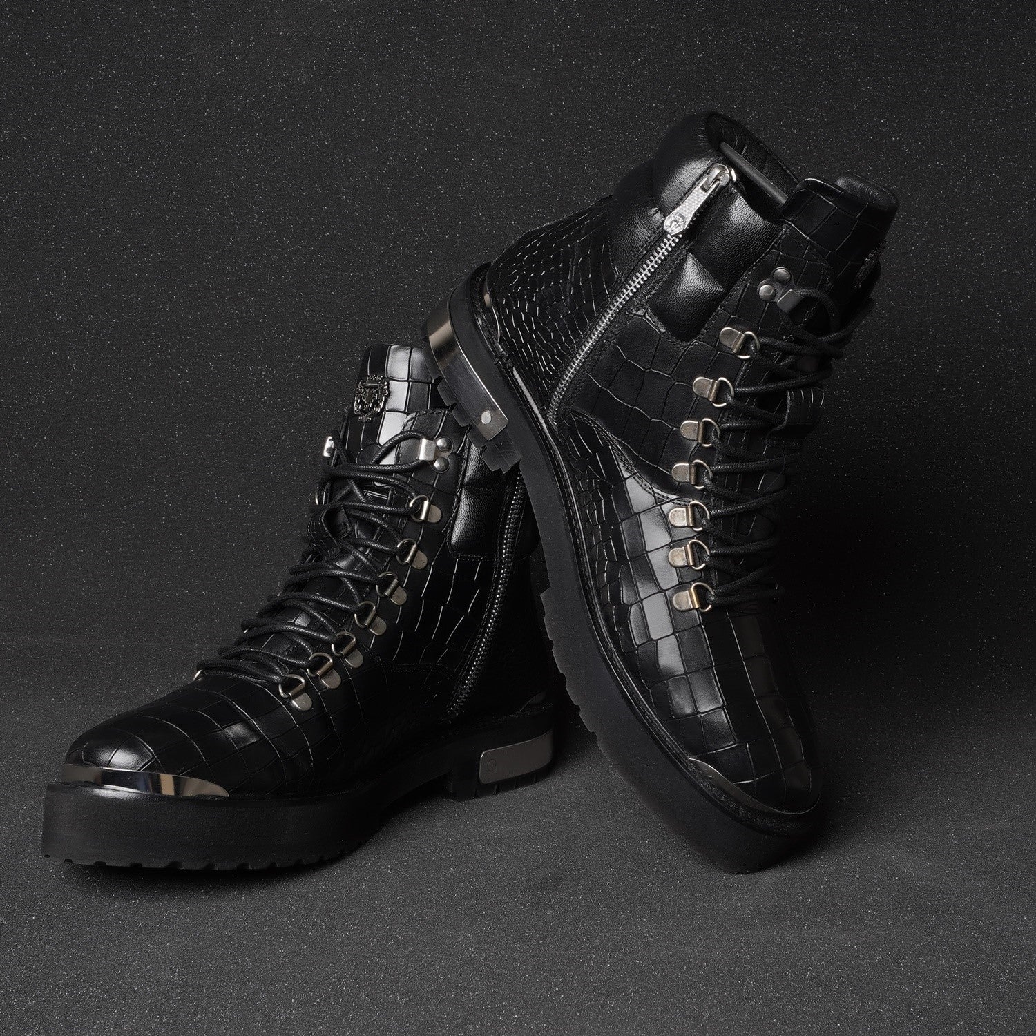 Metal Plate Black Lace-Up Chunky Boots in Croco Textured Leather with Zip Closure By Brune & Bareskin