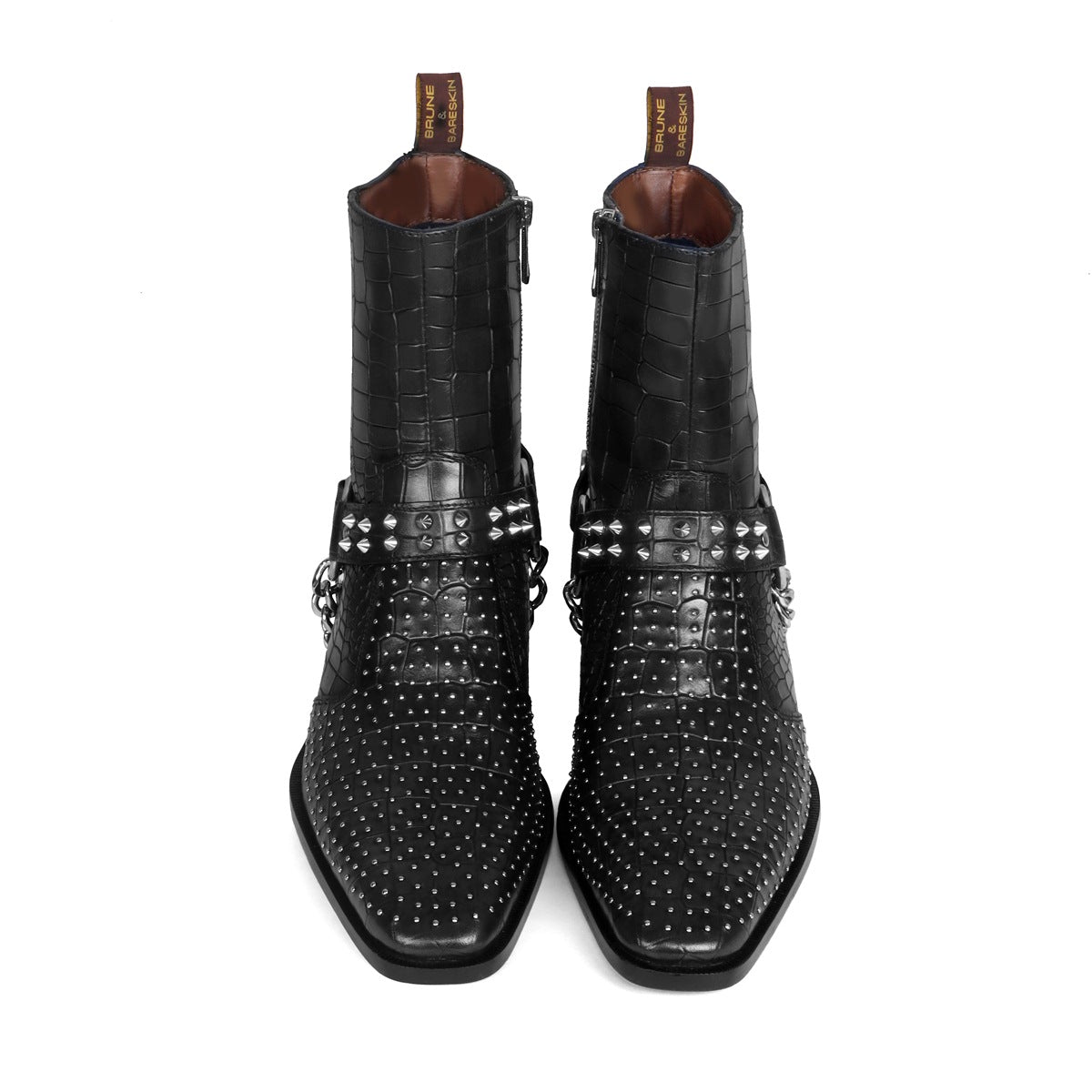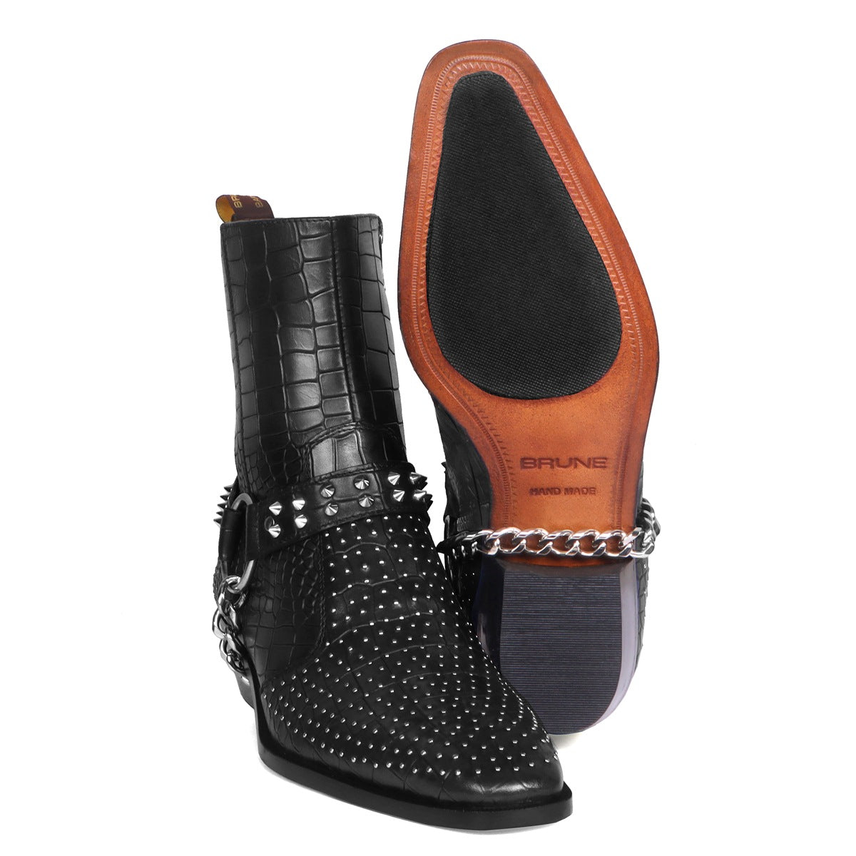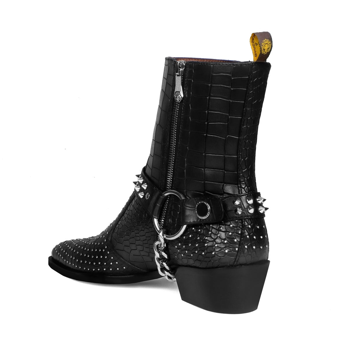 Black Deep Cut leather boot with Silver studs and Metal Fleck detailing makes this boot the first choice of every Fashionista. Silver studs on Cut Croco Textured leather upper provide a unique swanky look. This Shoe is entirely handcrafted by our expertise. The greater detailing of Inner side zipper closure at the ankles lend a classy look to these deep cut leather formal shoes. Removable Stylish buckles Straps around the ankle take care of the appropriate fit and comfort.