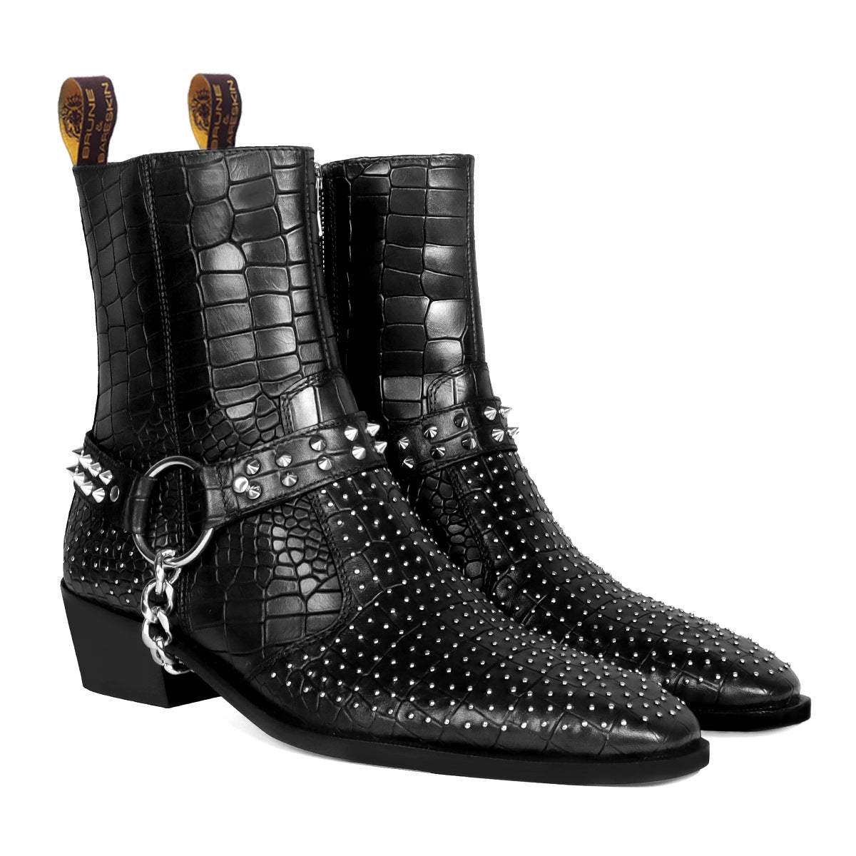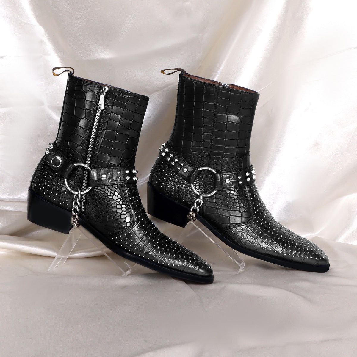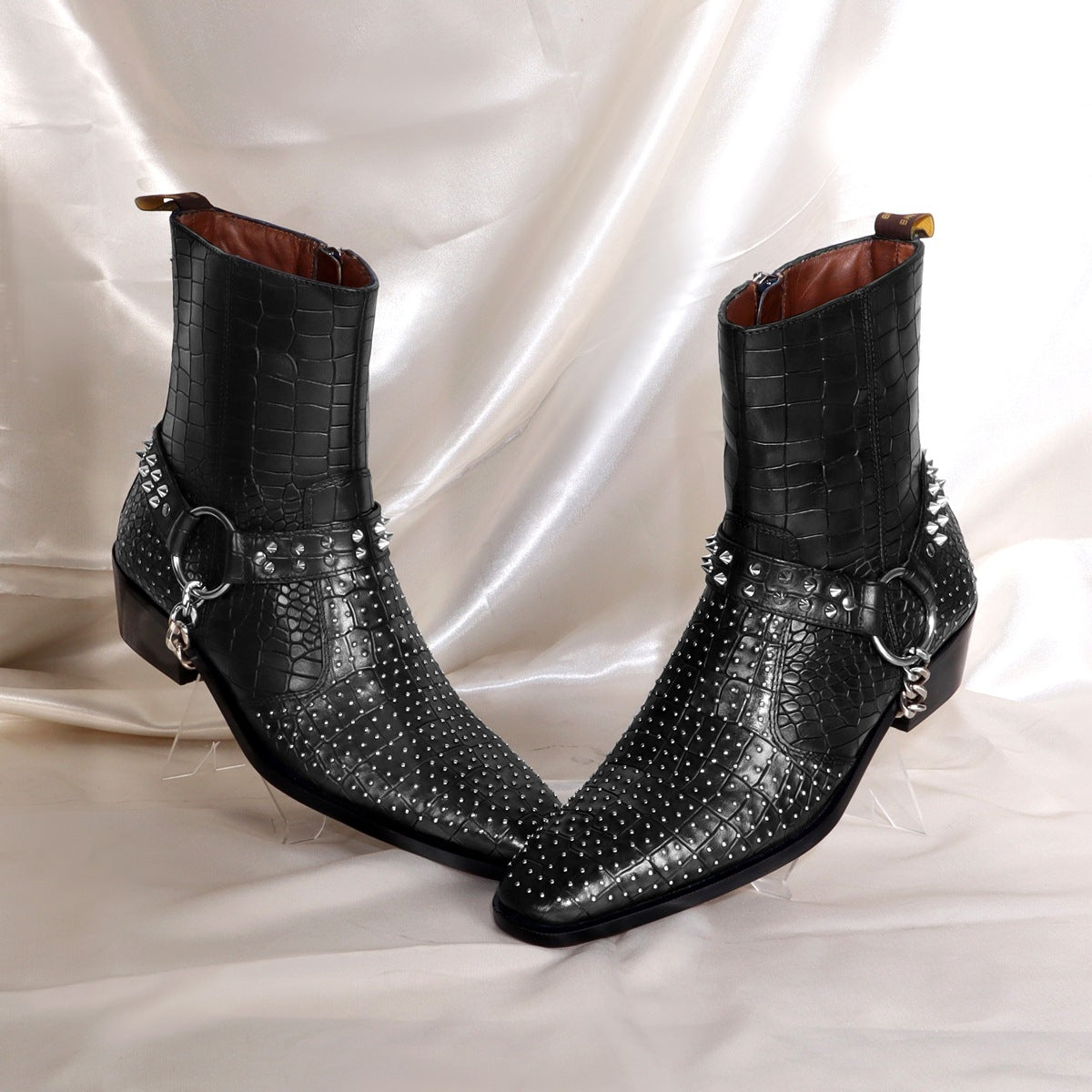 Black Deep Cut leather boot with Silver studs and Metal Fleck detailing makes this boot the first choice of every Fashionista. Silver studs on Cut Croco Textured leather upper provide a unique swanky look. This Shoe is entirely handcrafted by our expertise. The greater detailing of Inner side zipper closure at the ankles lend a classy look to these deep cut leather formal shoes. Removable Stylish buckles Straps around the ankle take care of the appropriate fit and comfort.