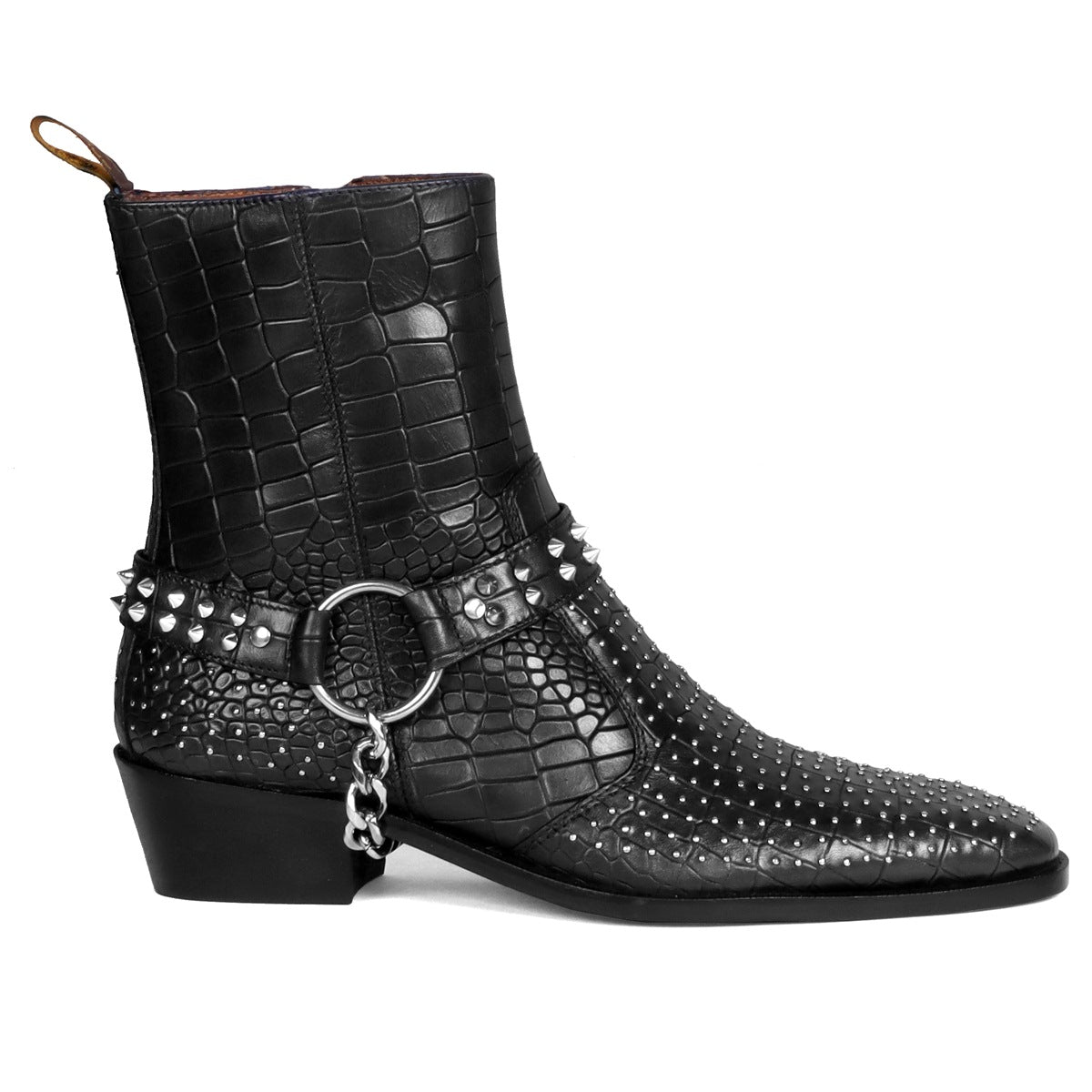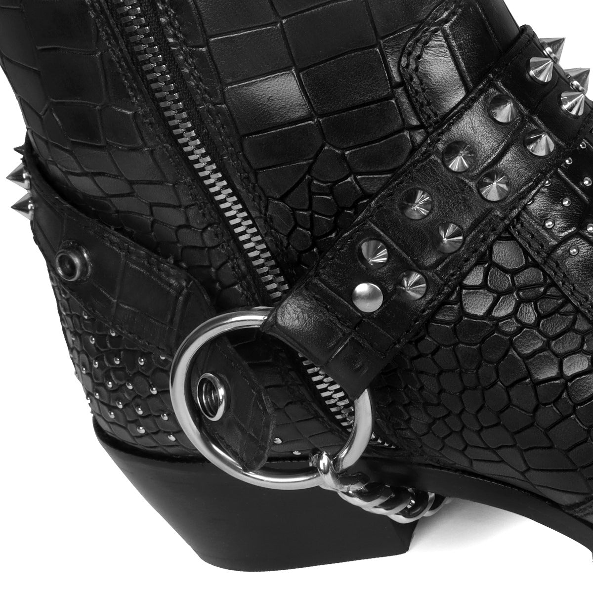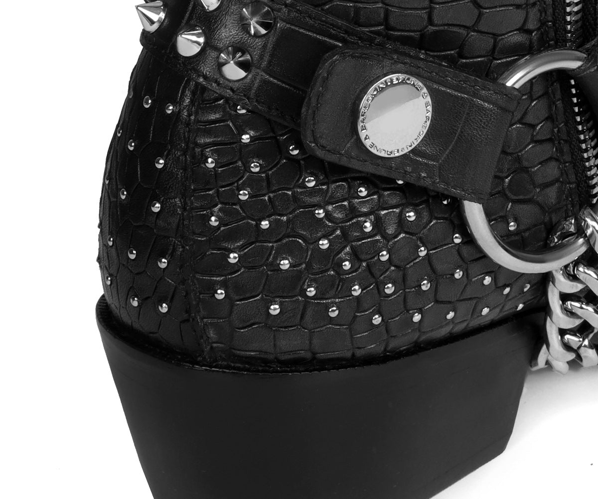 Metal Studded Black Cuban Heel Boots with Strap in Deep Cut Leather