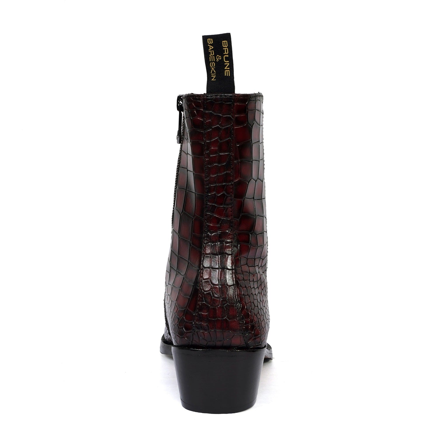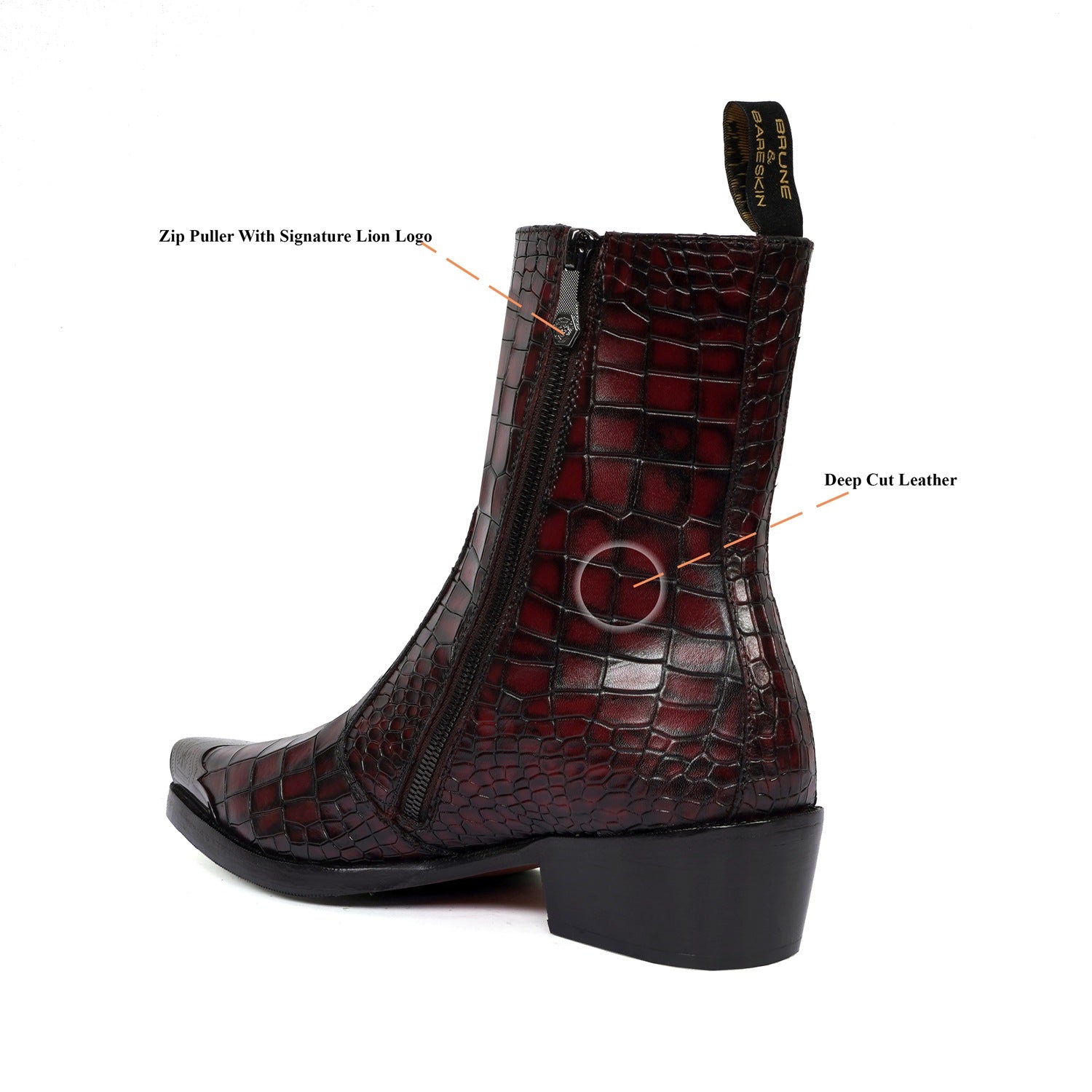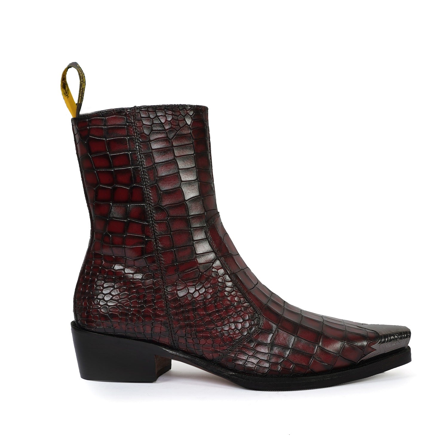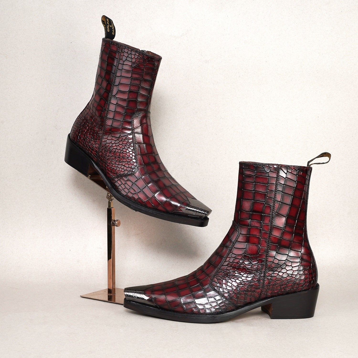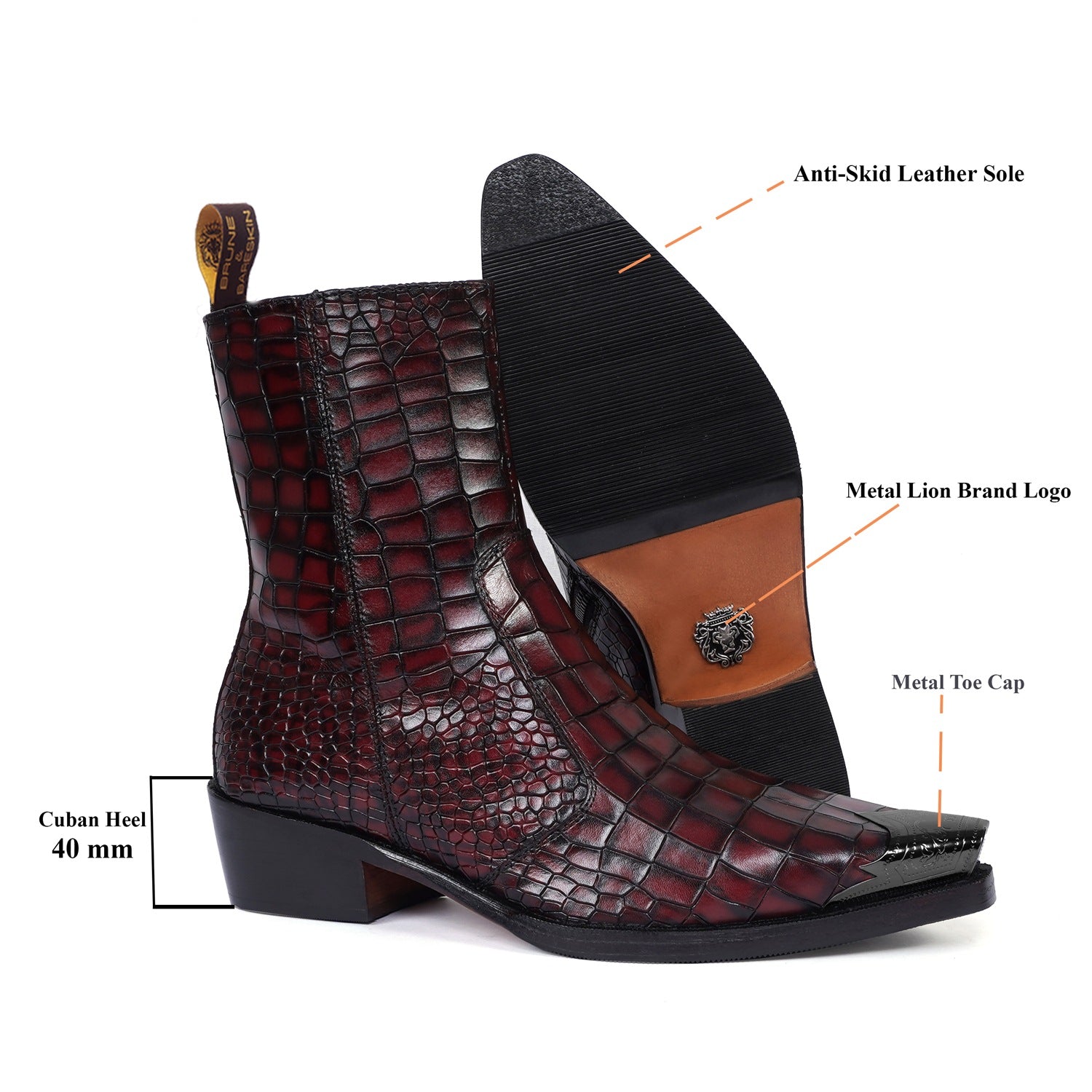 Step into the spotlight with our Metallic Cap Toe Cowboy Boots. Made from premium quality wine deep cut croco textured leather, these hand-crafted boots feature a unique metallic toe cap and classic cow boy style. With an inside zip closure and extra cushioned foot-bed, you'll enjoy both style and comfort with a 40mm Cuban heel. Show off your expert fashion sense with these high ankle boots, complete with a non-slip leather heeled sole.