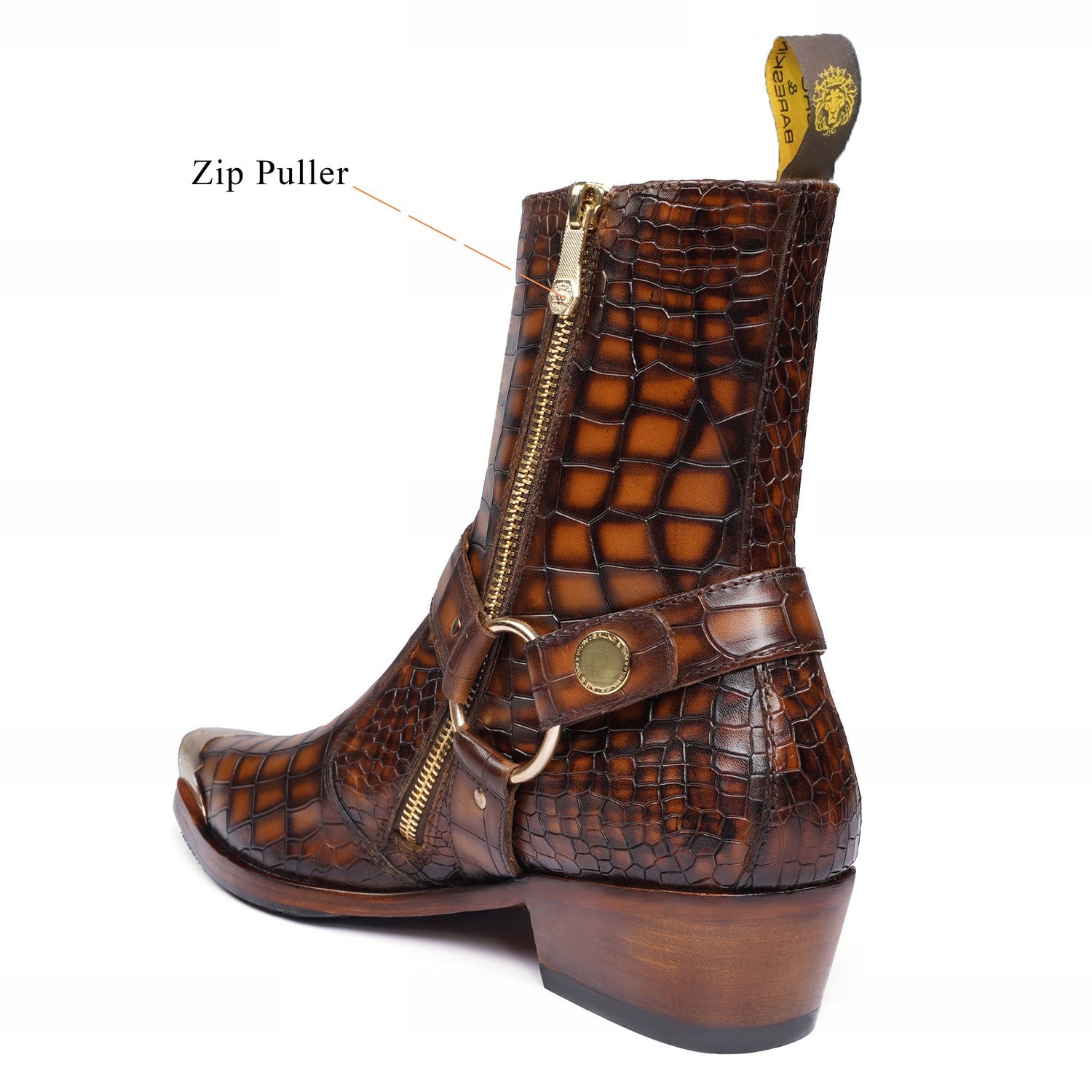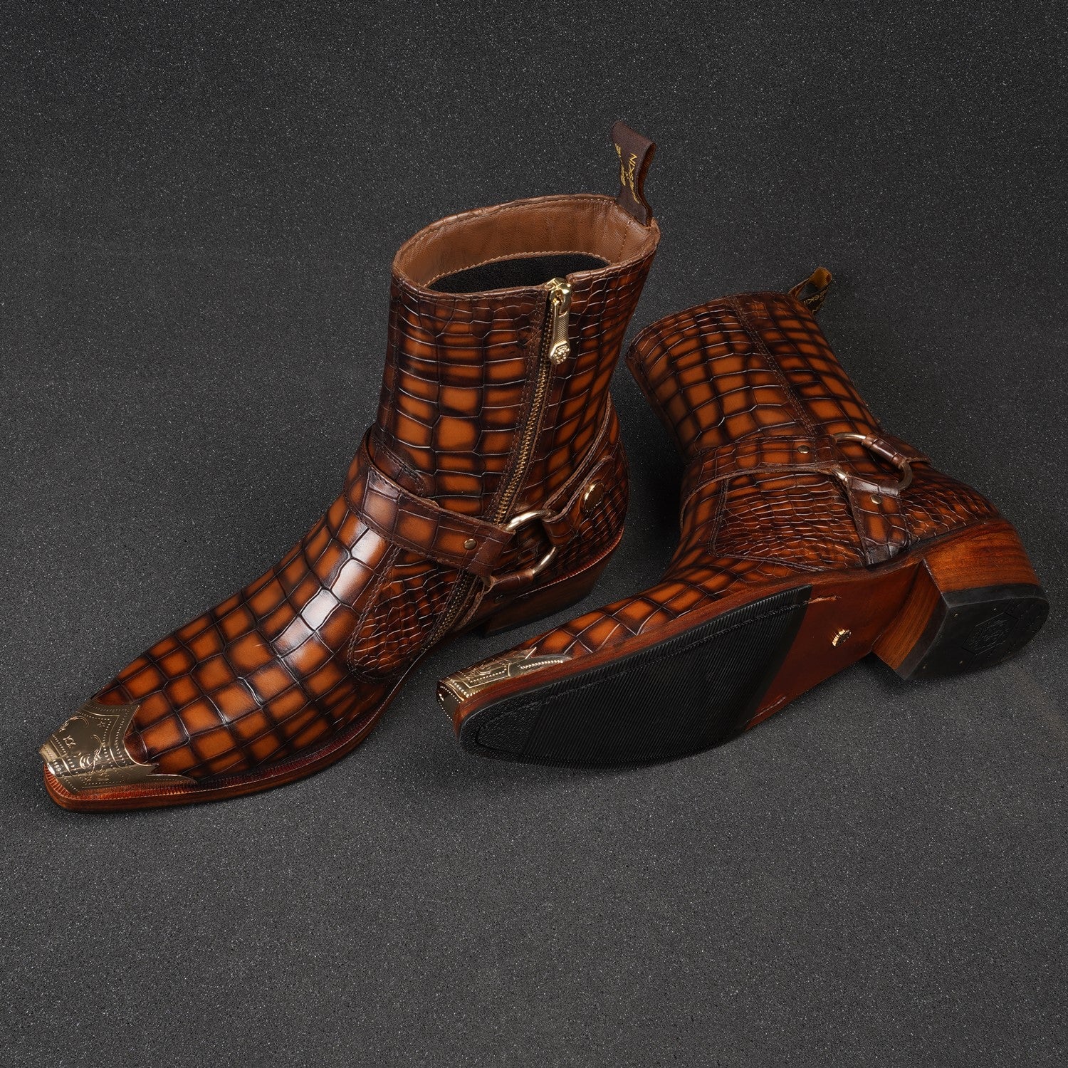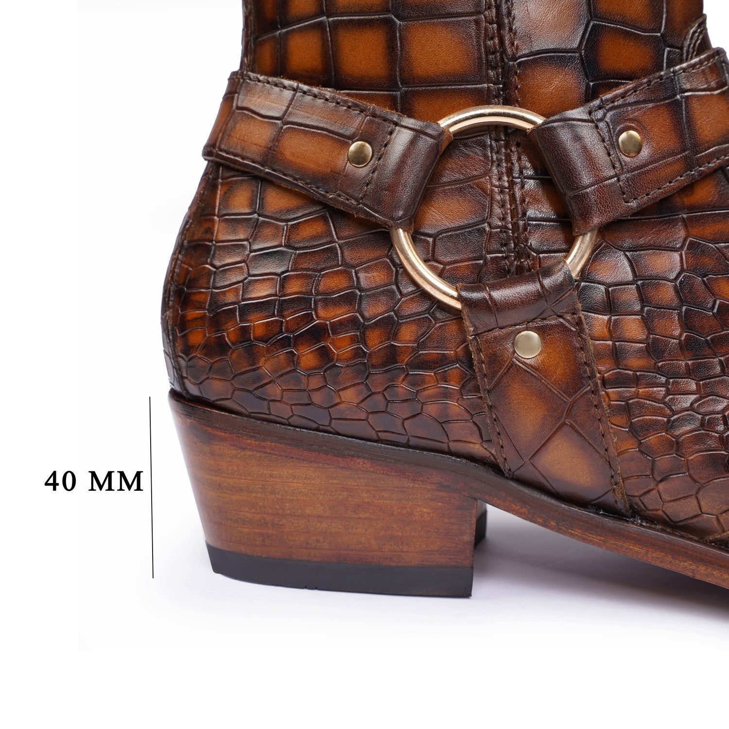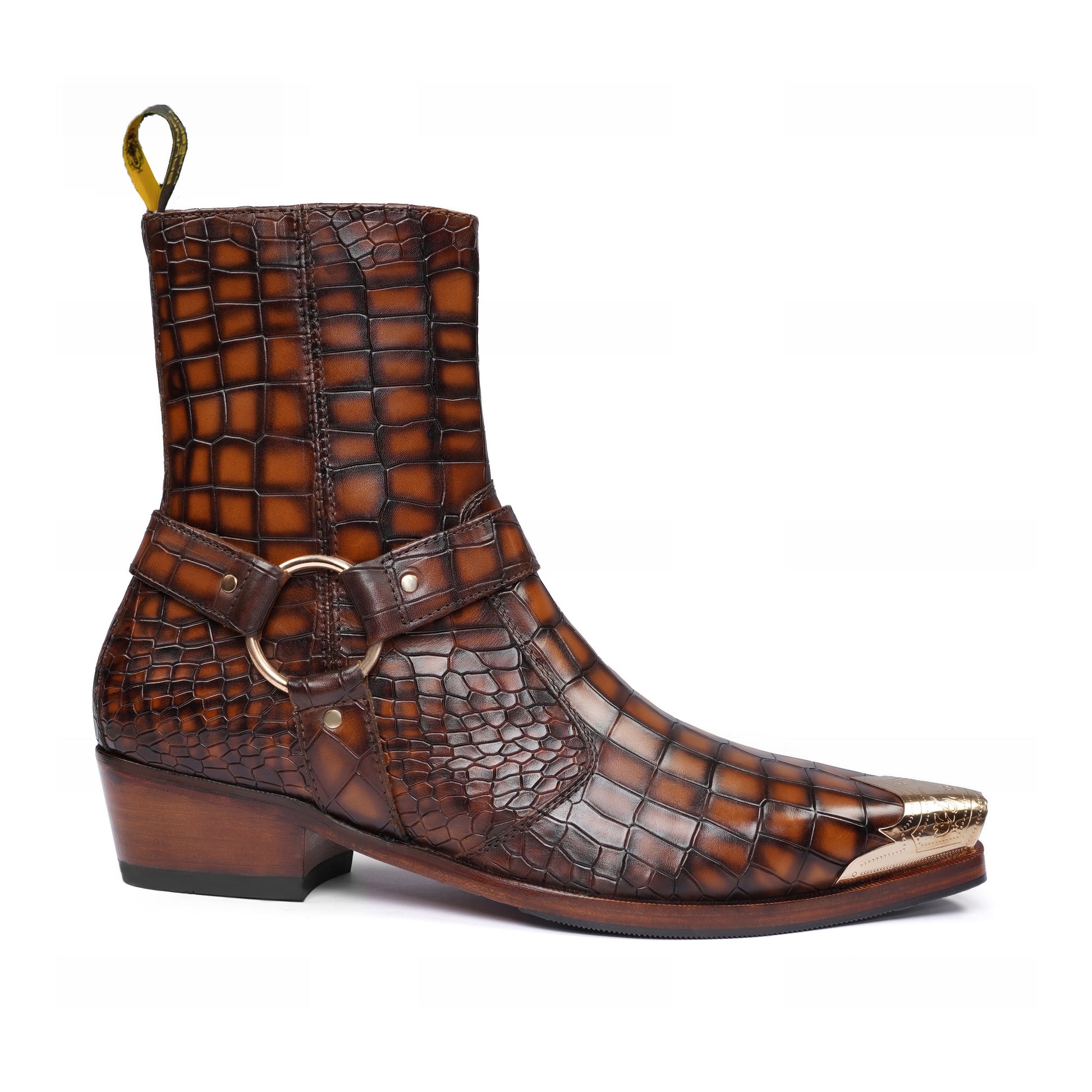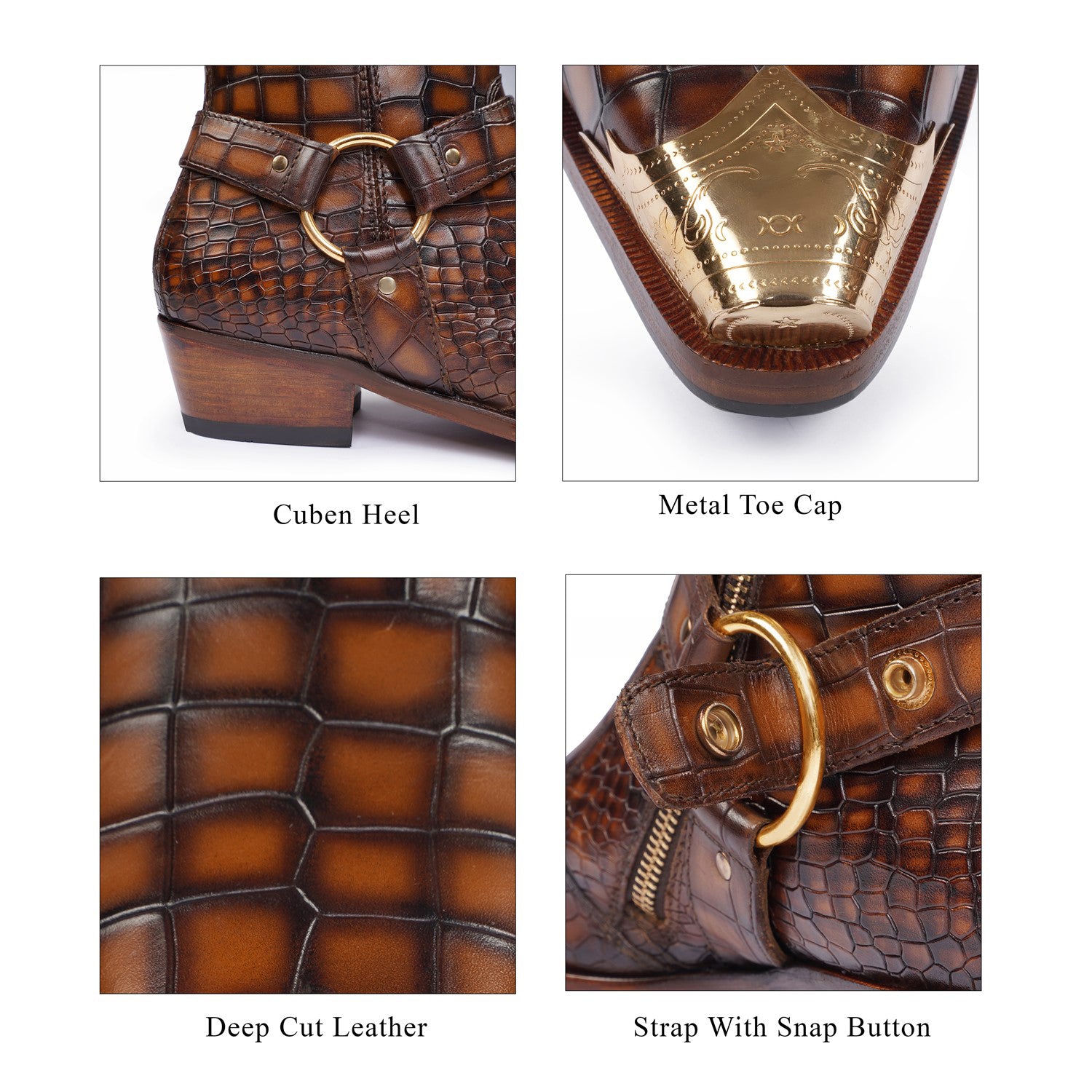 Step into the spotlight with our Metallic Cap Toe Cowboy Boots. Made with premium quality tan deep cut croco textured leather, these hand-crafted boots feature a unique metallic toe cap and classic cow boy style. With an inside zip closure and extra cushioned foot-bed, you'll enjoy both style and comfort with a 40mm Cuban heel.