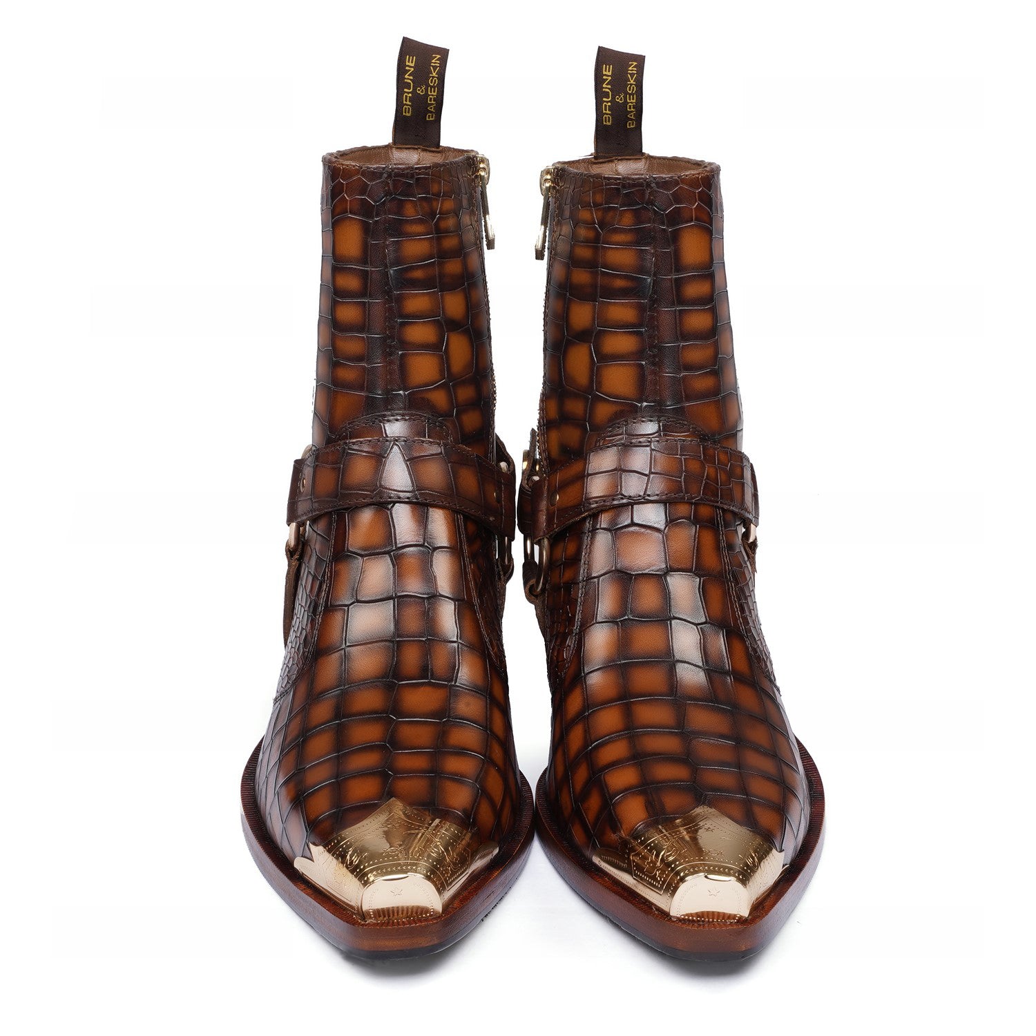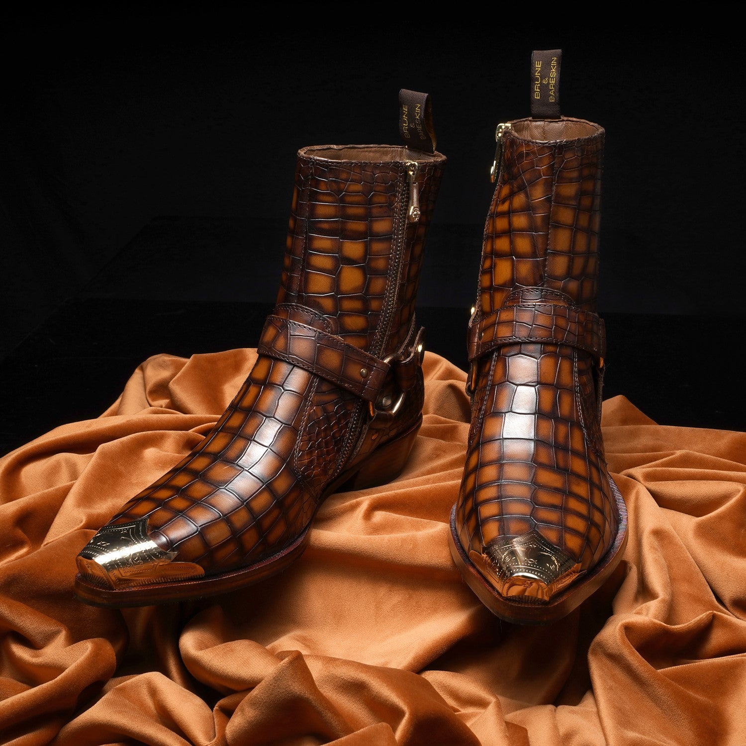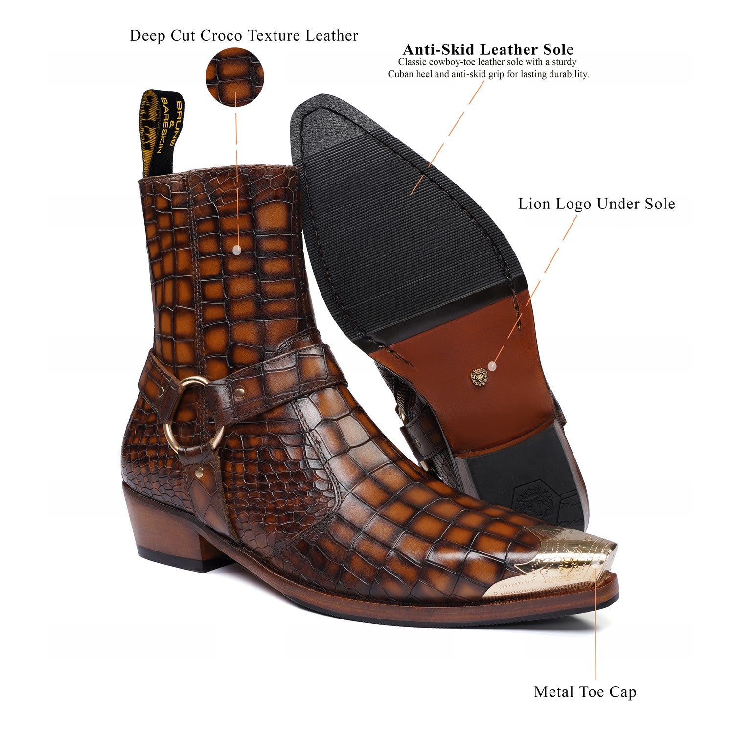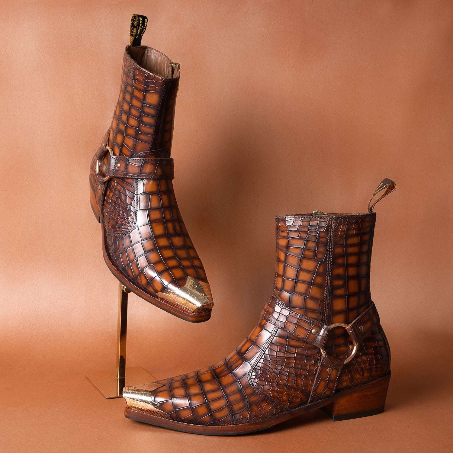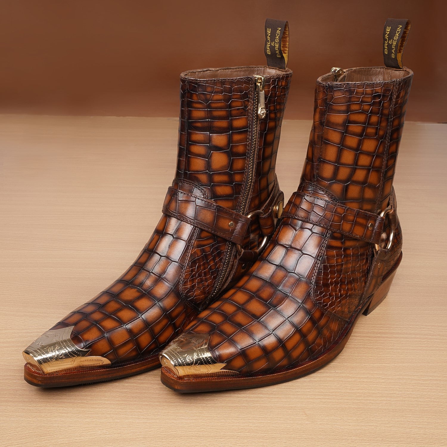 Step into the spotlight with our Metallic Cap Toe Cowboy Boots. Made with premium quality tan deep cut croco textured leather, these hand-crafted boots feature a unique metallic toe cap and classic cow boy style. With an inside zip closure and extra cushioned foot-bed, you'll enjoy both style and comfort with a 40mm Cuban heel.