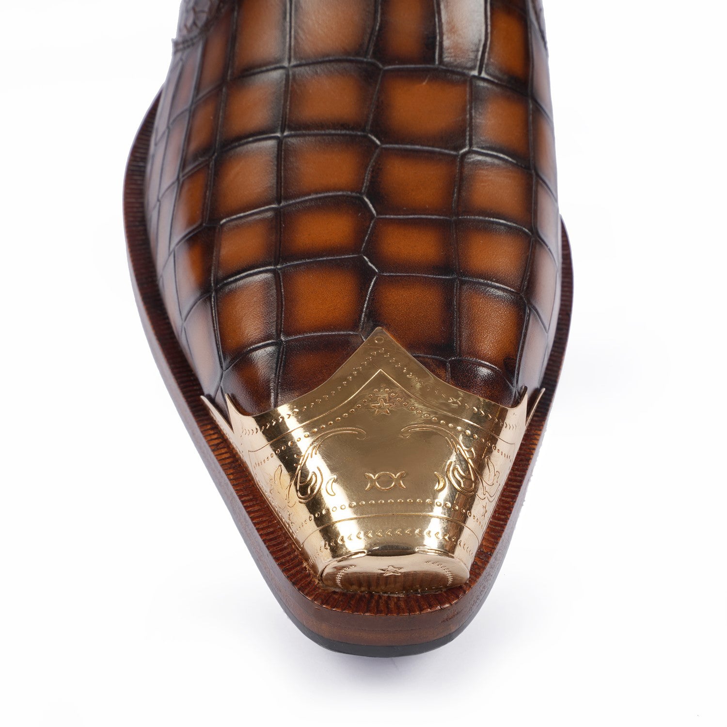 Metallic Cap Toe Smokey Finish Tan Cowboy Boots in Deep Cut Croco Leather