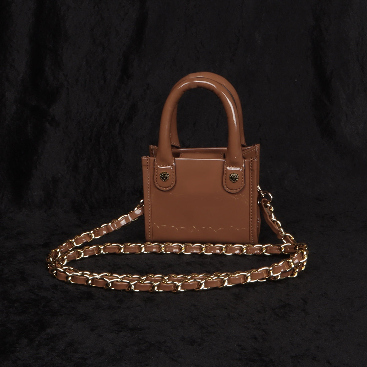 Brune & Bareskin tan micro sized leather hand bag looks very elegant. Crafted with brown patent leather, this handbag has been embellished with closure button detailing and patent leather detailing. The square space allows it to carry for travelling. The main button compartment provides the extra security to it. This bag is quite very handy for the traveler's as well. It provides the easy access to the needy essentials. Stylish look makes it an eye catching accessory. Stylish in appearance with its size its gonna be an eye stopper. This bag classic golden chain bag strap with leather weaved/threaded through choice of length and hook with two micro lion logo on front side. 100% pure genuine leather is used for making your style. This hand bag can be personalized with your name initials in any color shade and in any size with our bespoke services. This is a must-have addition to your fashion collection.