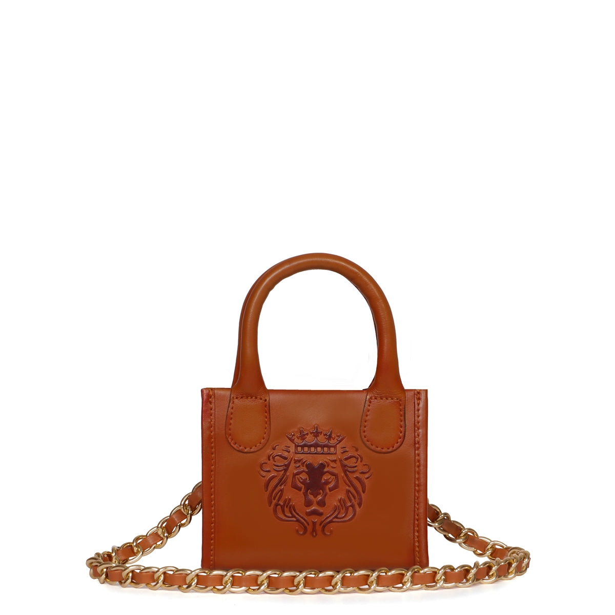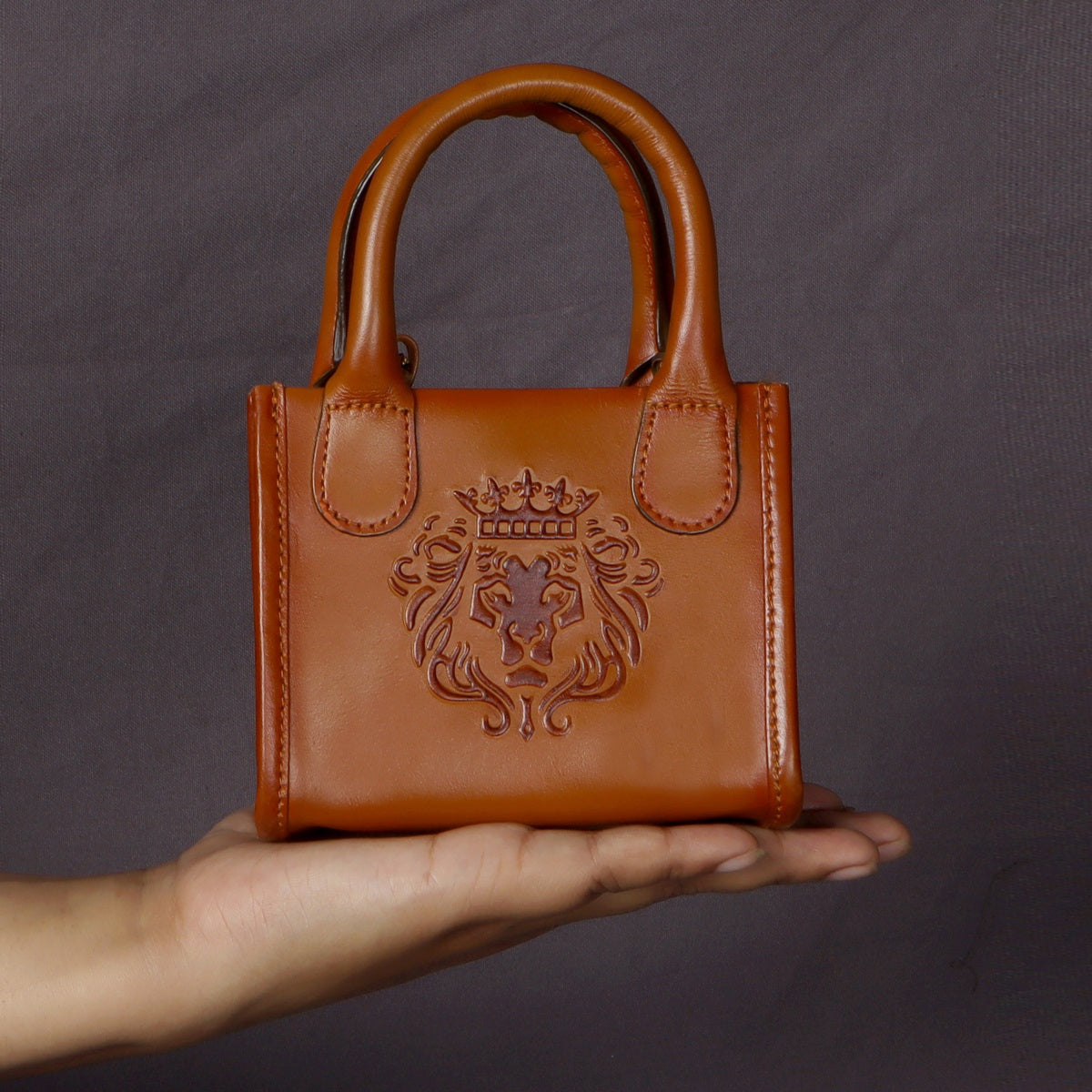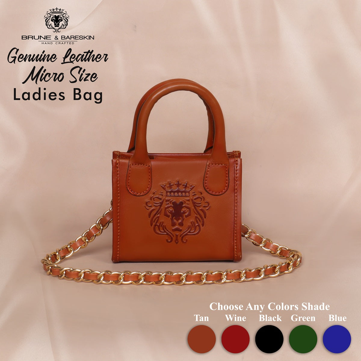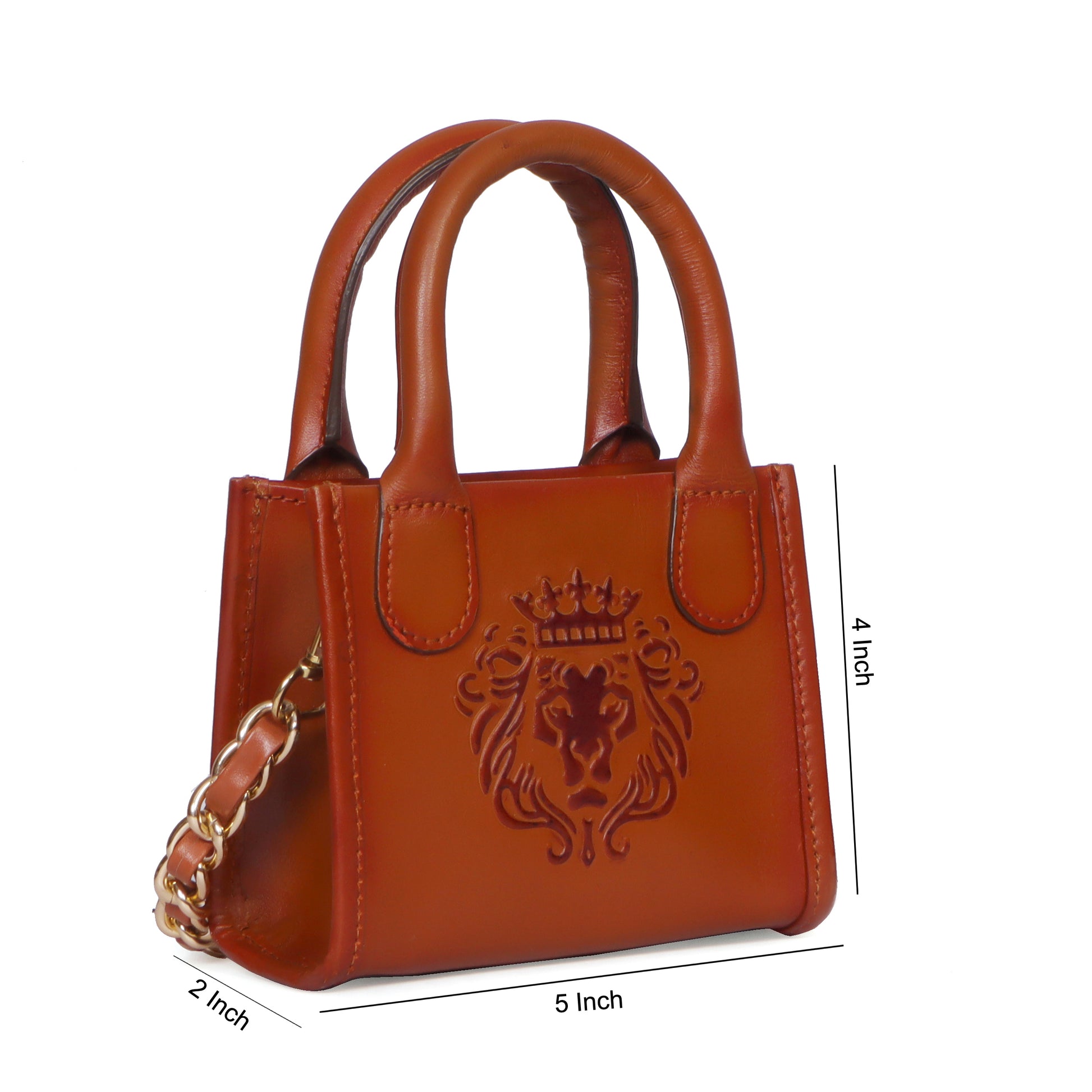 This Micro Tan Genuine Leather Women bag is one of the most easiest to carry along with spacious space. This Micro Sized leather Hand Bag looks very elegant. This trendsetter Genuine leather bag with Embossed Lion Logo on the front looks astonishing. It is perfect for a Travel. The ample space allows it to carry for travelling. The main button compartment provides the extra security to it. This bag is quite very handy for the traveler's as well. It provides the easy access to the needy essentials. Stylish look makes it an eye catching accessory. This Ladies Hand Bag for the modern entrepreneur, stylish in appearance with its Size its gonna be an eye stopper. 100% pure genuine leather is used for making your style. This hand bag can be personalized with your name initials in any color shade and in any size with our bespoke services. This is a must-have addition to your fashion collection.