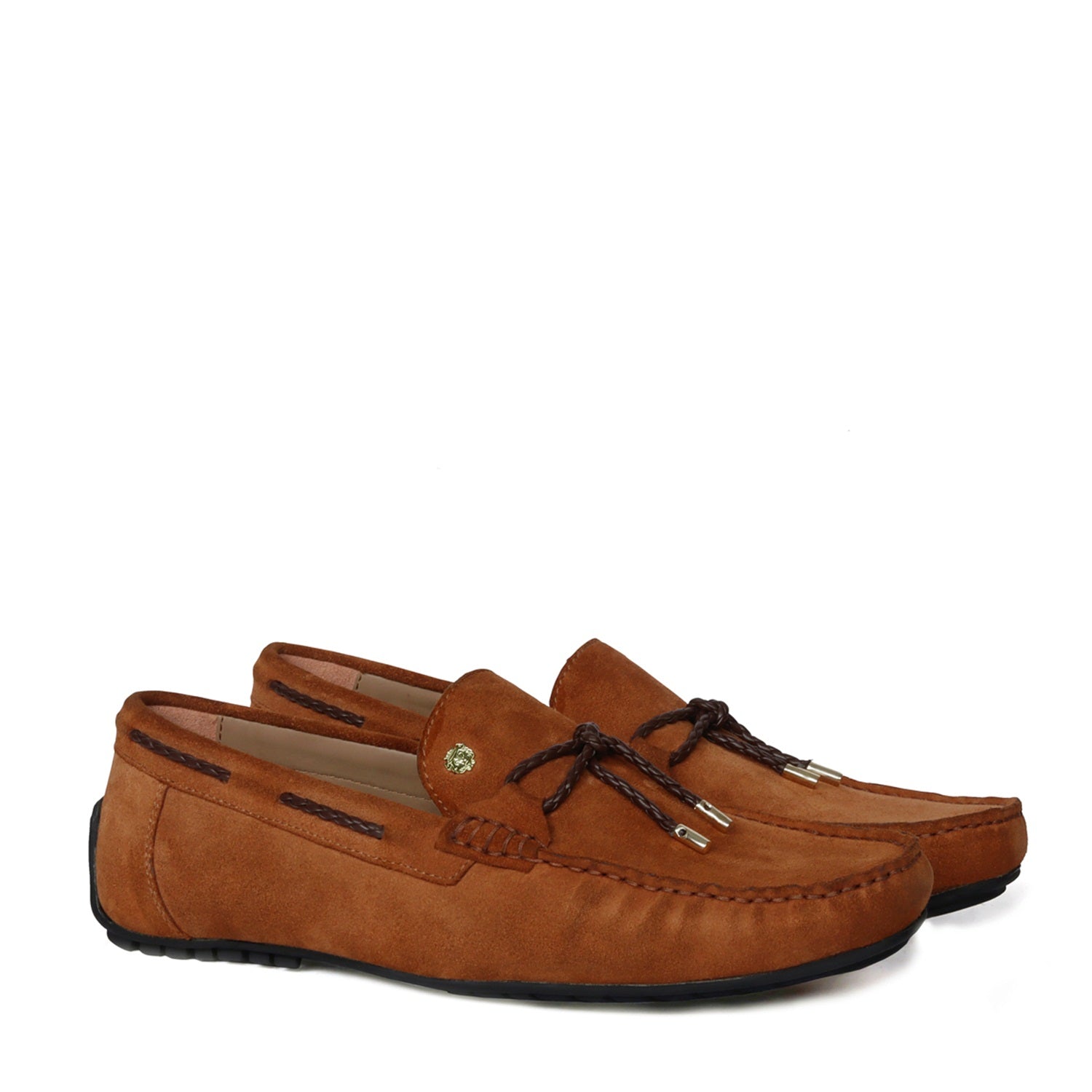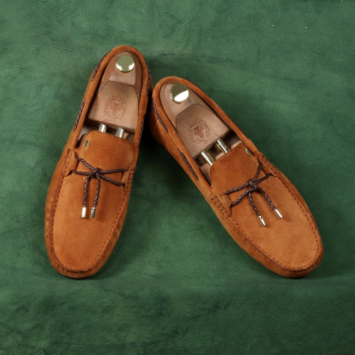 Hand Weaved Tassel Bow Loafers with Mini Lion Orangish Suede Leather