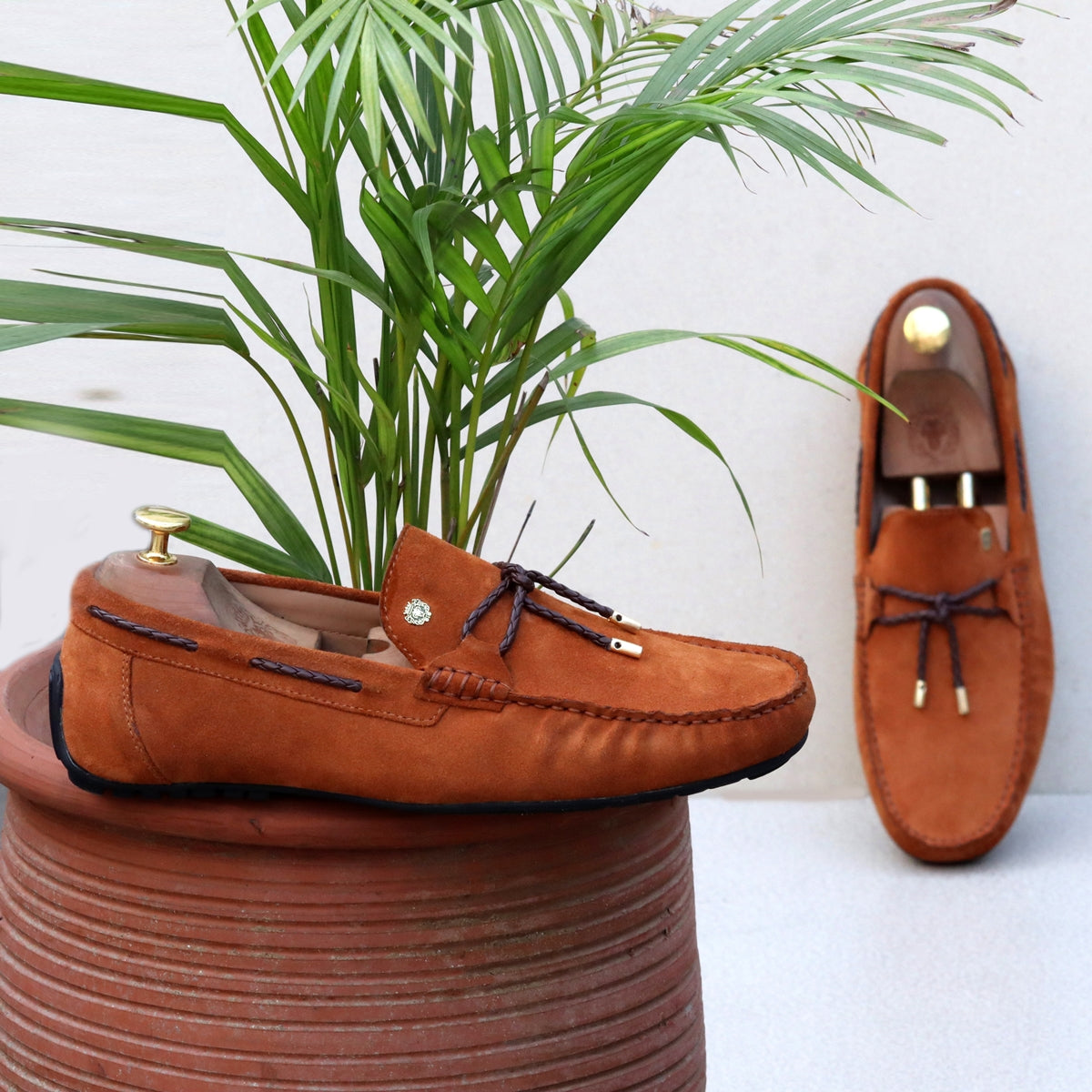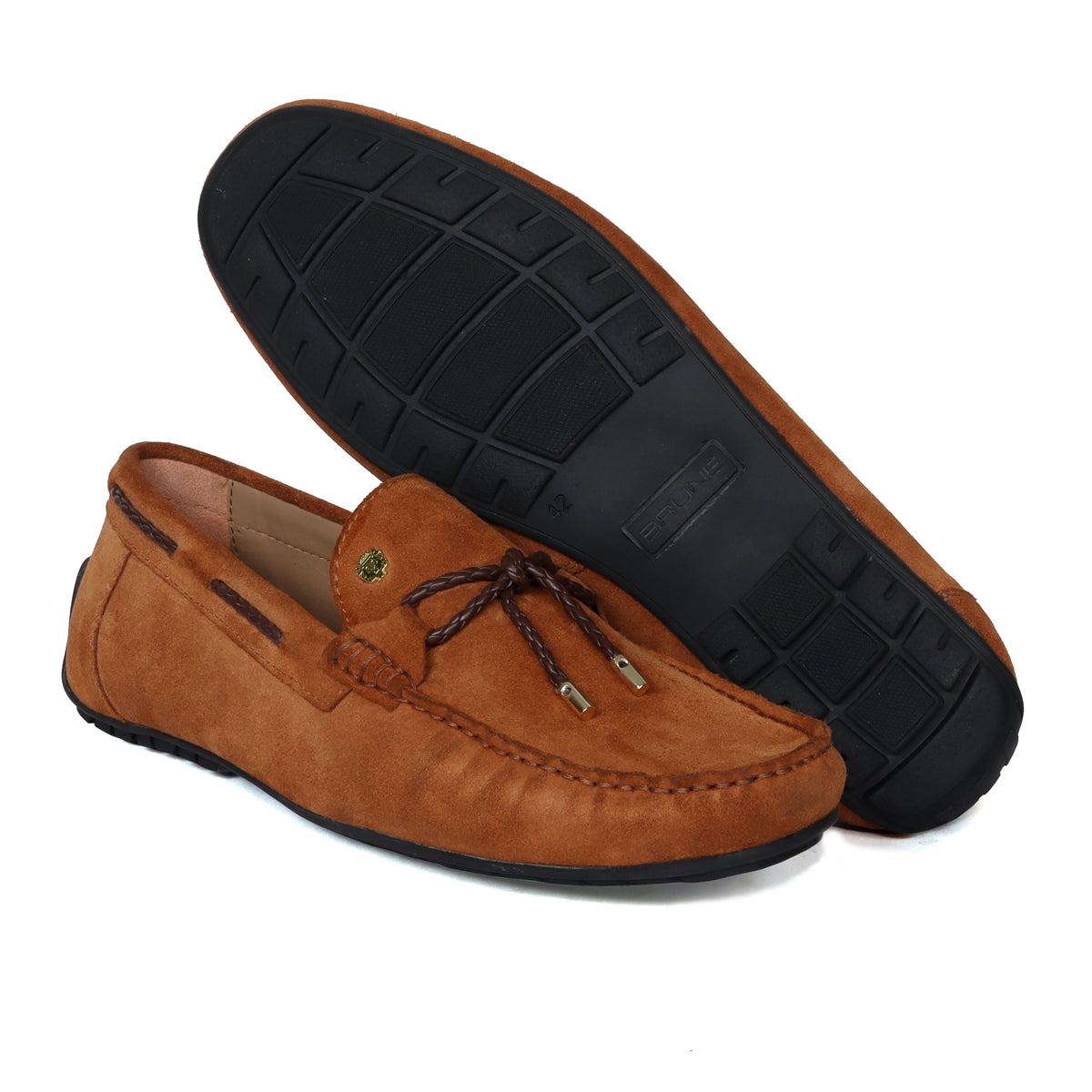 A modern twist on the classic loafers shoe is style thing to admire. For Genuine Suede Leather shoes, with style, choose to wear this pair of hand crafted leather shoes by Brune & Bareskin. The trendy hand weaved leather bow is one-of-a-kind design and indicates your style preference. The Tassel Bow on the orangish Suede leather enhances the chic style further. Brune & Bareskin's introducing special Design the Micro Size Lion Logo to add an extra elegance For different products. The Stylish Mini lion logo enhances its appearance further. These hand-crafted shoes have the memory foam insole to provide you the all day long comfort.