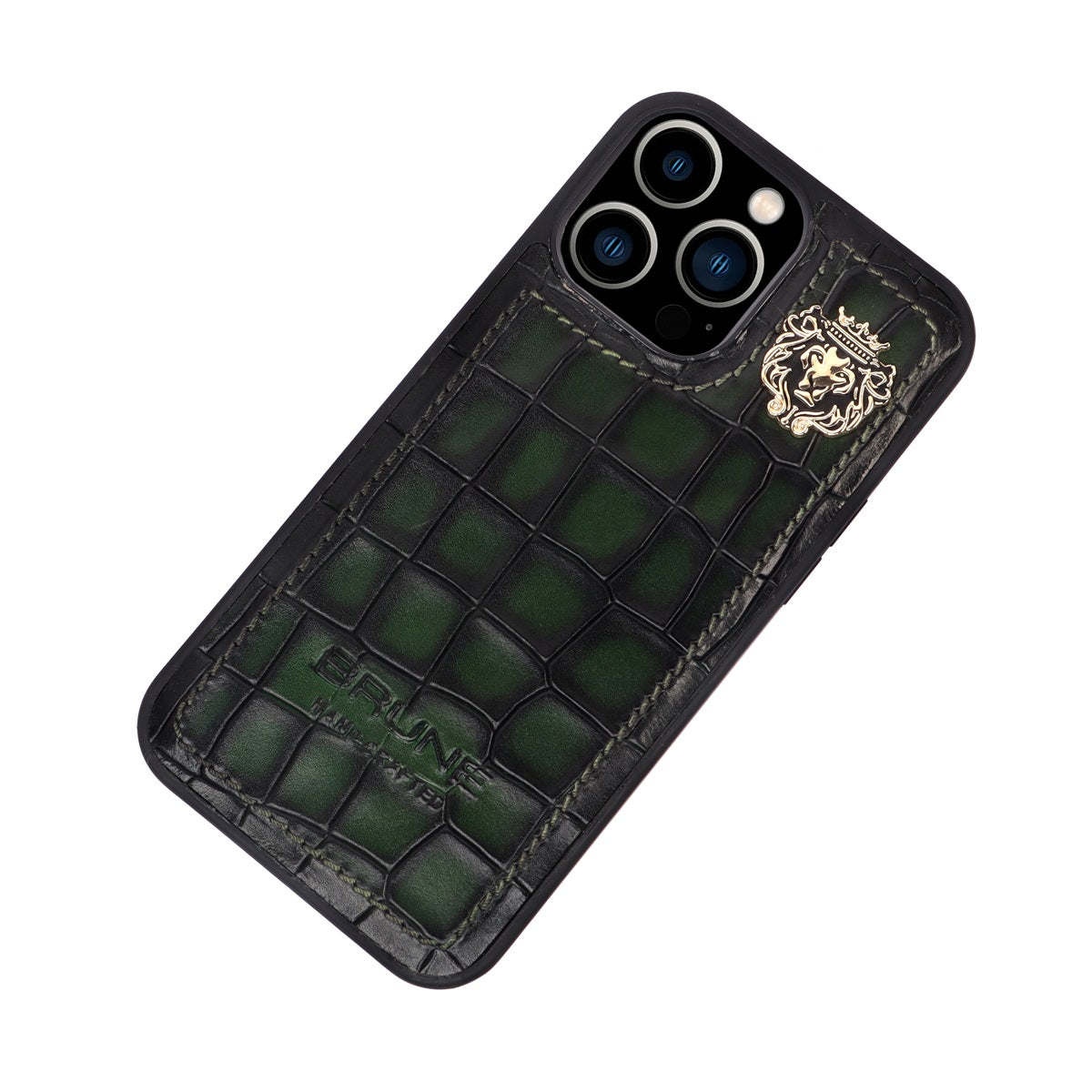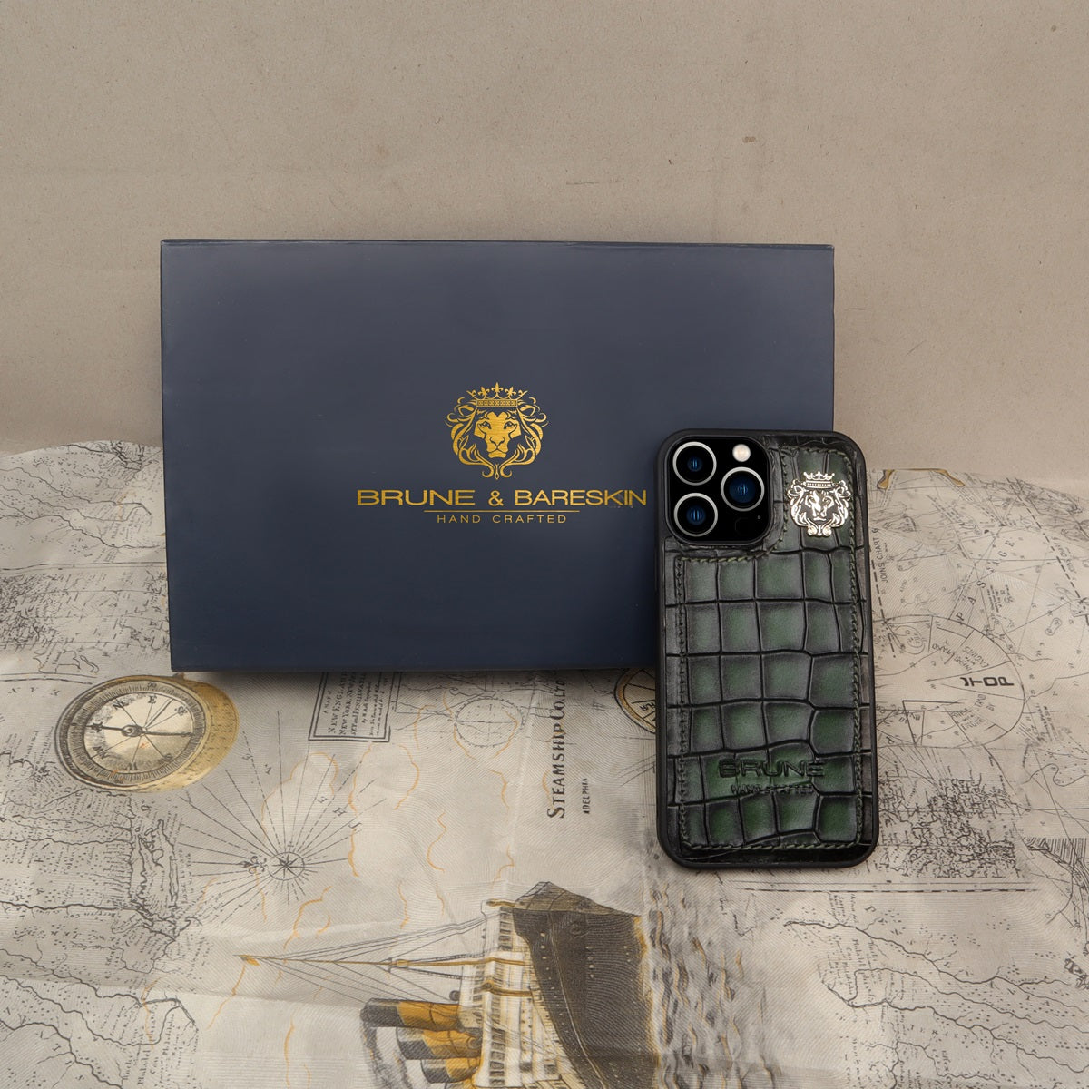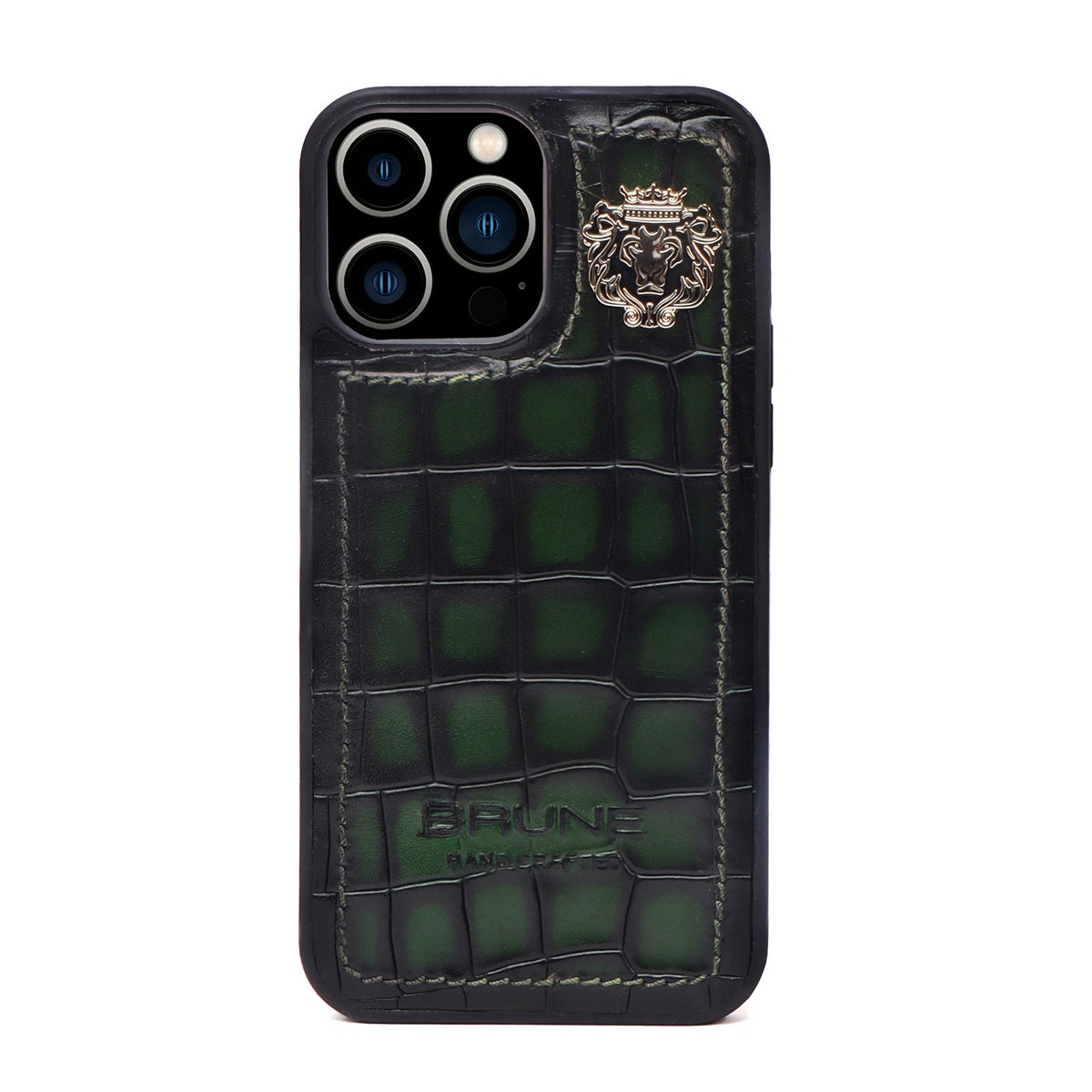 This time BRUNE & BARESKIN has come up with more ease to your accessory, it's an elegant mobile cover in green deep cut croco leather. The metal lion logo leaves a remarkable mark of style. The hand stitched around the border provides more rigidity elite look to it. This high veg tanned leather will surely serve you for a very long time and one can get name Initials as well of their choices