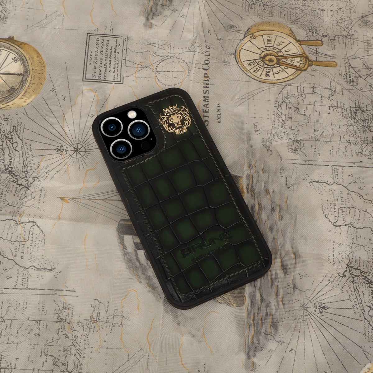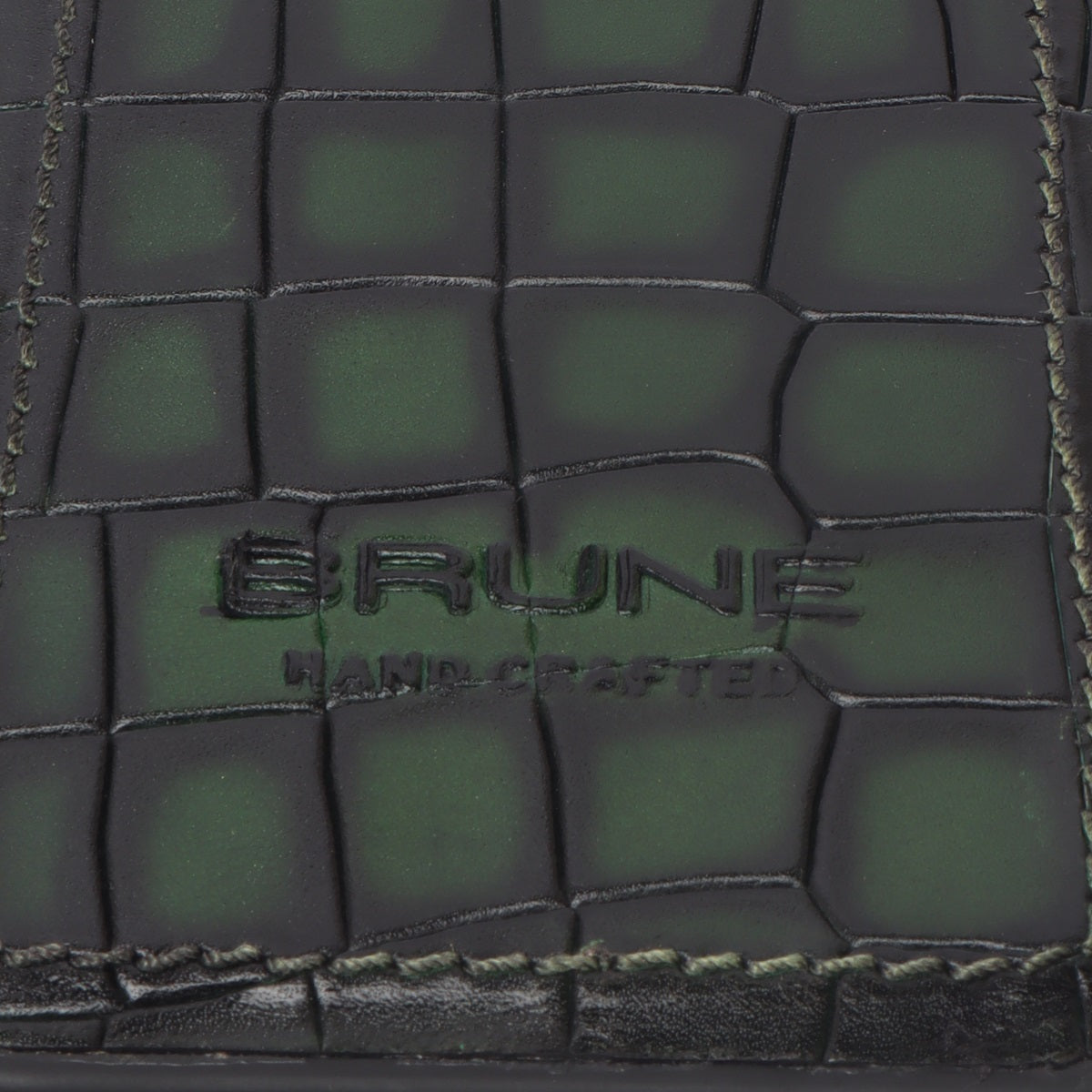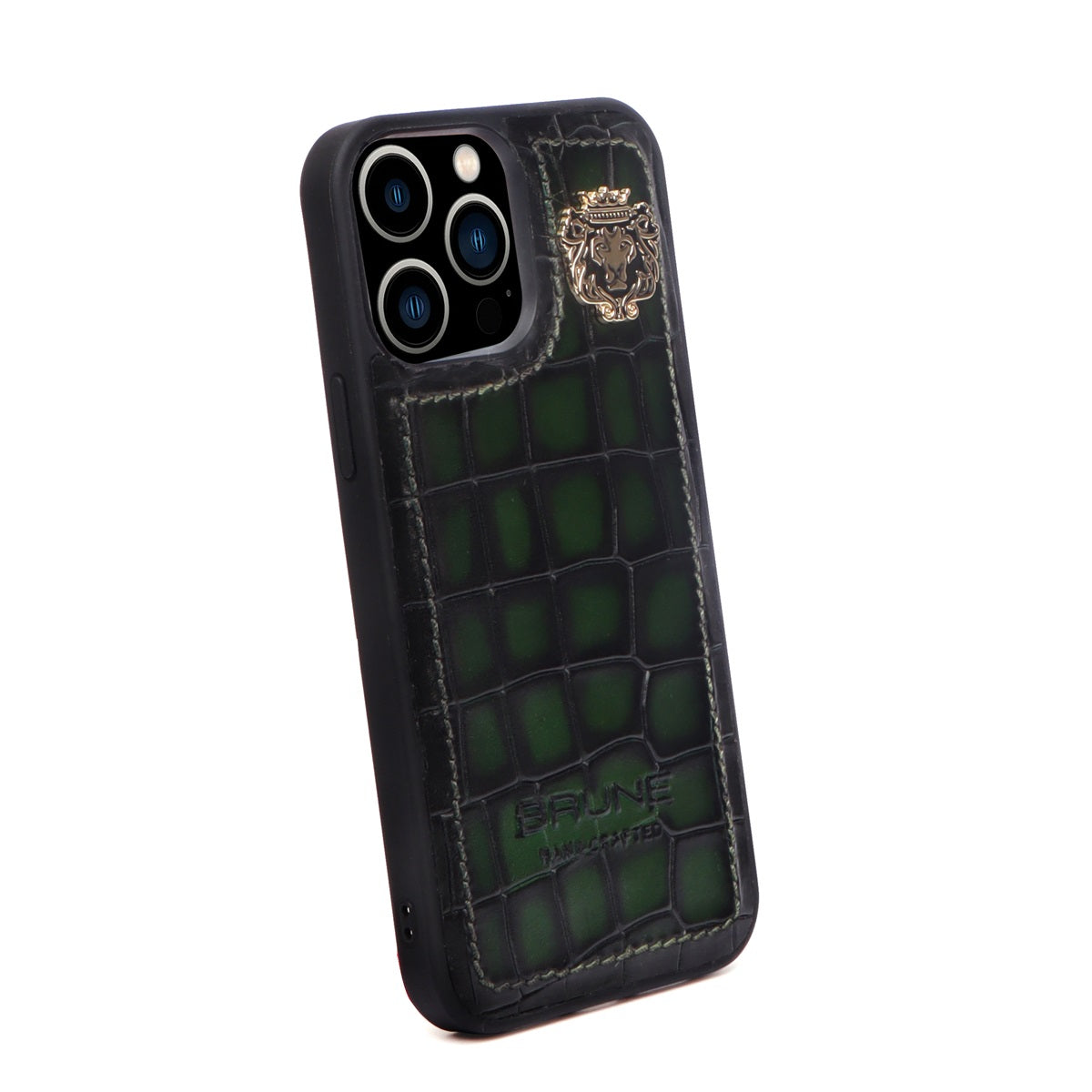 This time BRUNE & BARESKIN has come up with more ease to your accessory, it's an elegant mobile cover in green deep cut croco leather. The metal lion logo leaves a remarkable mark of style. The hand stitched around the border provides more rigidity elite look to it. This high veg tanned leather will surely serve you for a very long time and one can get name Initials as well of their choices