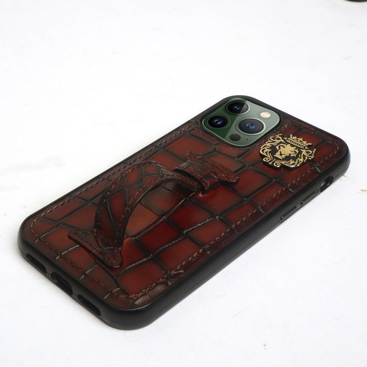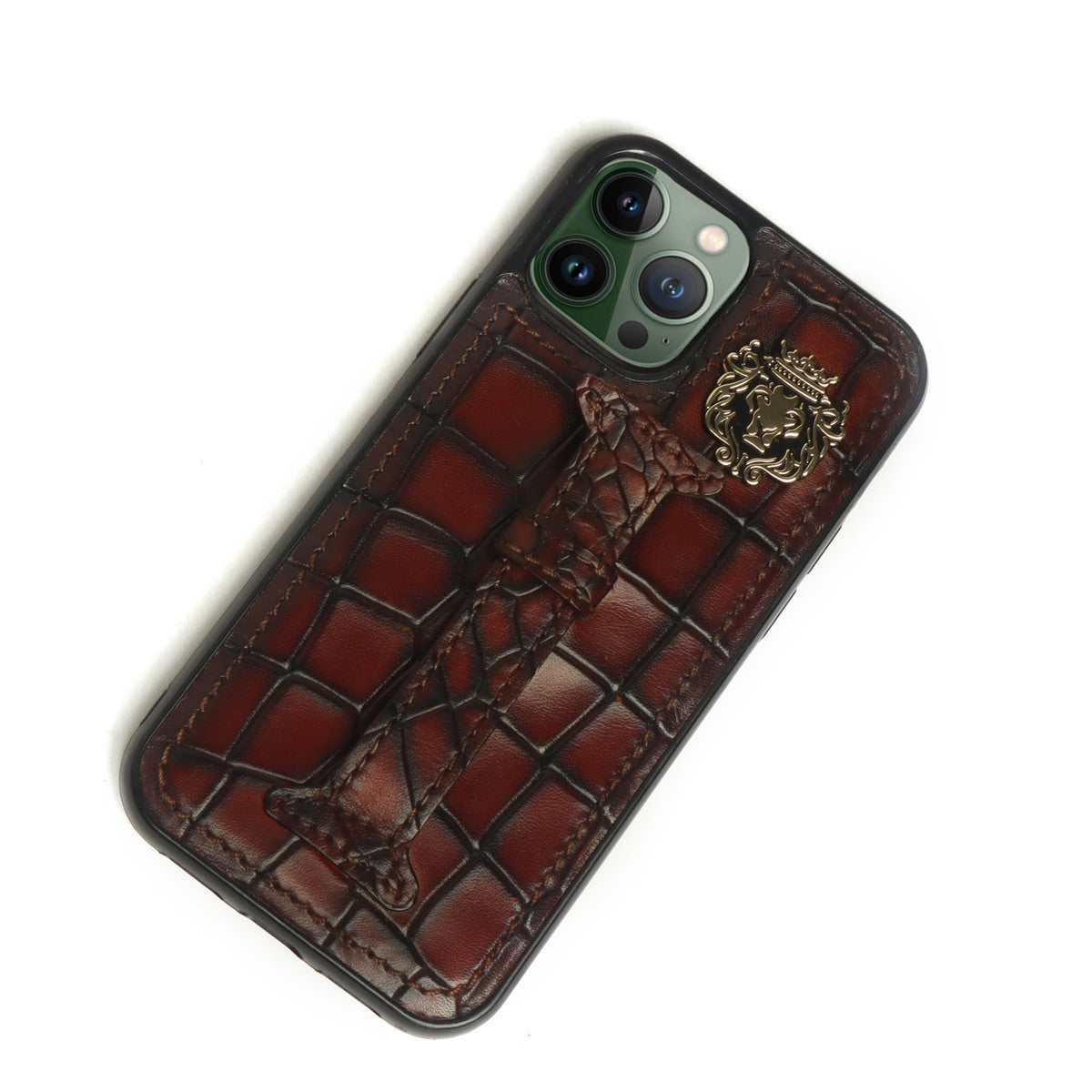 This time BRUNE & BARESKIN has come up with more ease to your accessory, it's an elegant mobile cover in cognac deep cut croco with a holding loop at the back to carry your mobile more comfortably. The metal lion logo leaves a remarkable mark of style. The hand stitched around the border provides more rigidity elite look to it. This high veg tan leather will surely serve you for a very long time and one can get name Initials as well of their choices