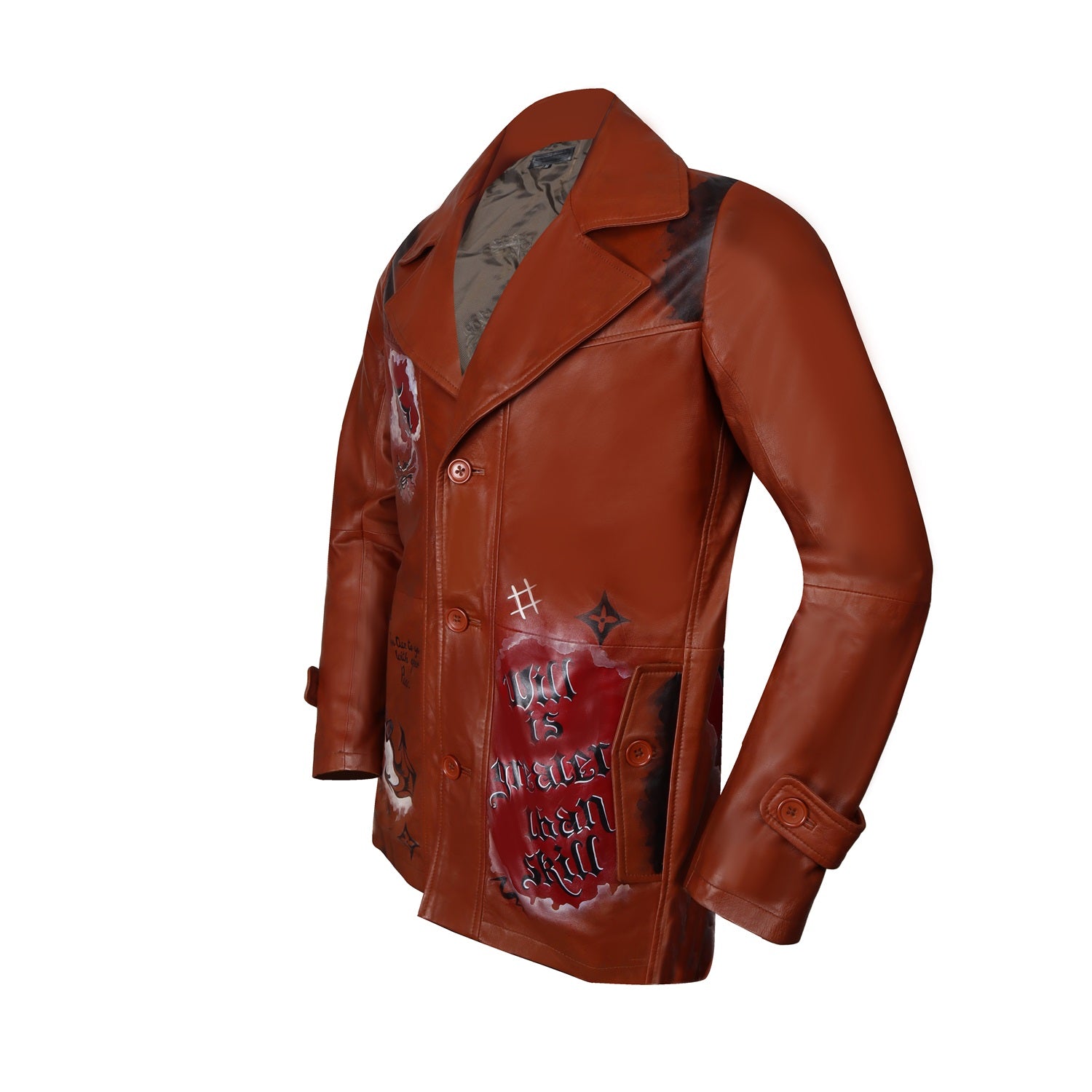 Hand Painted "Will-Skill" Multi-Color Quoted Tan Leather Jacket Coat By Brune & Bareskin