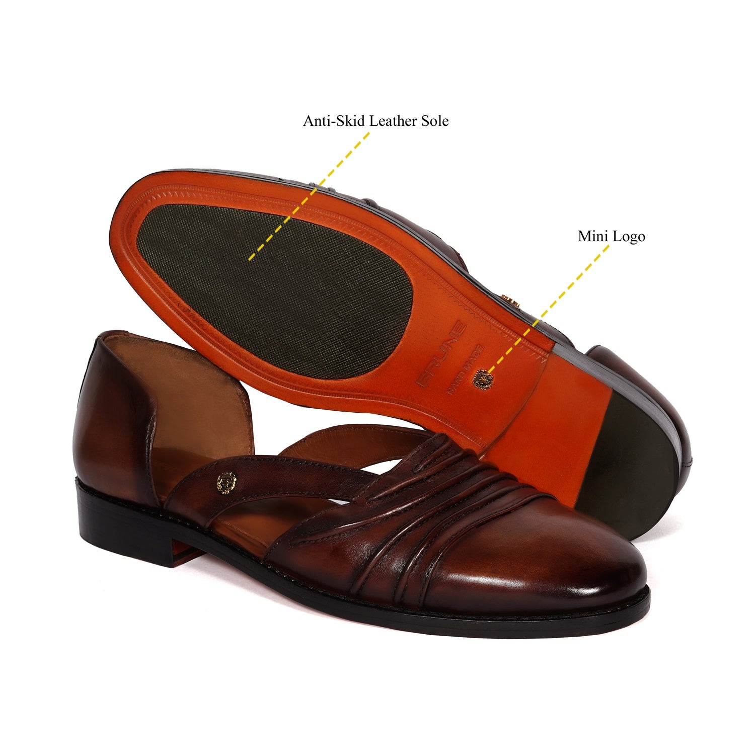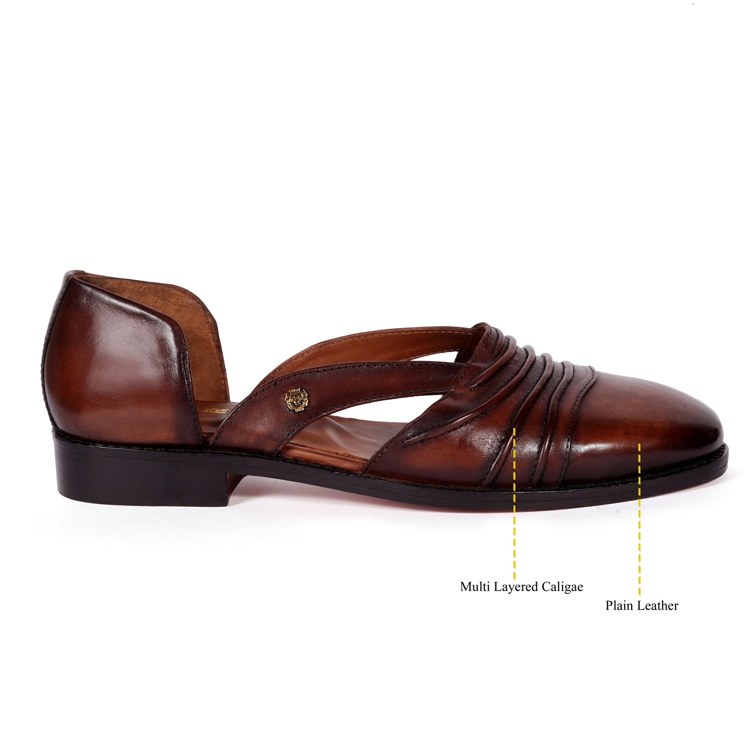 These genuine espresso leather Multi Layered Caligae Peshawari Sandals offer an unbeatable combination of style and craftsmanship. The patina finish on the leather gives them an elegant look, while the Multi Layered Forepart and side cutout panel add an eye-catching design. The mini metal lion logo and black Ombre highlight on top of the layer complete the look, all supported by the anti-skid leather sole. Perfect for special occasions or with ethnic wear.