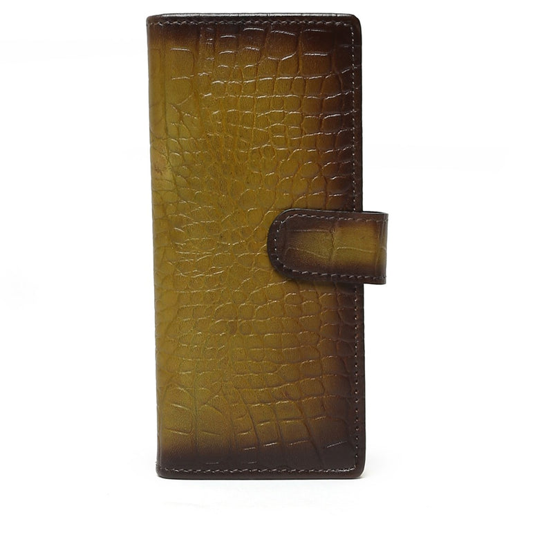 This bi-fold blue Croco print leather long wallet with contrasting smudged edges looks very elegant. The BRUNE & BARESKIN signature metal Lion brand logo appears on the opening of the wallet. Bi-fold opening wallet features two main pockets along with small secure pocket on both sides. It has the total of 16 pockets, which makes it a perfect buy for today's generation. It has the smooth magnetic strap to keep it close and secure enough. It provides the style and storage with Patina regime leather shades.