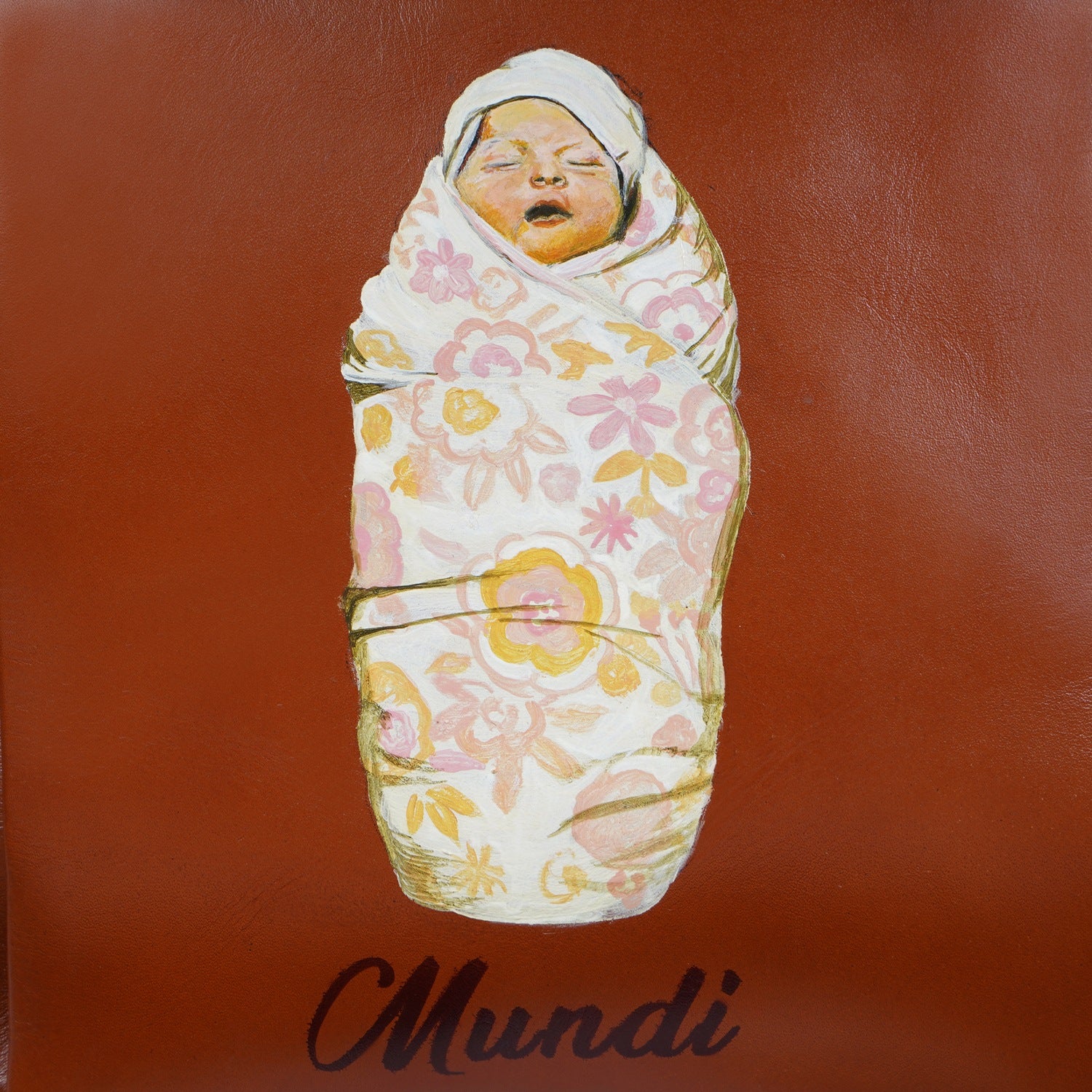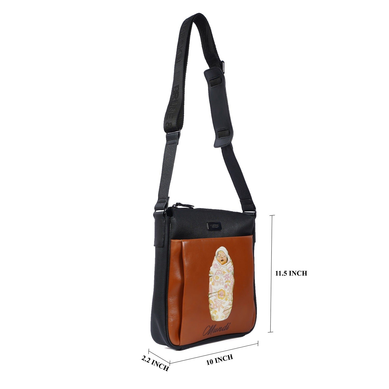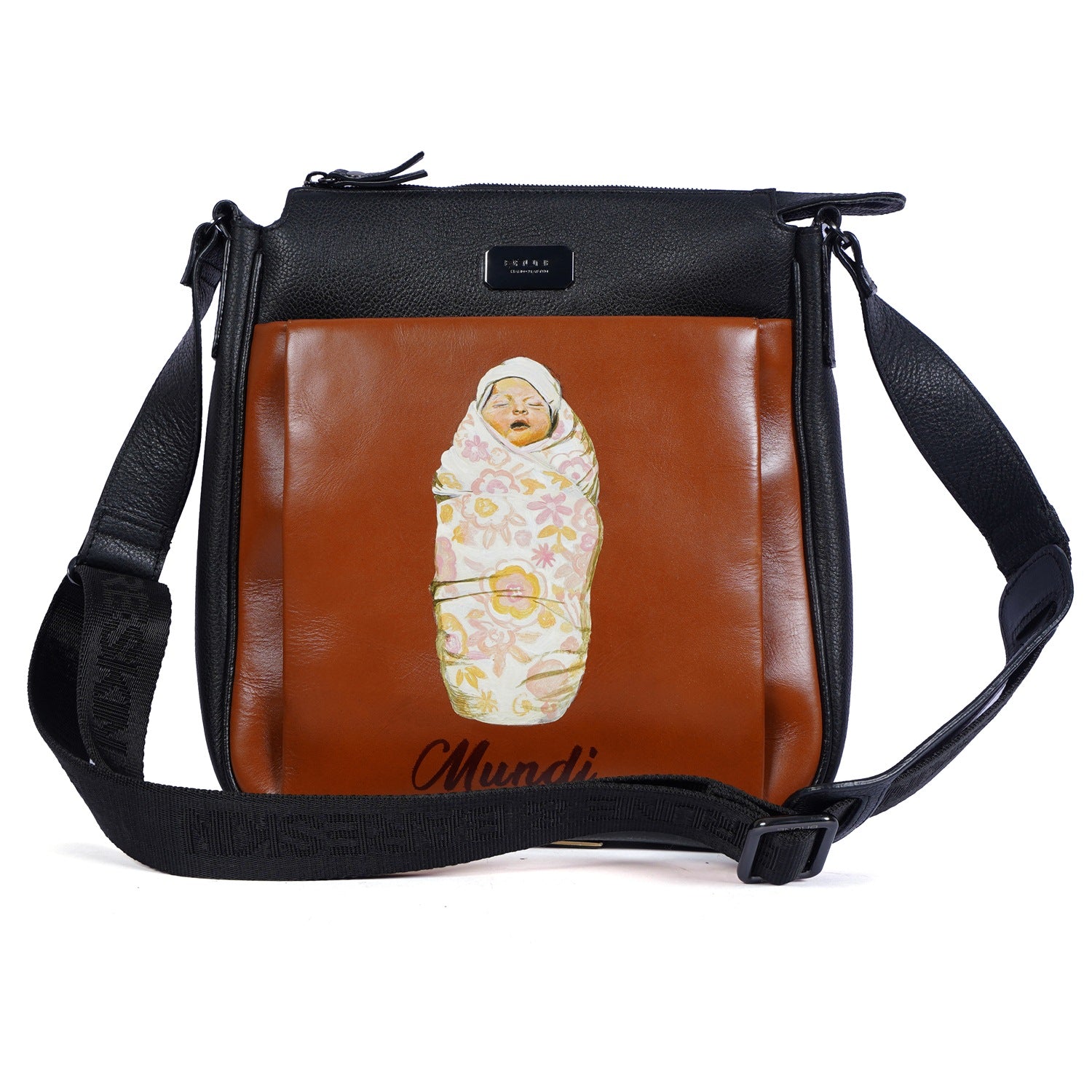 Capture your Emotional journey as new parents with our Custom Made Hand-Paint Bag featuring a personalized New Born "Baby Portrait". Express your unique love and create a memorable moment with Brand brune & bareskin. This premium quality genuine leather sling bag complete with a patina finish and adjustable branded mesh strap. This tan-black crossbody bag is a must-have for any new parent