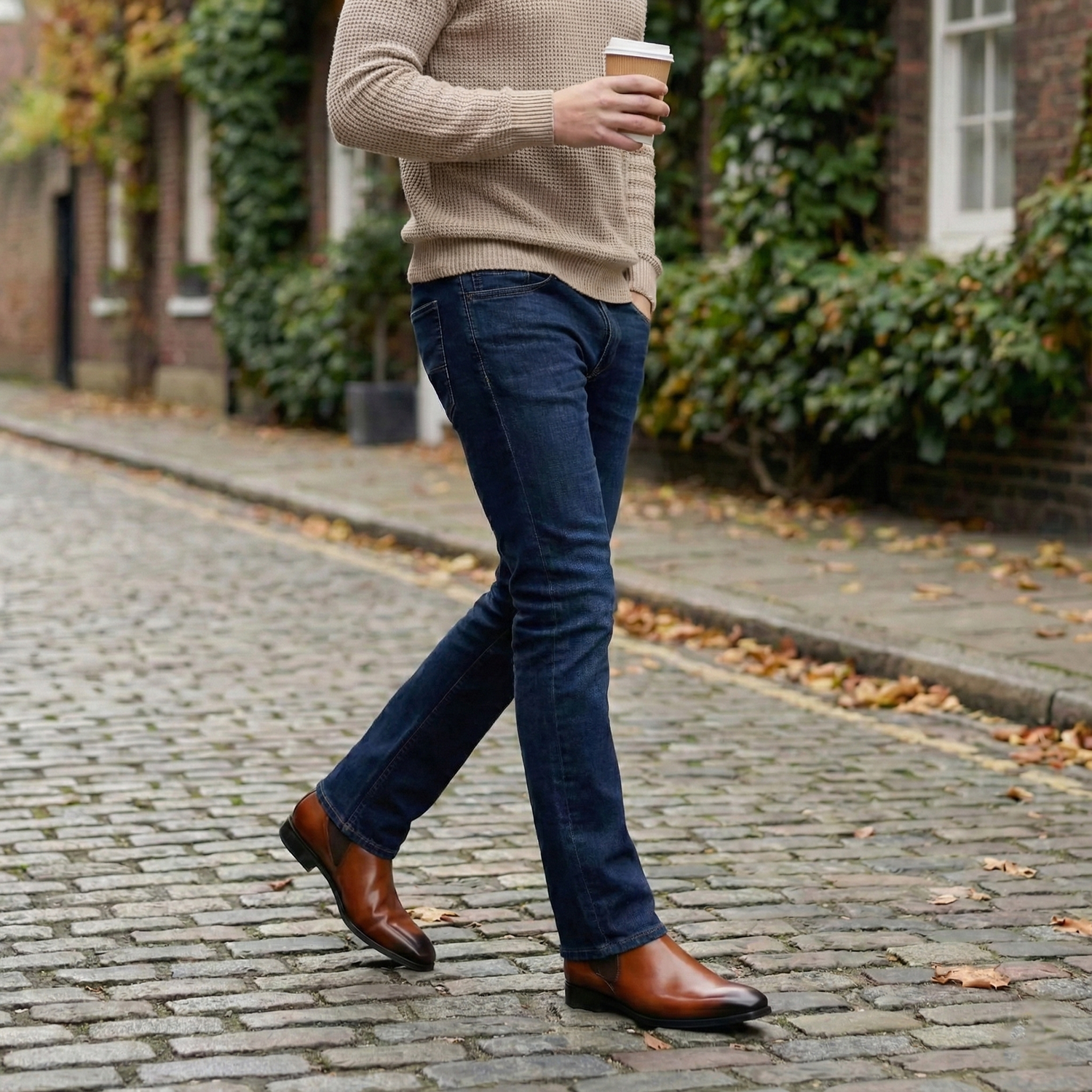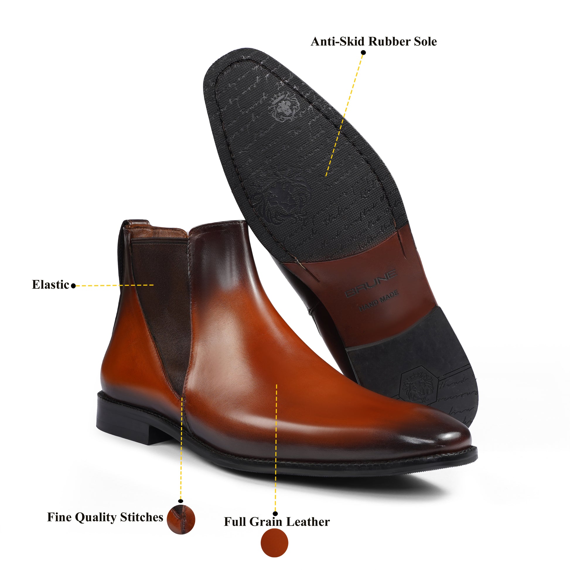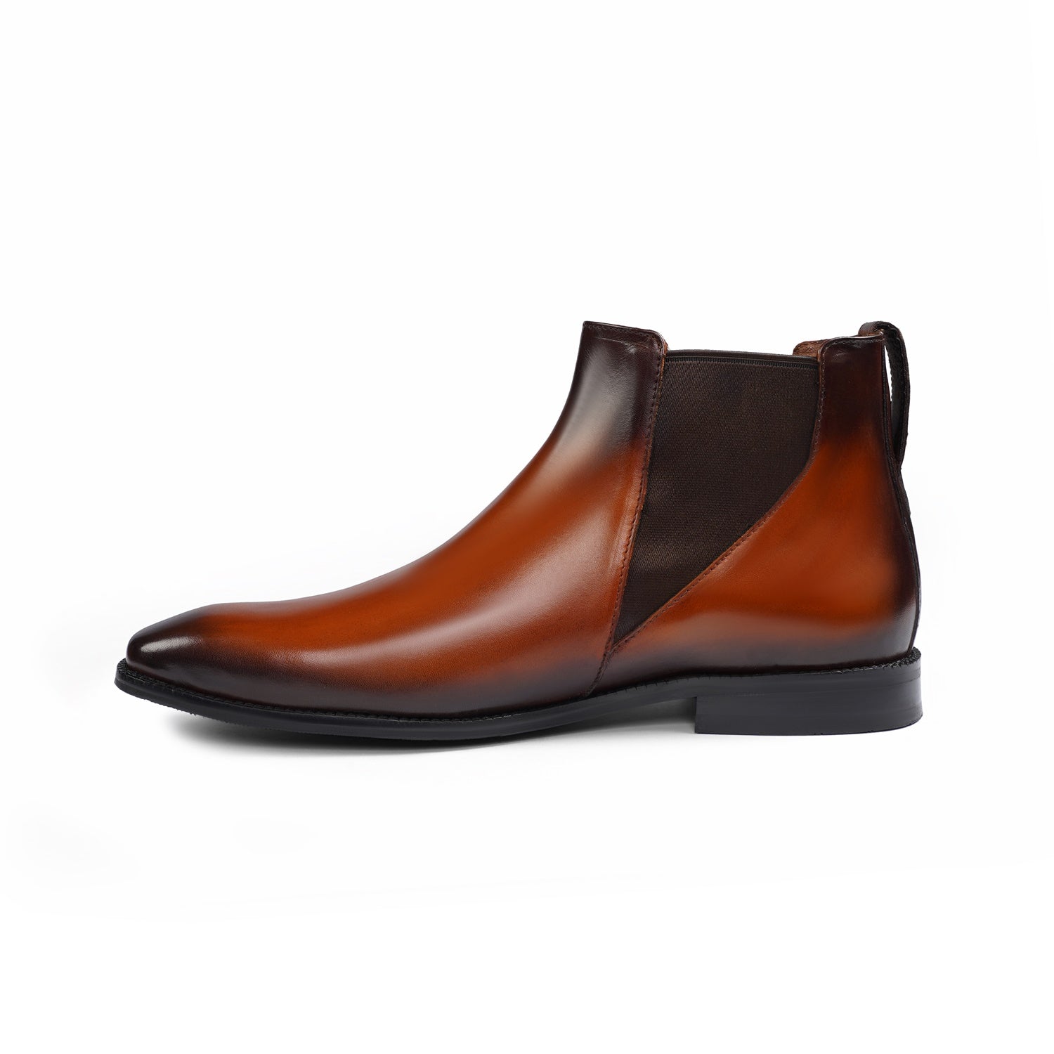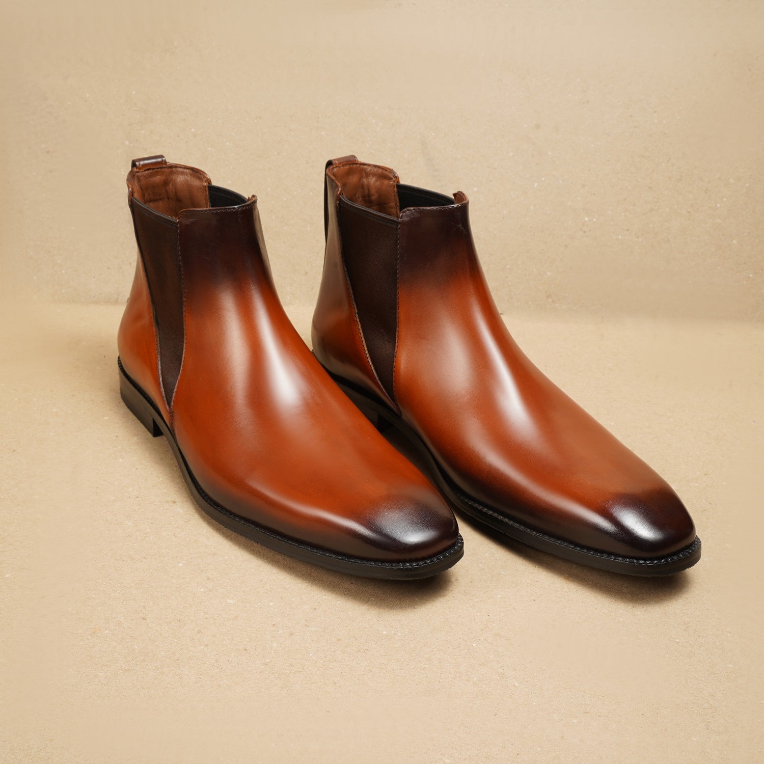 This high-ankle length Chelsea Boot-leather shoe can be customized to your liking. Tips of these pointed leather shoes are deeper tanned with the color running along the sides of the feet to the ankles. The greater detailing at the ankles with rectangular pockets in deeper tan, lend a classy look to these leather formal boots.