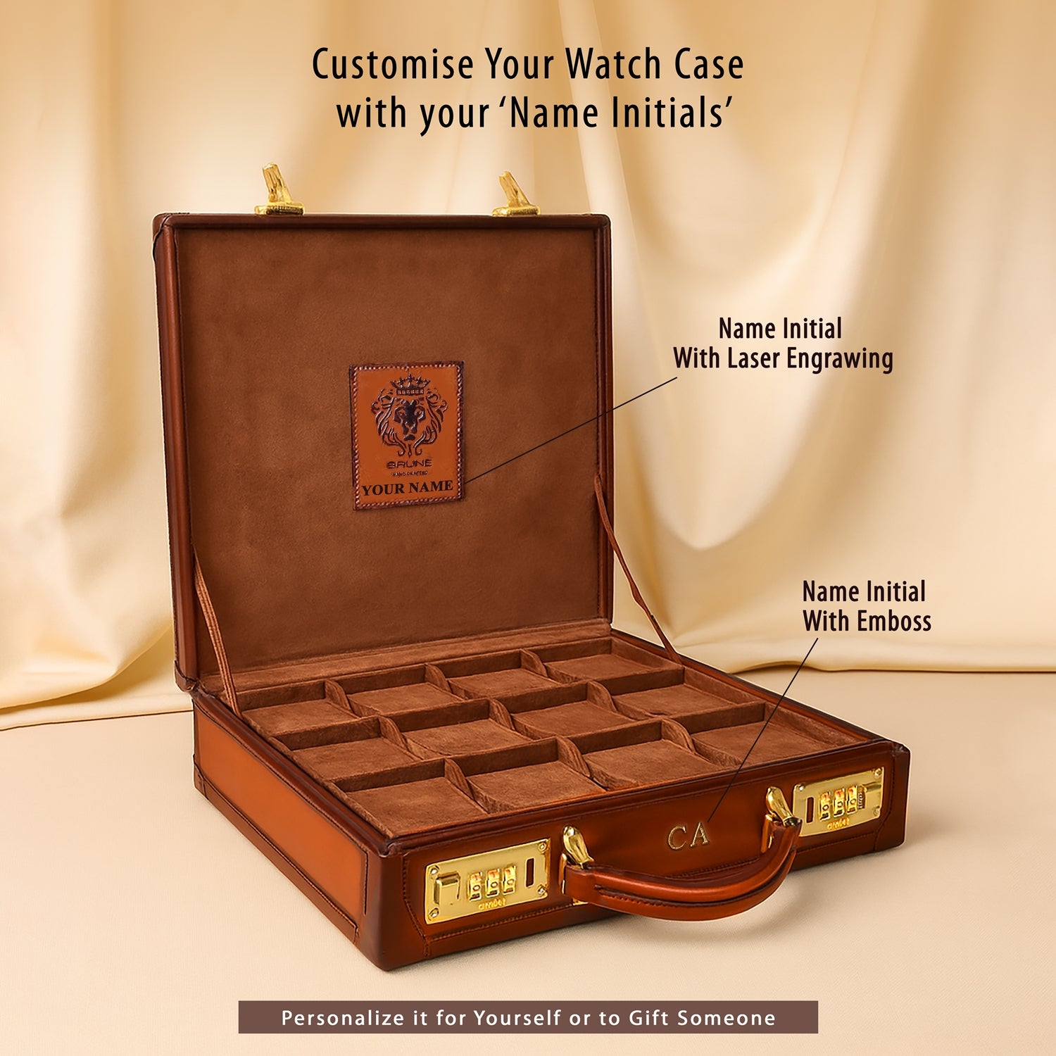 Wow... It's an awesome Deep cut leather watch carry briefcase by BRUNE & BARESKIN. You might have seen many watch covers in your life before, it is one of the most sophisticated & luxurious watch case you can buy in genuine leather. This Smokey finish wine cut croco textured leather wrist watch carry briefcase provides the ample space to carry your watches with security and style. Brune & Bareskin's signature metal lion logo on Front looks very elegant. The genuine leather made ensures the longevity of this carry case. The perfect blend of outer hard casing and the internal suede leather lining provides protection while travelling. The Number lock mechanism add an extra layer of security to it. You can carry 12 watches in it. You can get it made in any color you want along with your logo & name initials with our bespoke services.