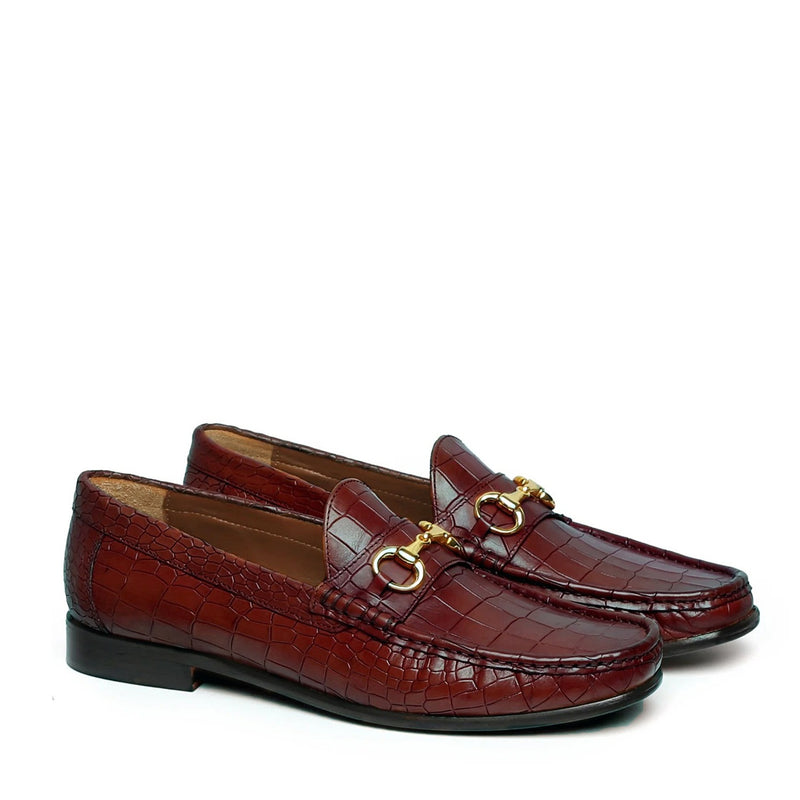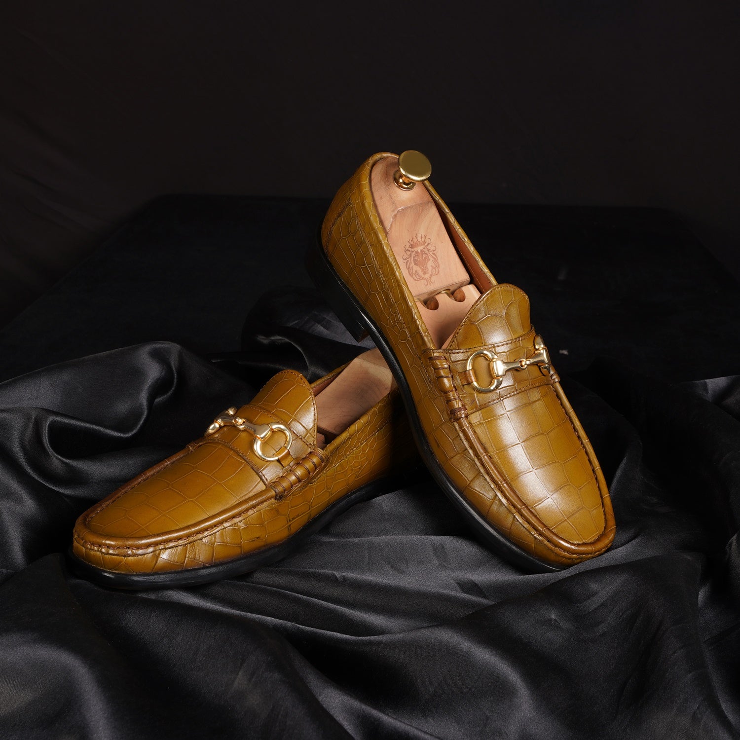 A modern twist on the classic moccasin slip-ons shoe is style thing to admire. The deep cut croco print leather looks very elegant. The golden horse-bit on the croco textured tan leather enhances the chic style further. The hand painted burnished effect on the genuine leather surface showcases the masterpiece level art. The contrasting leather sole glorifies the overall accent of the shoe.