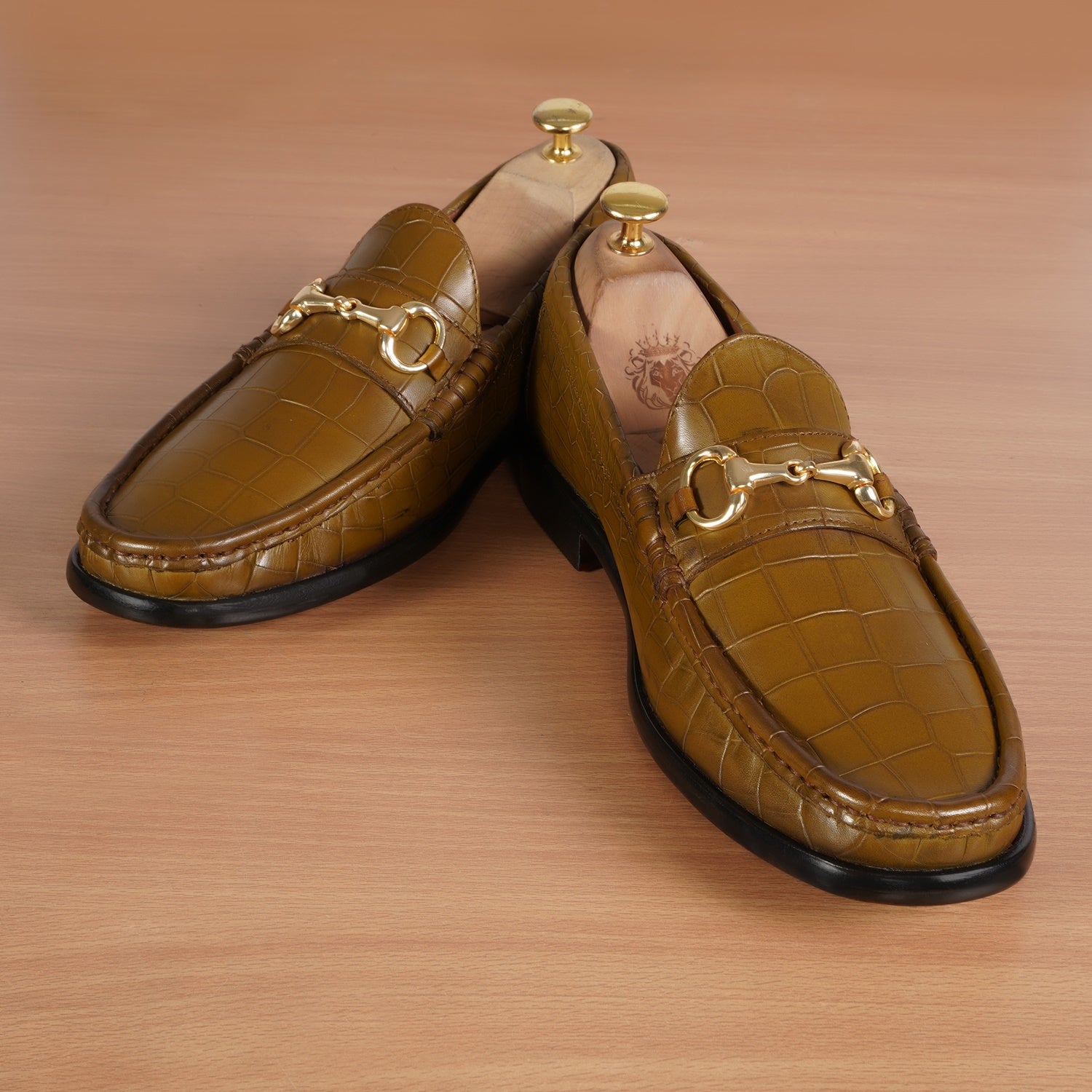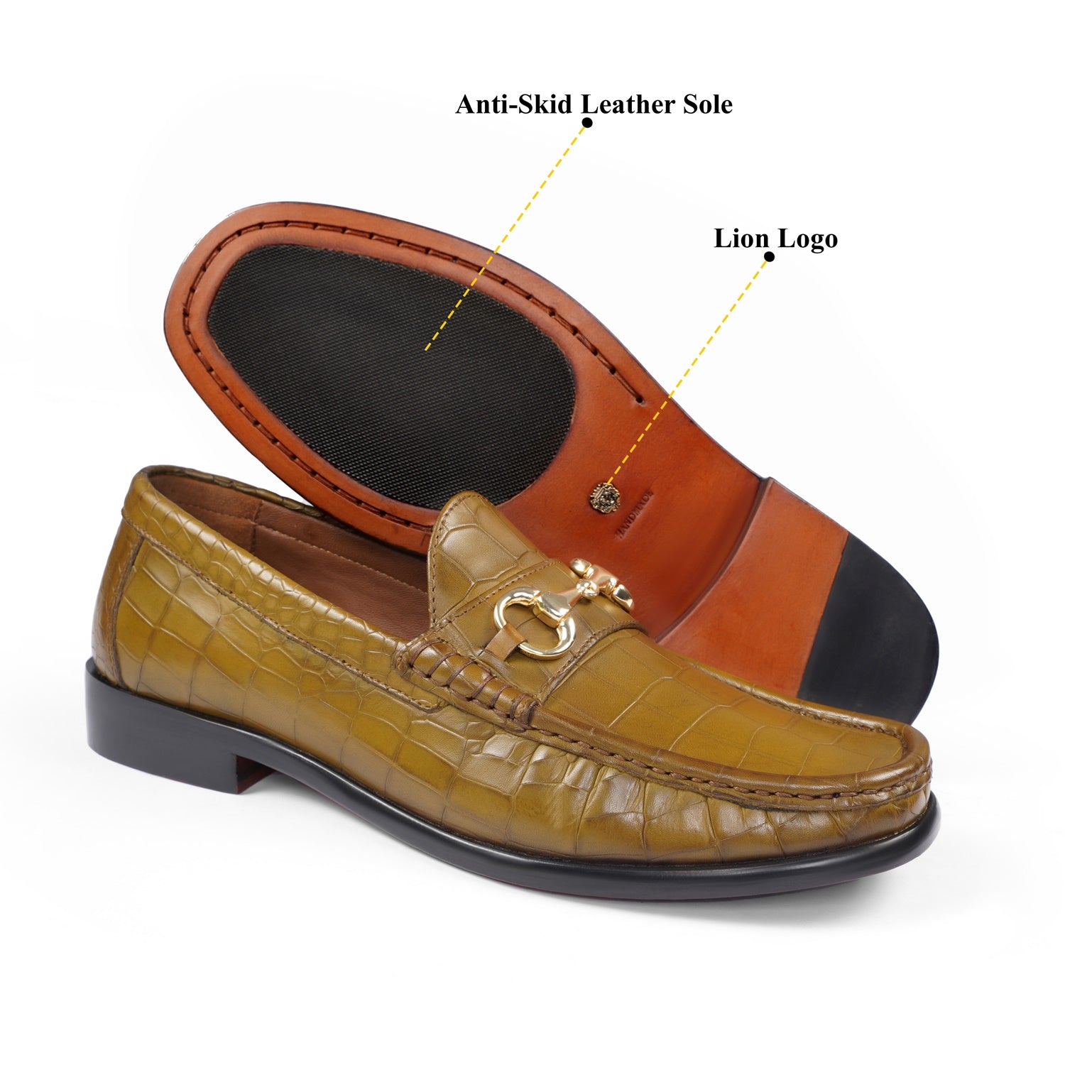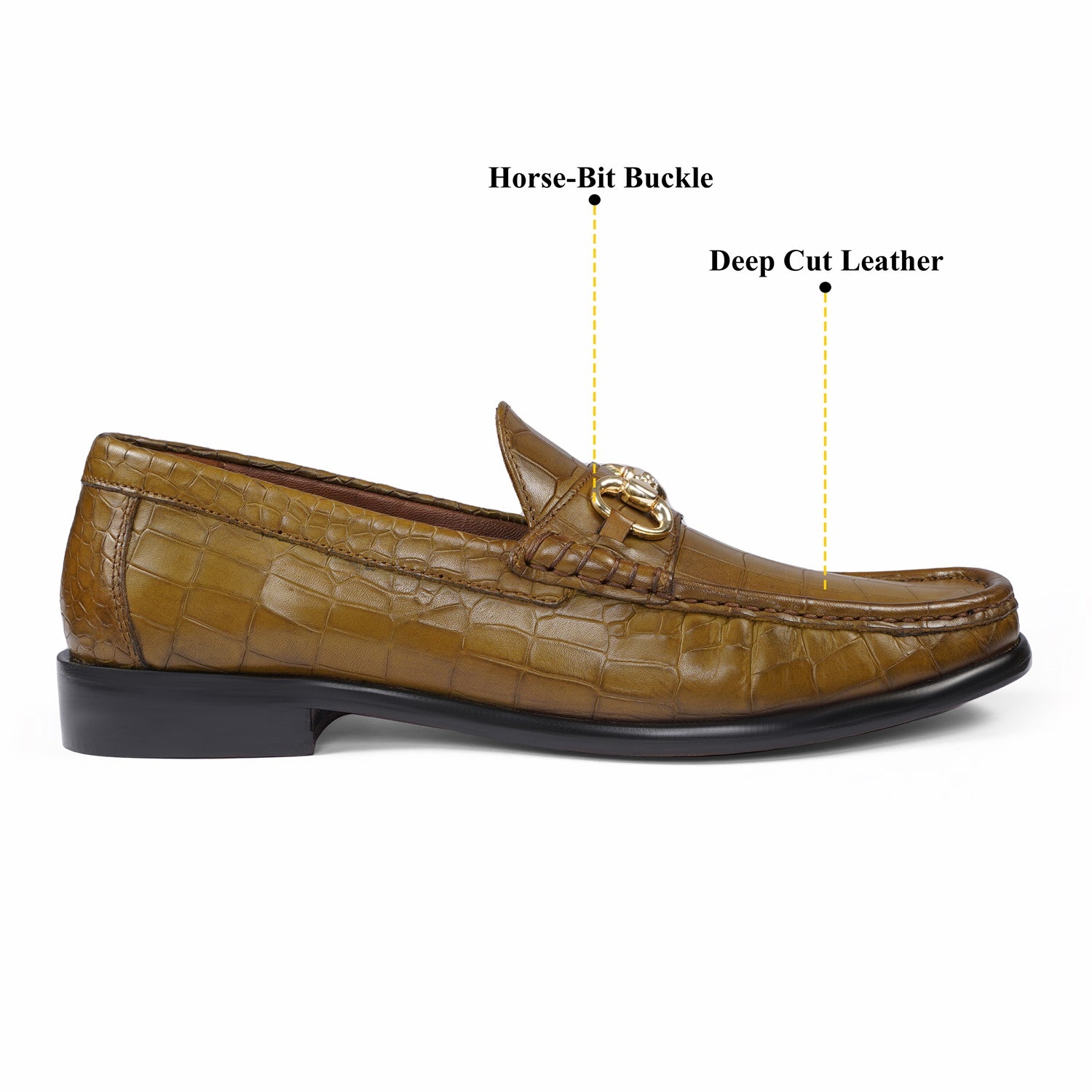 Olive Deep Cut Croco Texture Leather Loafers with Horse-Bit Buckle