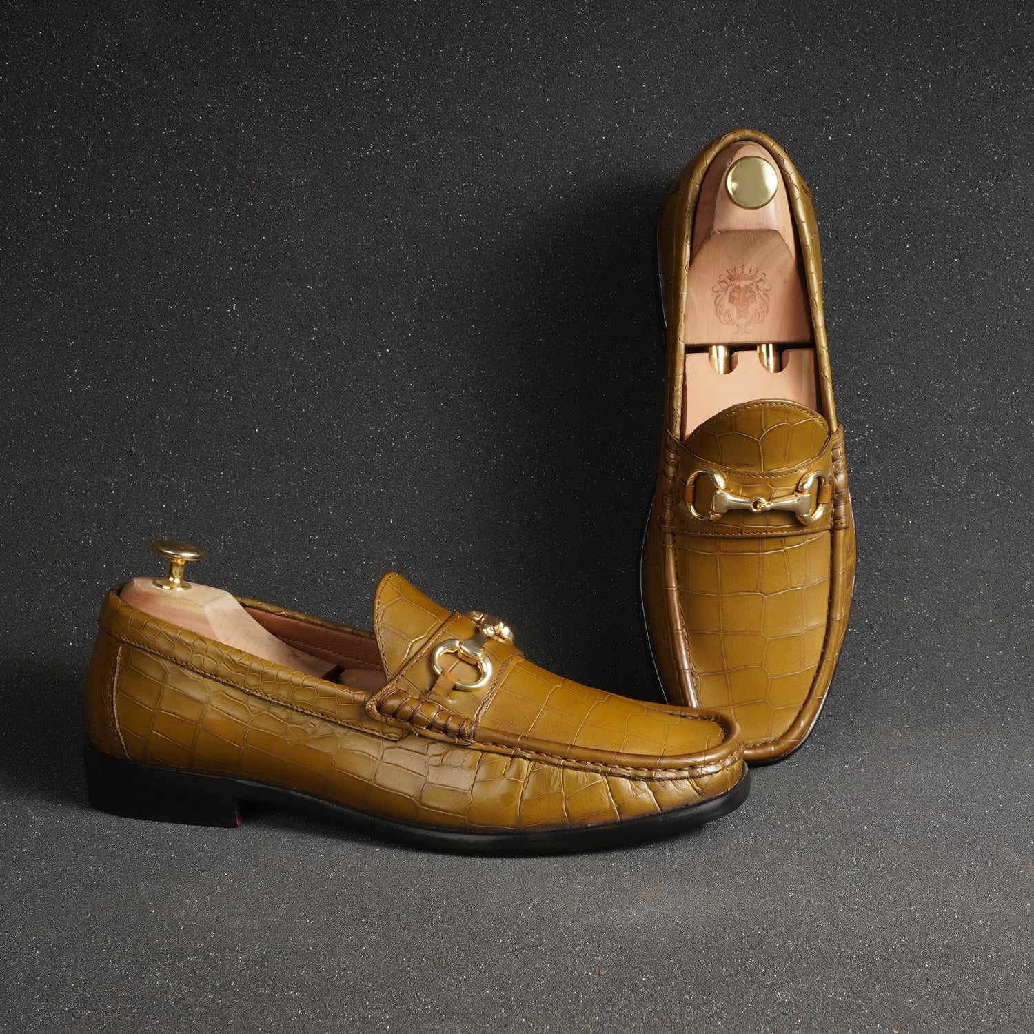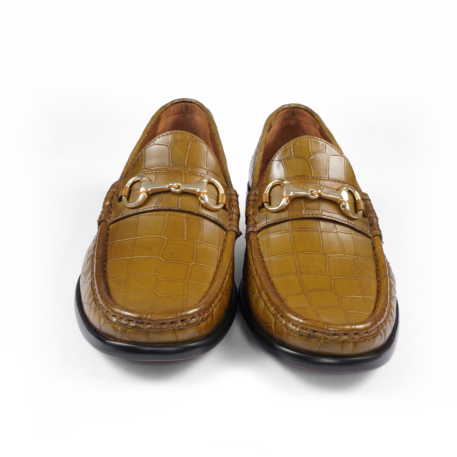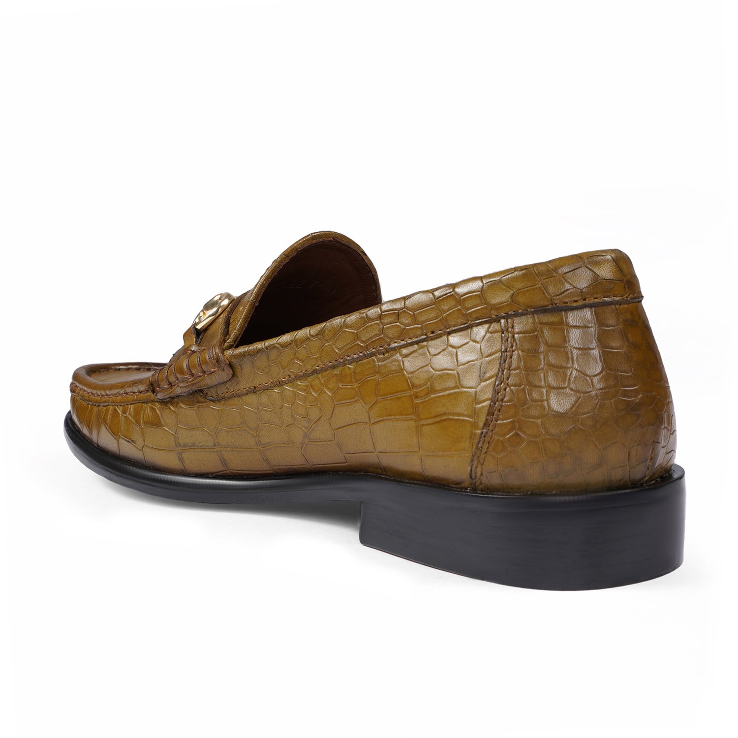 Olive Deep Cut Croco Texture Leather Loafers with Horse-Bit Buckle