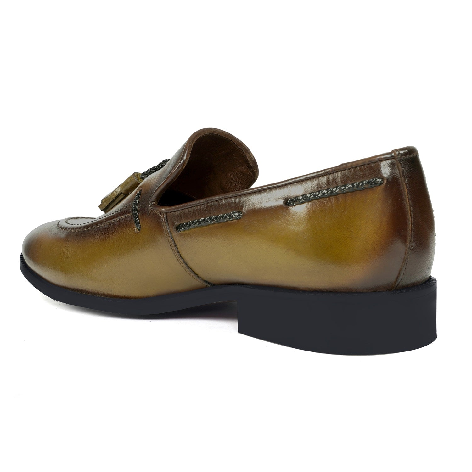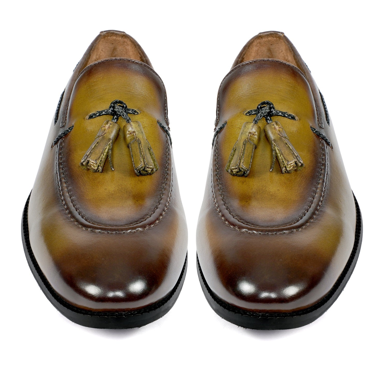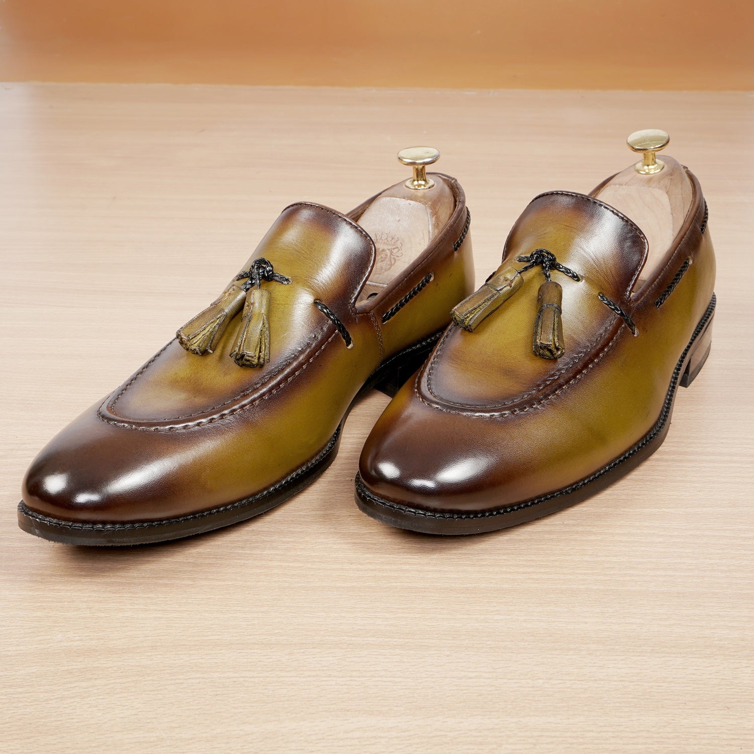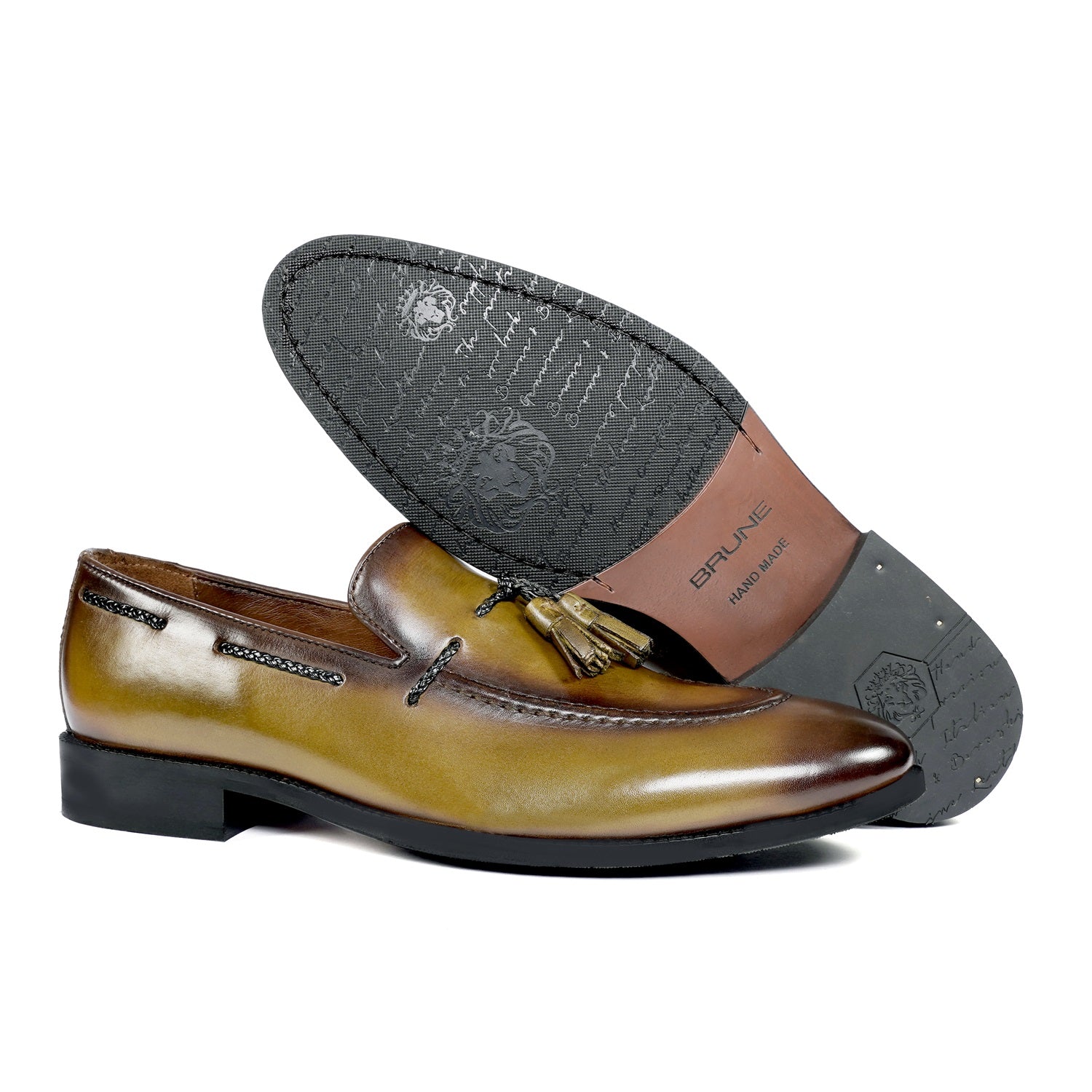 For Genuine Leather shoes, with style, choose to wear this pair of hand-painted leather shoes by BRUNE & BARESKIN. The trendy leather tassel is one-of-a-kind design and indicates your style preference. These hand-painted shoes are finished using Patina colors which are hand applied after the shoe is fully constructed. hence the reason we take a few more extra days to deliver as every product from BRUNE & BARESKIN is Made For You. The specific kind of sheen comes with a uniform multiple use of Natural creams and not any glossy artificial quote., making them very attractive footwear for any evening or a subtle corporate event