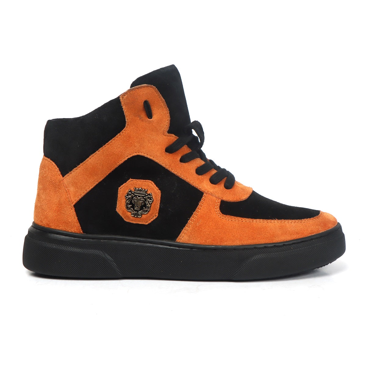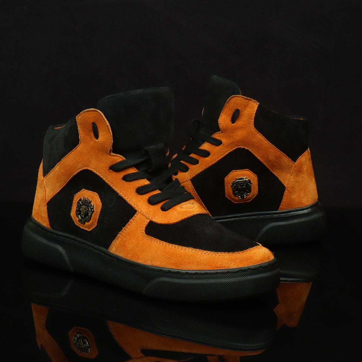 These orange suede leather sneakers are made to provide the elegance, style and comfort. Contrasting black suede leather compliments the orangish color shade leather kicks. It is entirely handcrafted from precisely selected highest quality materials. The lace-up design provides a snug fit and extra padding on collar provides the all day long comfort. The classic design make these sneakers an instant favorite of all sneaker lovers. These sneakers are the perfect style investment. You can get it made in your required color combination with our Bespoke Services.