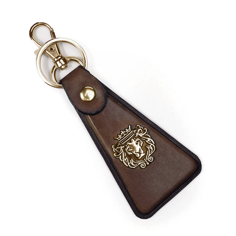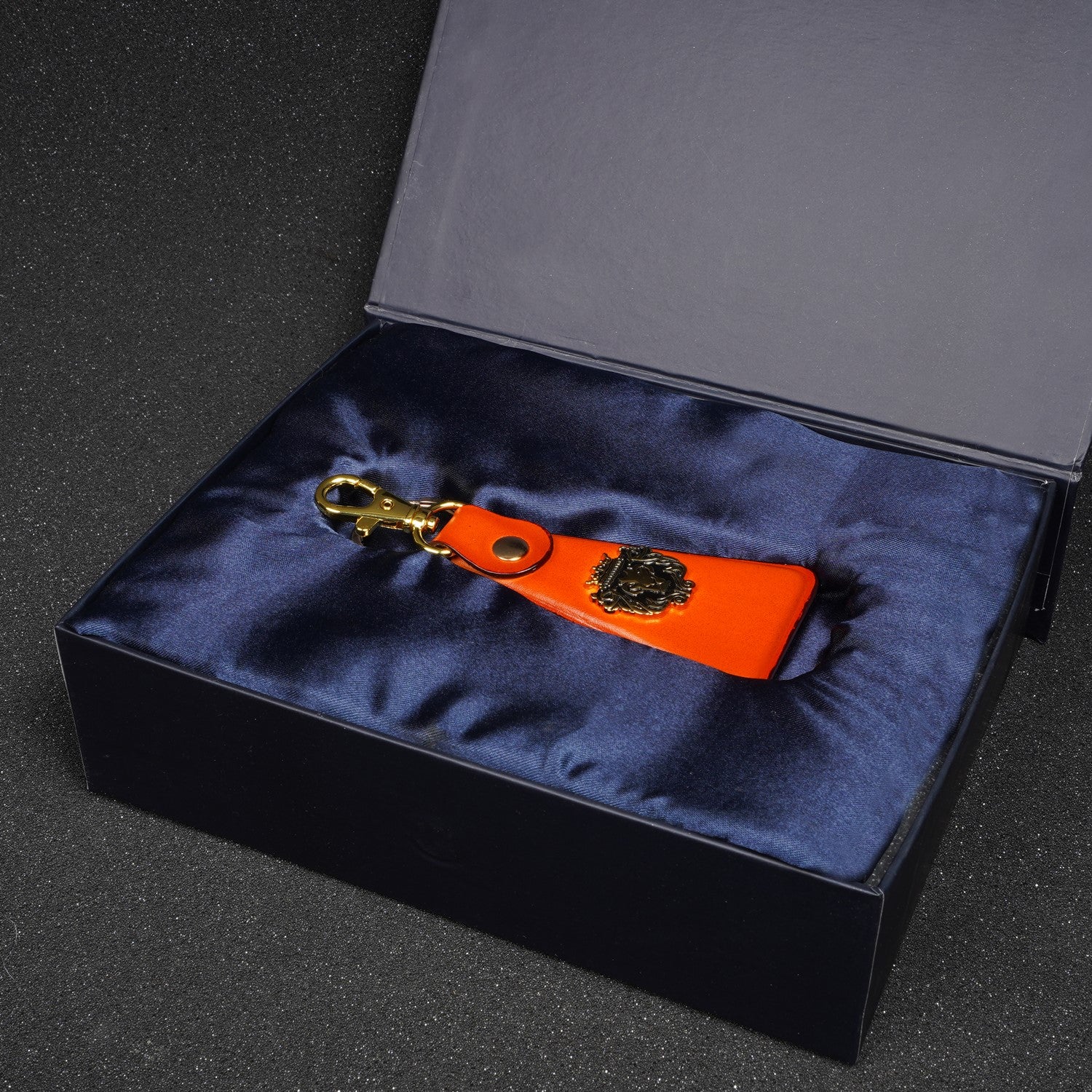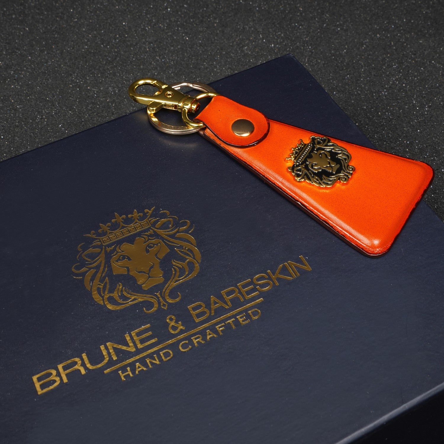 This Orange elegant keychain is a perfect accessory to spell your style statement. The luxurious Orange color on genuine leather enhances its freshness. The golden finish buckled details compliments its overall color. Brune and Bareskin signature metal lion logo on the center looks very chic.