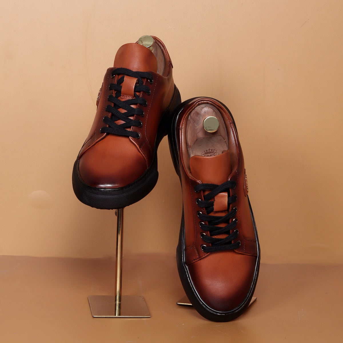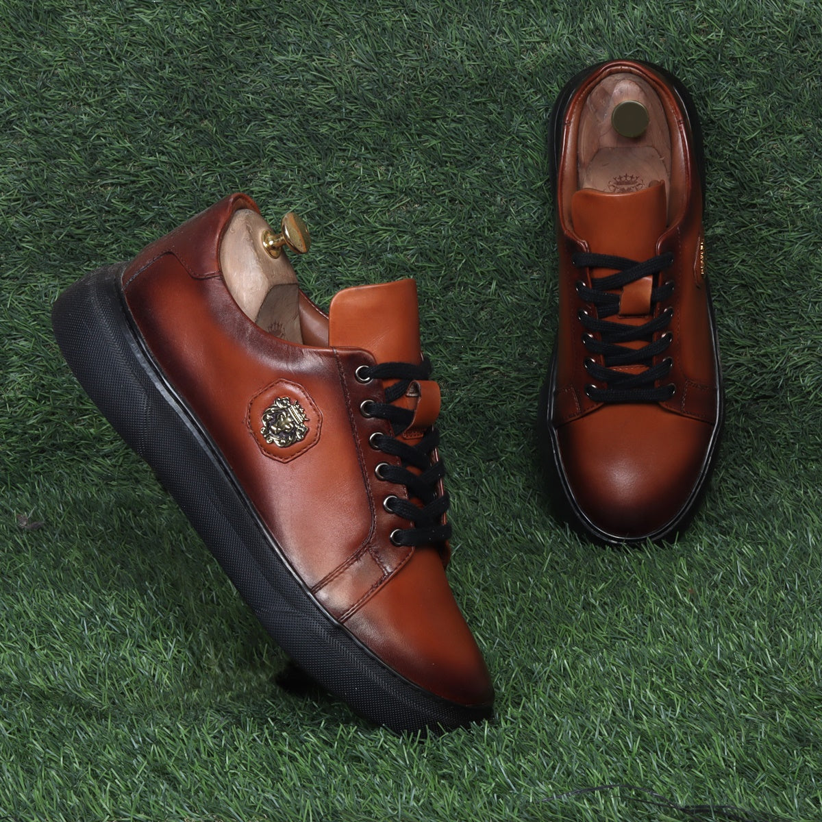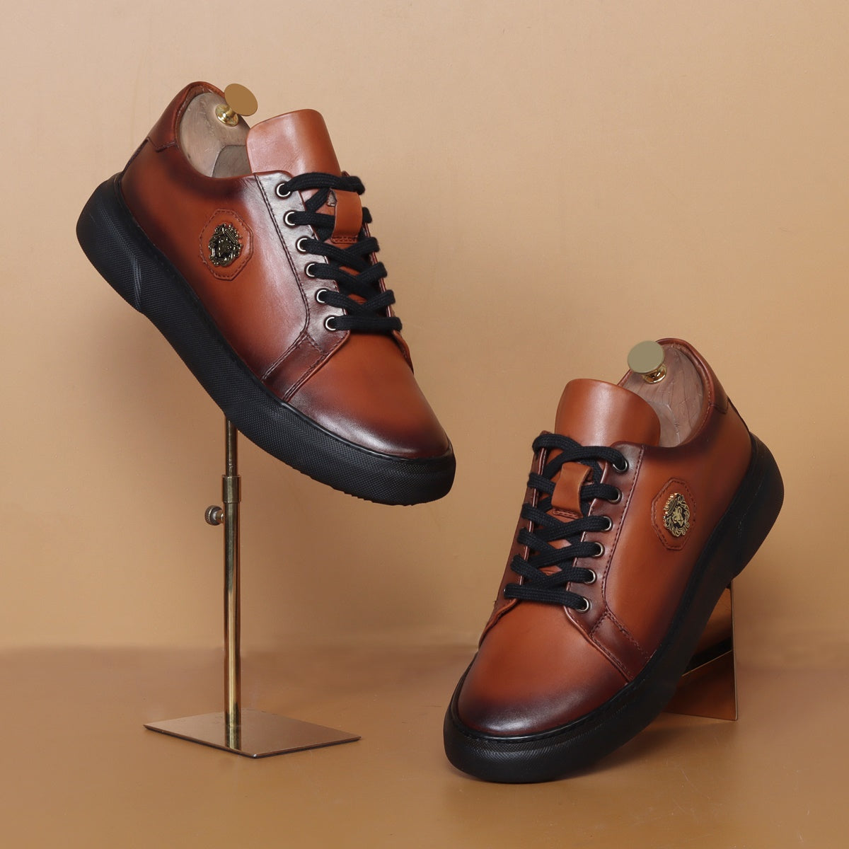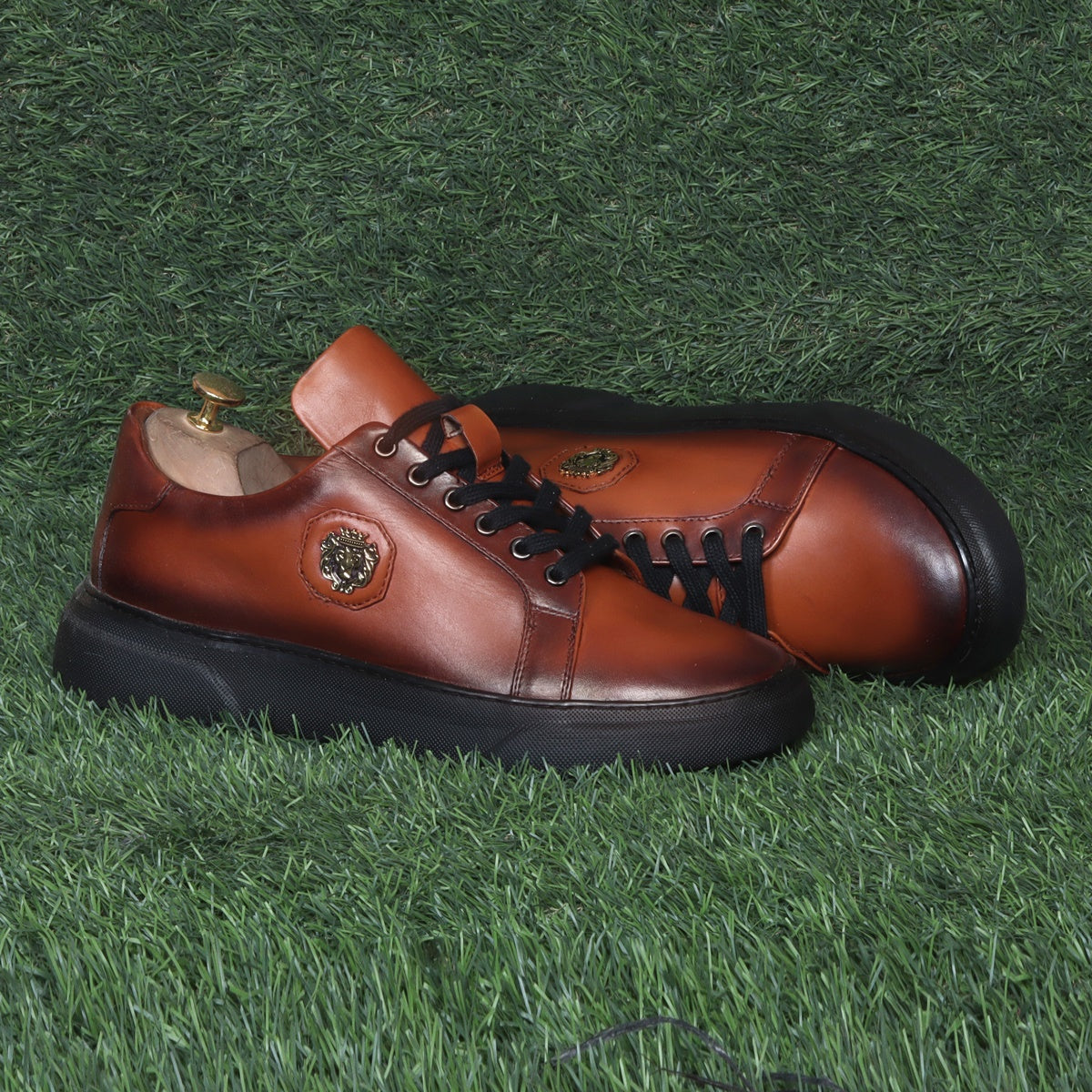 Orangish Tan Leather Lace-up Sneakers with Metal Lion logo on Quarter